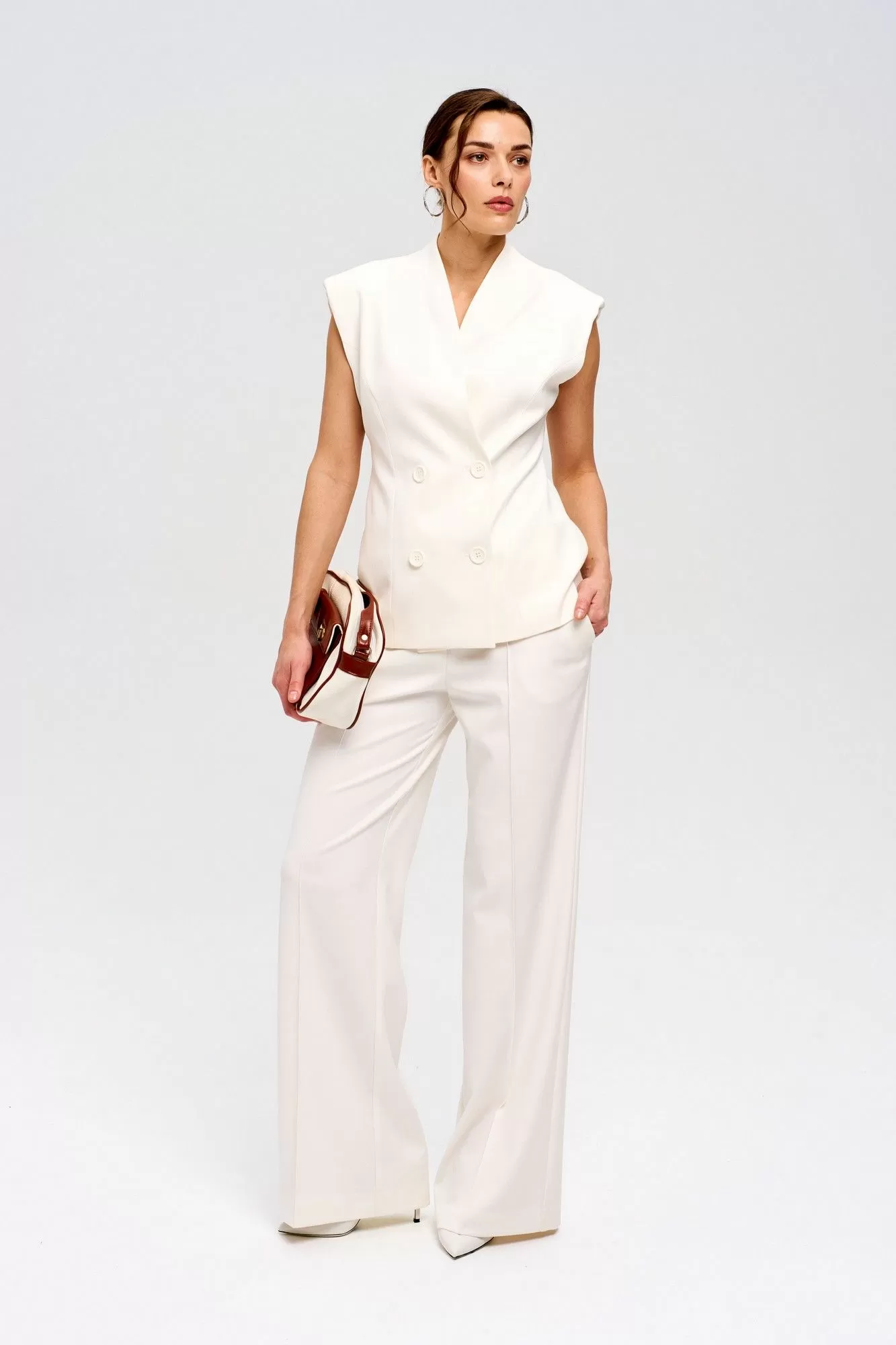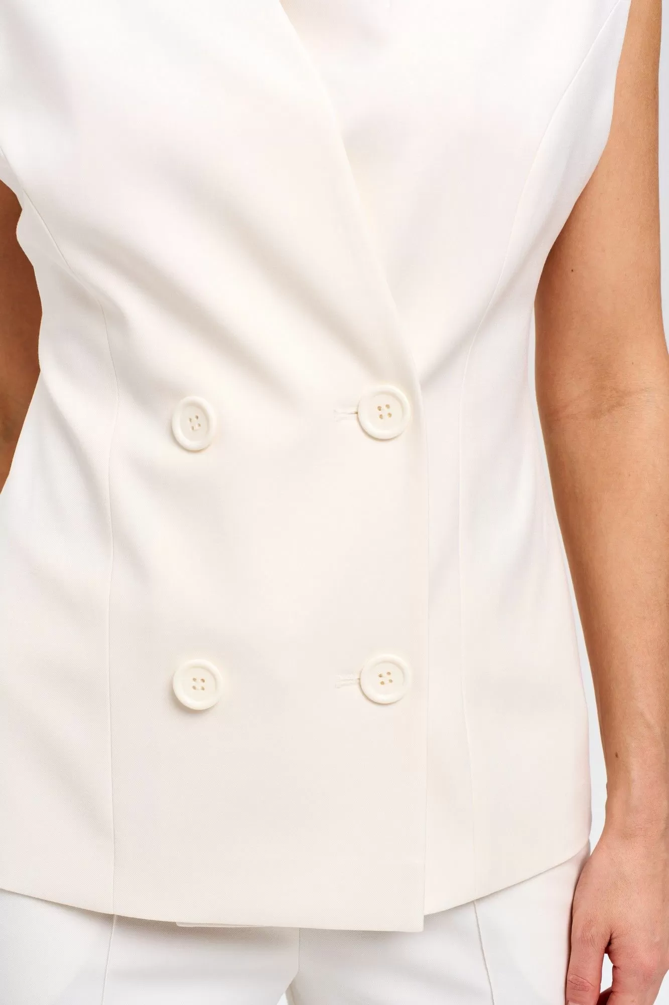 Двубортный жилет со слегка расширенной плечевой линией, которая на контрасте формирует тонкую талию. За счет закрытого силуэта и в меру приталенной посадки жилет комфортно носить как полноценный элемент образа на голое тело. Модель сшита из костюмной ткани, благодаря чему отлично сохраняет форму. Идеально сочетается с брюками из идентичного материала.