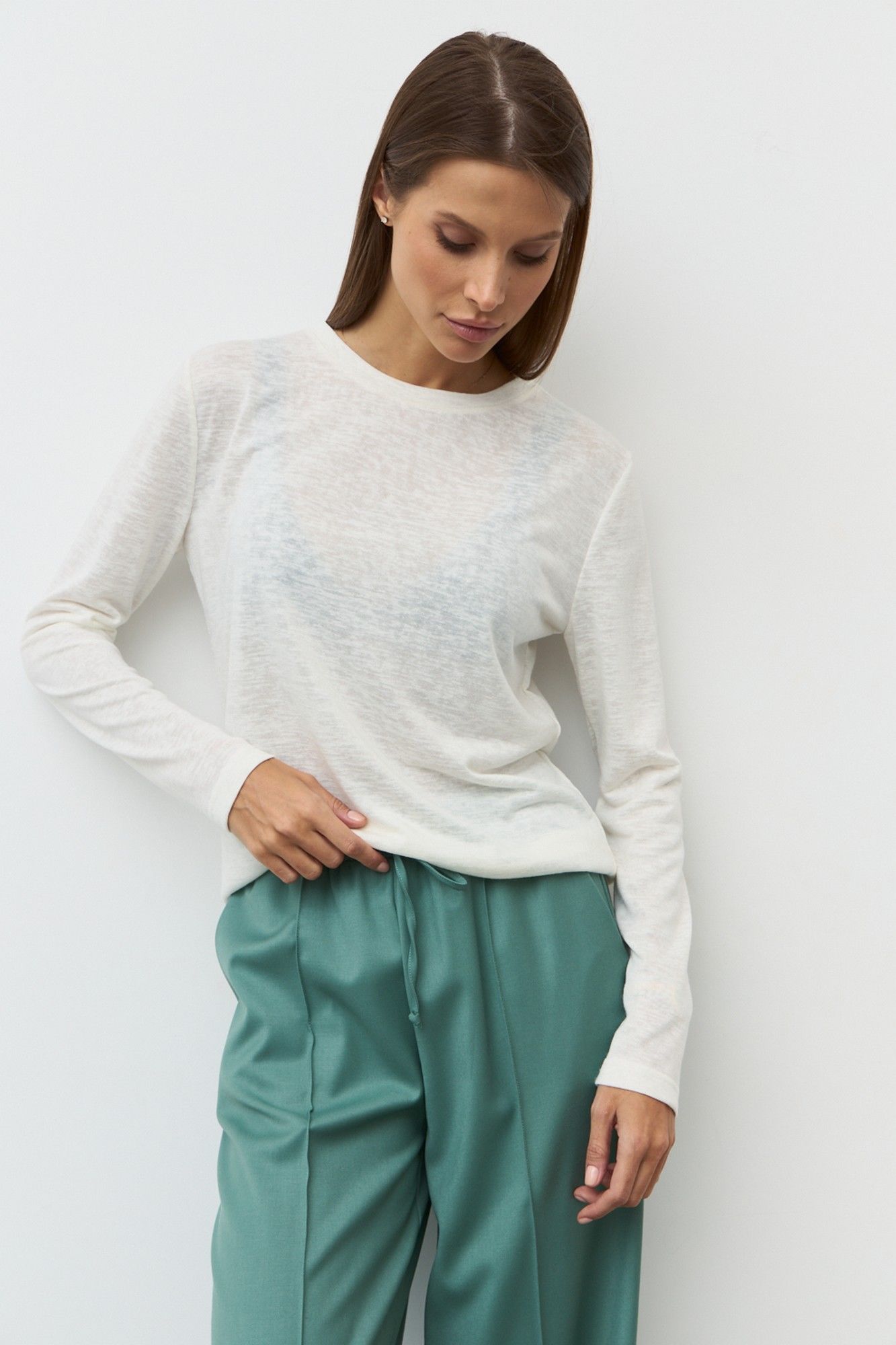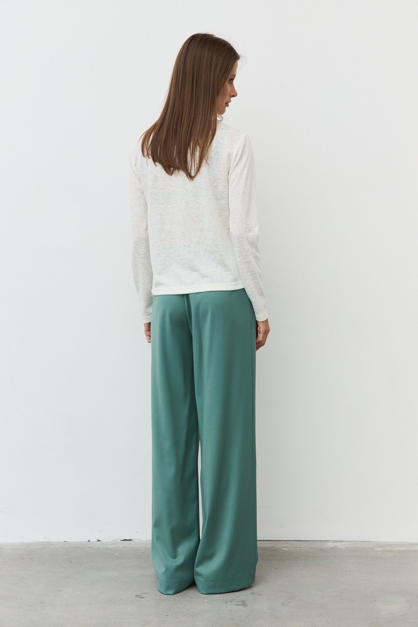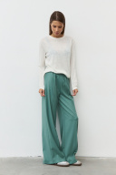 Широкие брюки из гладкой костюмной ткани с отстроченными стрелками по передним деталям. Пояс притачной с эластичной тесьмой и шнурком. В боковых швах обработаны наклонные карманы. Длина изделия по боковому шву 111 см. Длина изделия по шаговому шву 82 см.