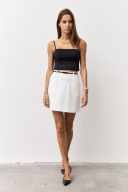 Базовая юбка - мини из гладкой костюмной ткани на подкладке. В боковых швах обработаны наклонные карманы. Застежка на потайную тесьму-молнию в среднем шве спинки. Изделие с вытачками на притачном поясе со шлевками. Длина изделия 42 см.