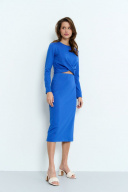 Трикотажный костюм состоящий из джемпера и юбки. Укороченный трикотажный джемпер с акцентом на талии в виде узла. Длина изделия 40 см. Длина рукава 61,5 см. Юбка-карандаш с разрезом в среднем шве спинке. Обтачка юбки на широкой эластичной тесьме. Длина изделия 76 см