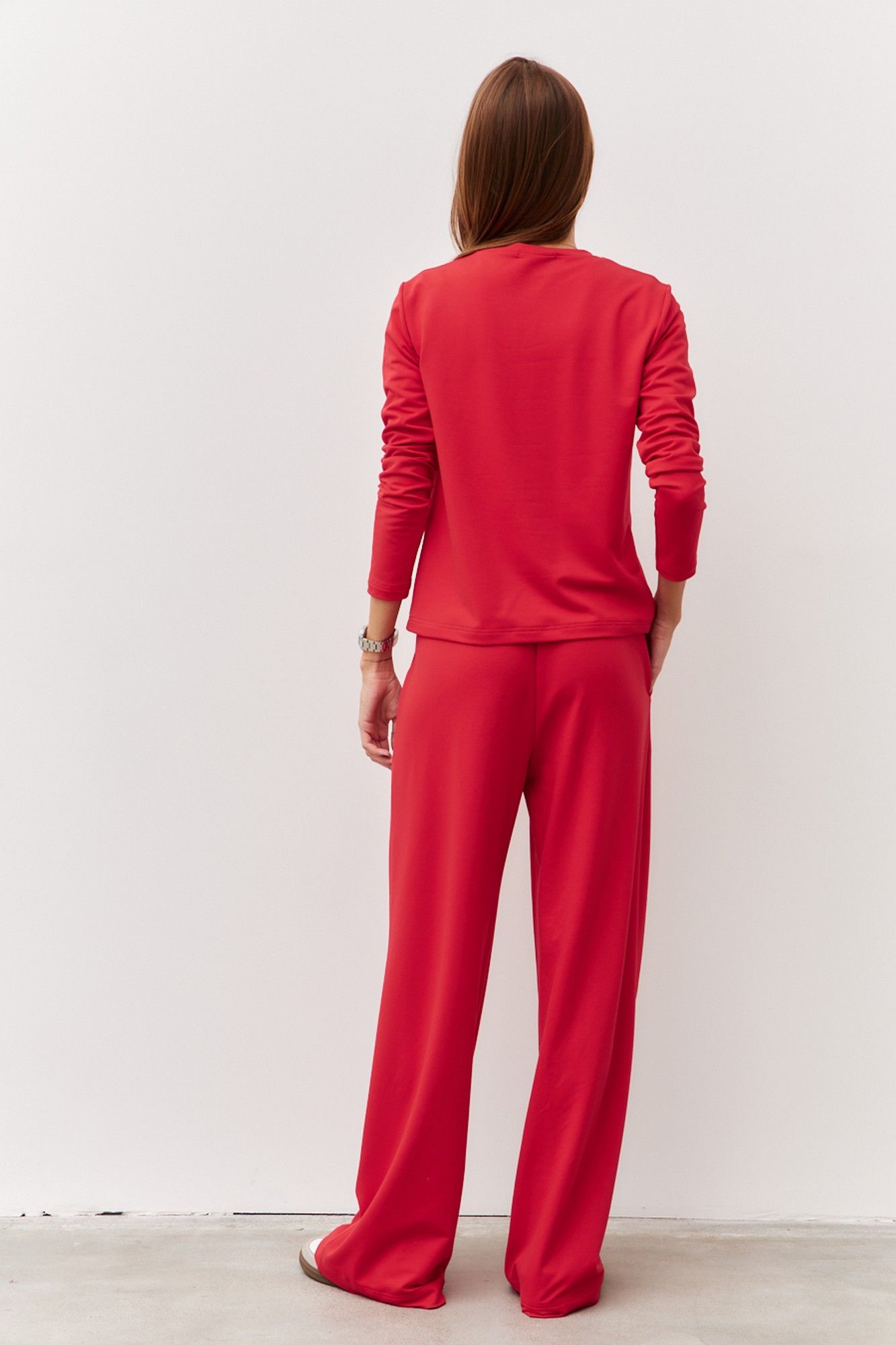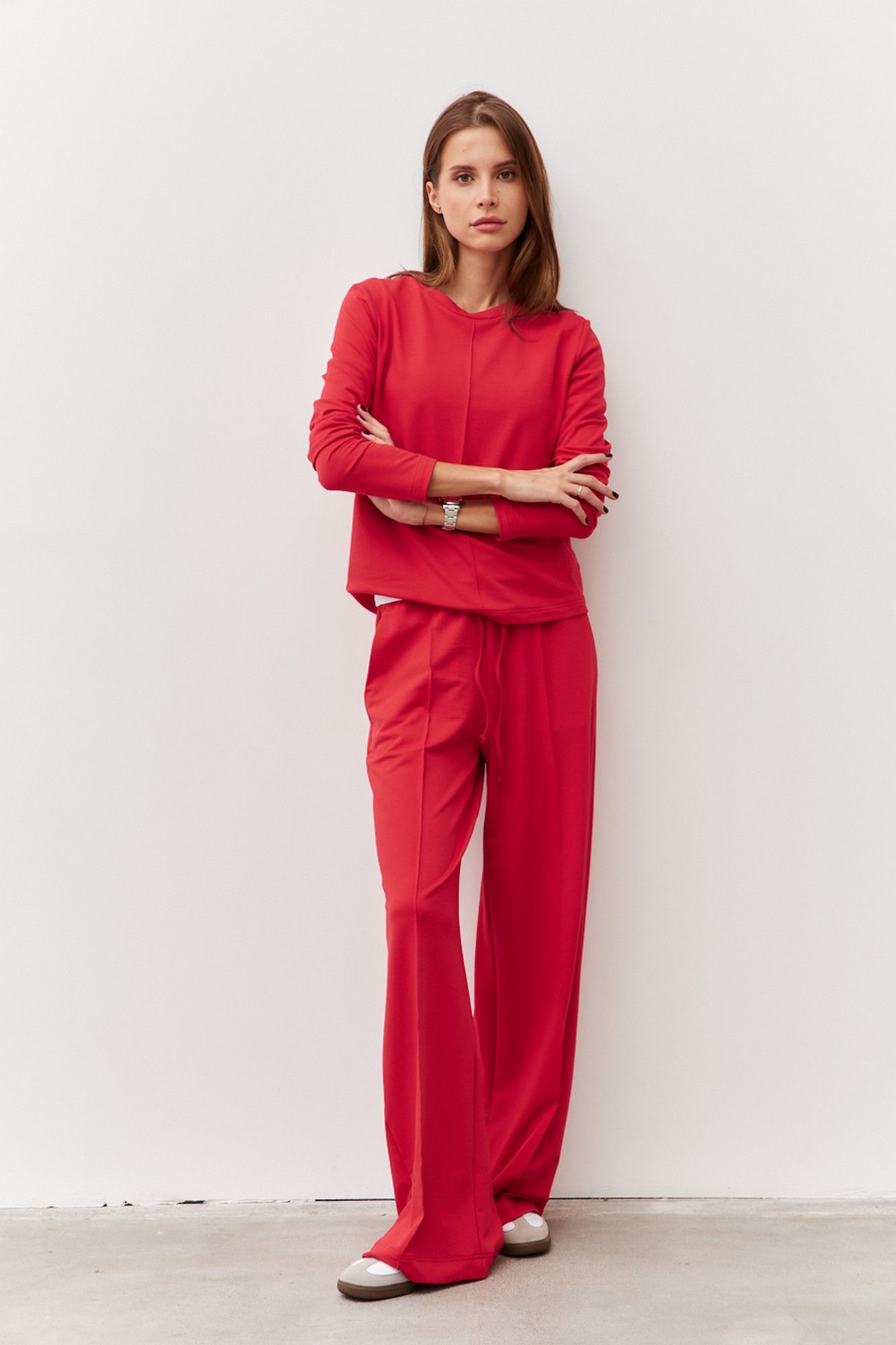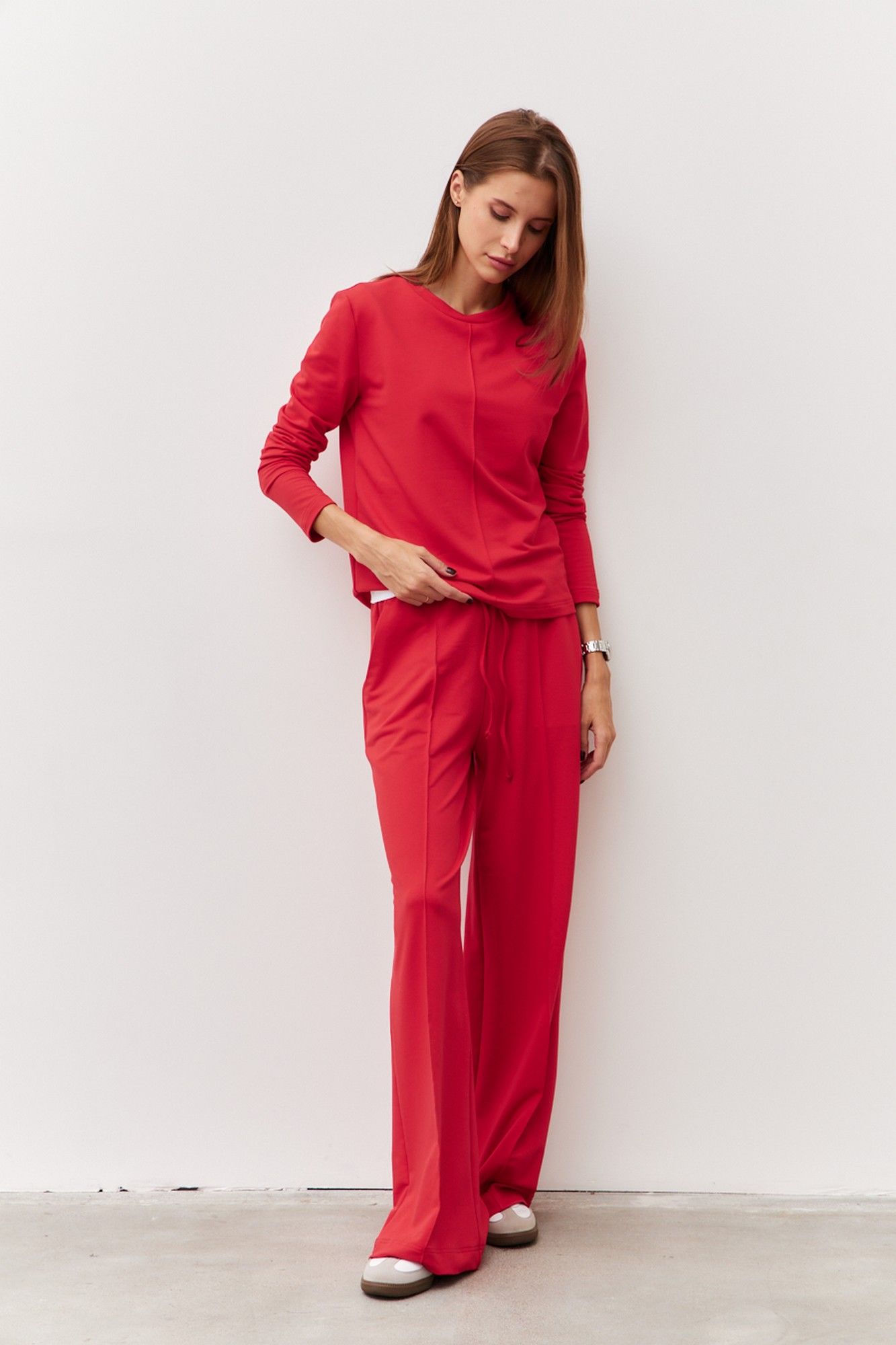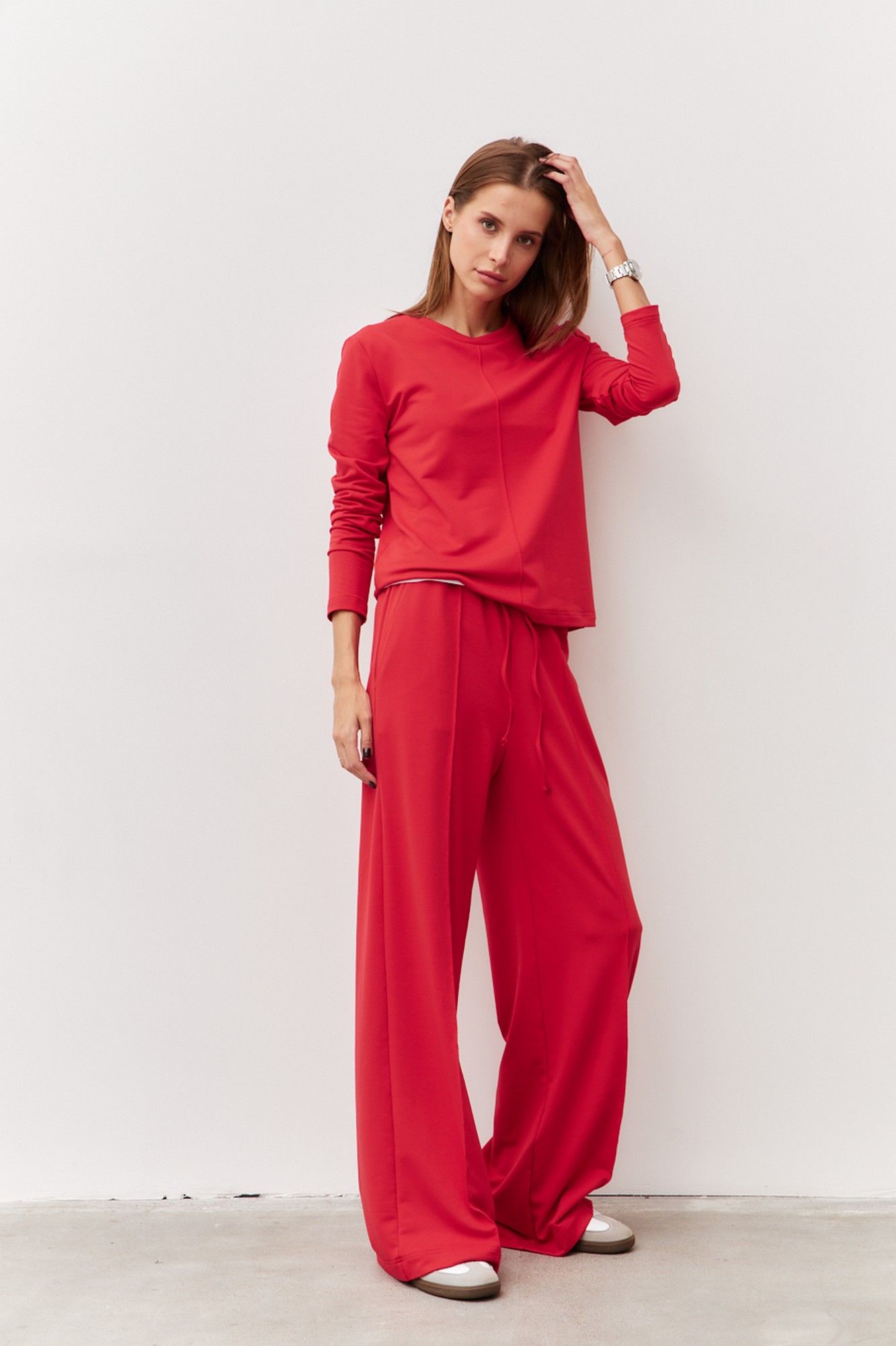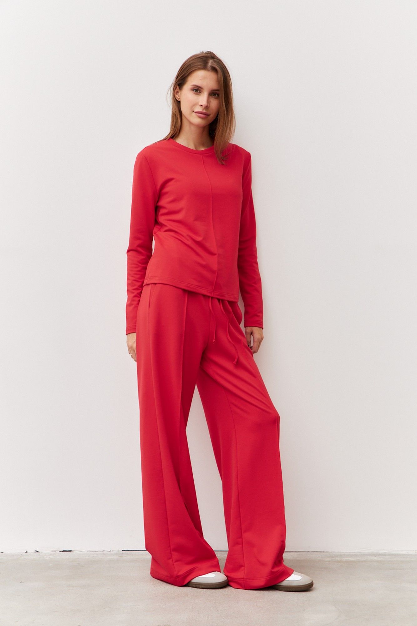 Трикотажный костюм из двухнитки состоящий из джемпера и брюк. Широкие брюки с отстроченными стрелками по передним деталям. Пояс притачной с эластичной тесьмой и шнурком. В боковых швах обработаны наклонные карманы. Длина изделия по боковому шву 111 см. Длина изделия по шаговому шву 82 см. Джемпер прямого силуэта с круглой горловиной. Передняя деталь с отстроченым кантом по центру изделия. Длина изделия 56 см. Длина рукава 59 см.