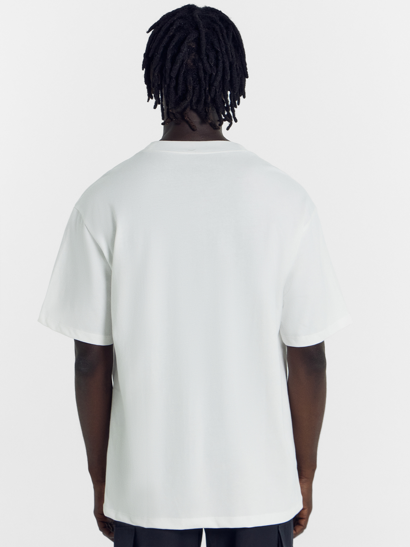 Футболка мужская из кулирного полотна. Силуэт прямой, свободный. Длина до середины бедер. Спинка и перед цельнокроенные. Круглая горловина, плотно прилегающая к шее, обработана притачной обтачкой из рибаны, шов соединения расстрочен Линия плеча немного спущена. Рукава короткие, втачные. Нижние срезы футболки и рукавов обработаны швом в подгибку на плоскошовной машине.