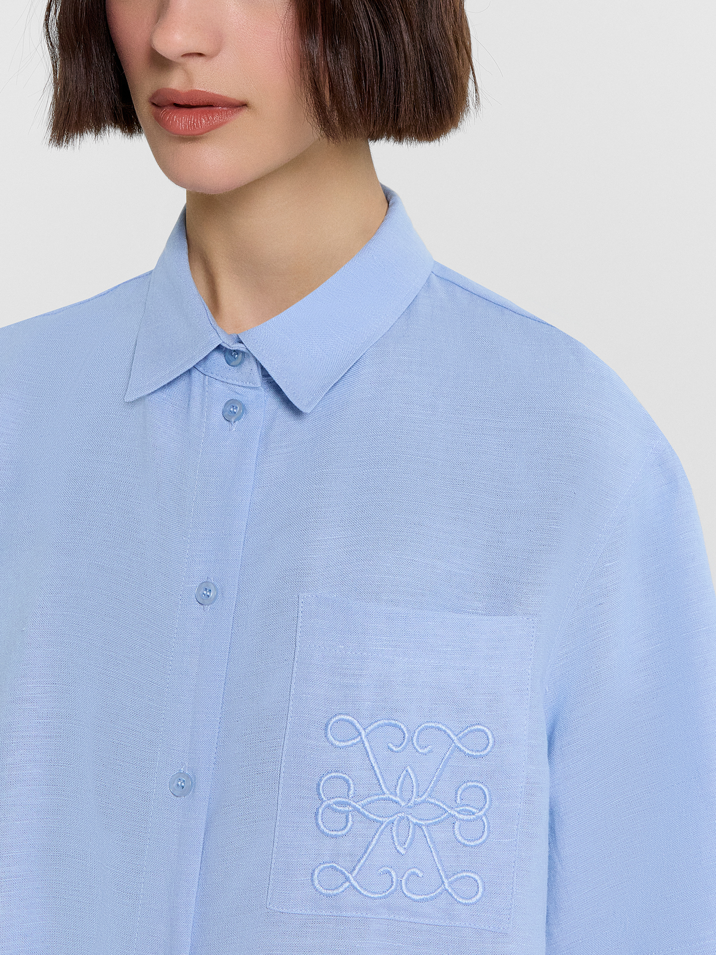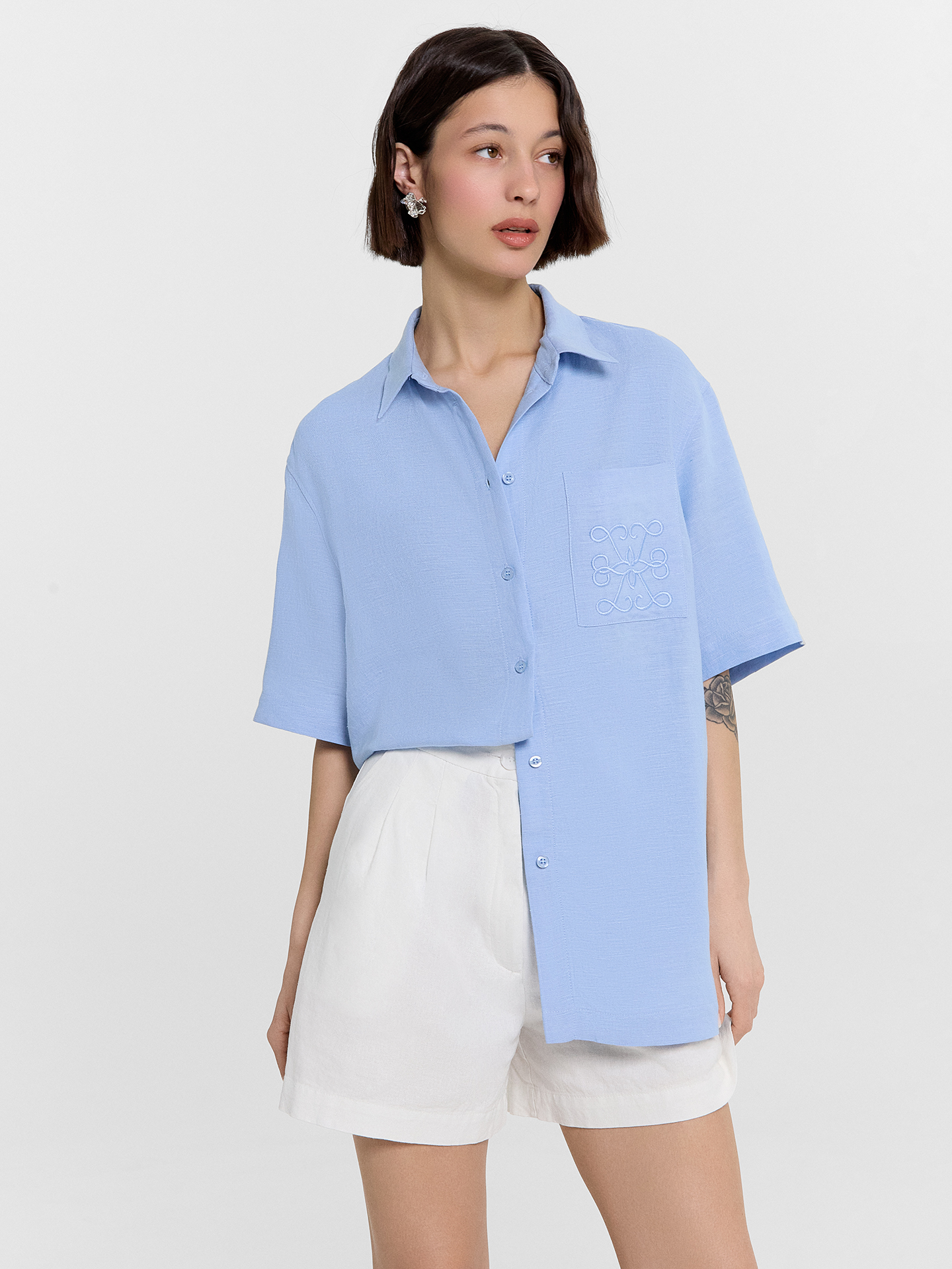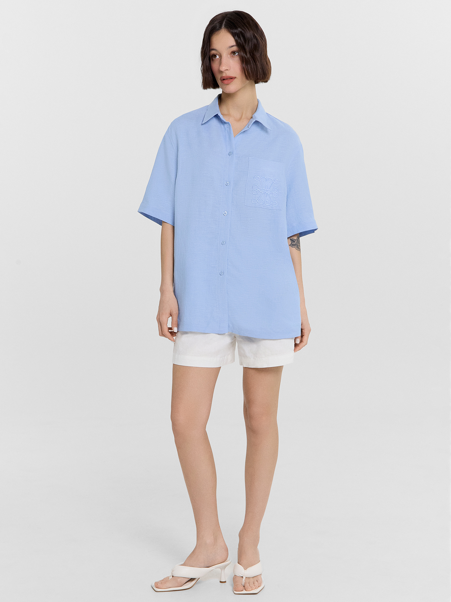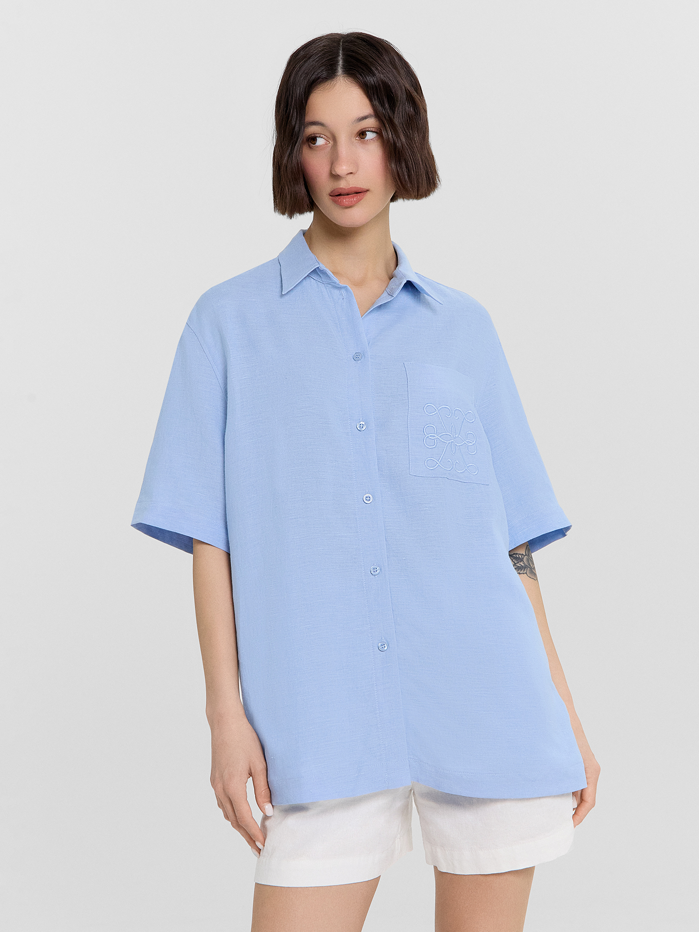 Блузка женская свободного силуэта из ткани. Блузка с цельнокроеной планкой и центральной застежкой на пуговицы. На левой детали переда накладной карман. Горловина круглой формы с рубашечным воротником. Плечо спущено, пройма углублена. Рукав втачной,короткий. Низ рубашки прямой.
