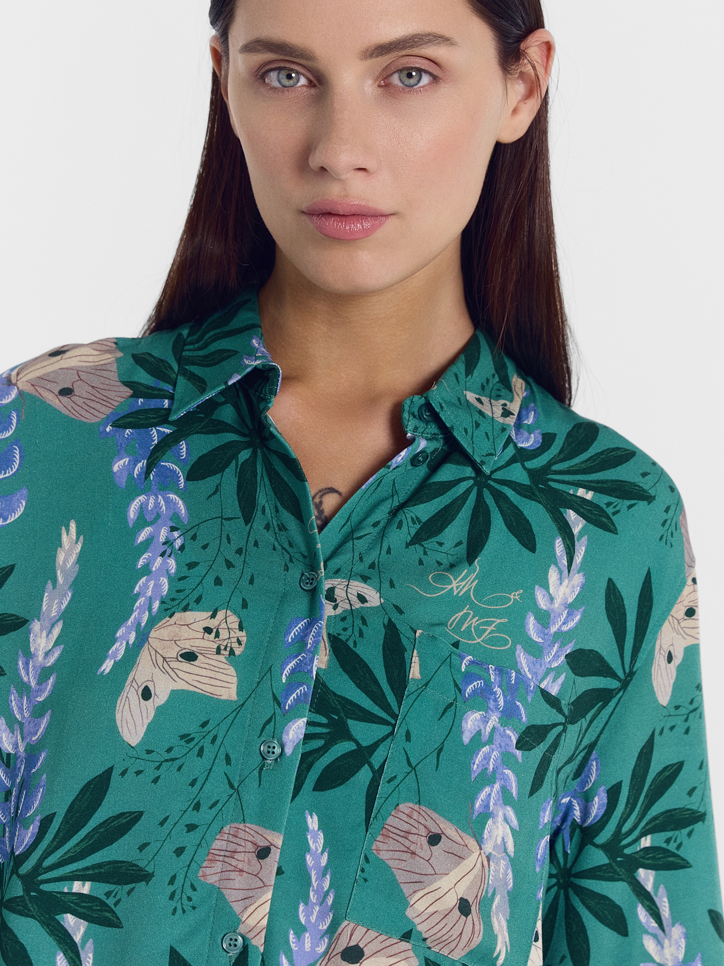 Стильная блуза женская из 100% вискозы. Оверсайз модель с центральной застежкой на пуговицы. На левой детали переда выполнен накладной карман. Горловина круглой формы с рубашечным воротником. Плечо спущено, пройма углублена. Рукав втачной, короткий.Низ блузы прямой. Комфортный лаконичный вариант на каждый день для работы, учебы и повседневных дел. Дополнить можно низом из этой же или другой коллекции на свой вкус. Широкий размерный ряд. Рекомендуем для создания гармоничных casual аутфитов в жаркий сезон года!
