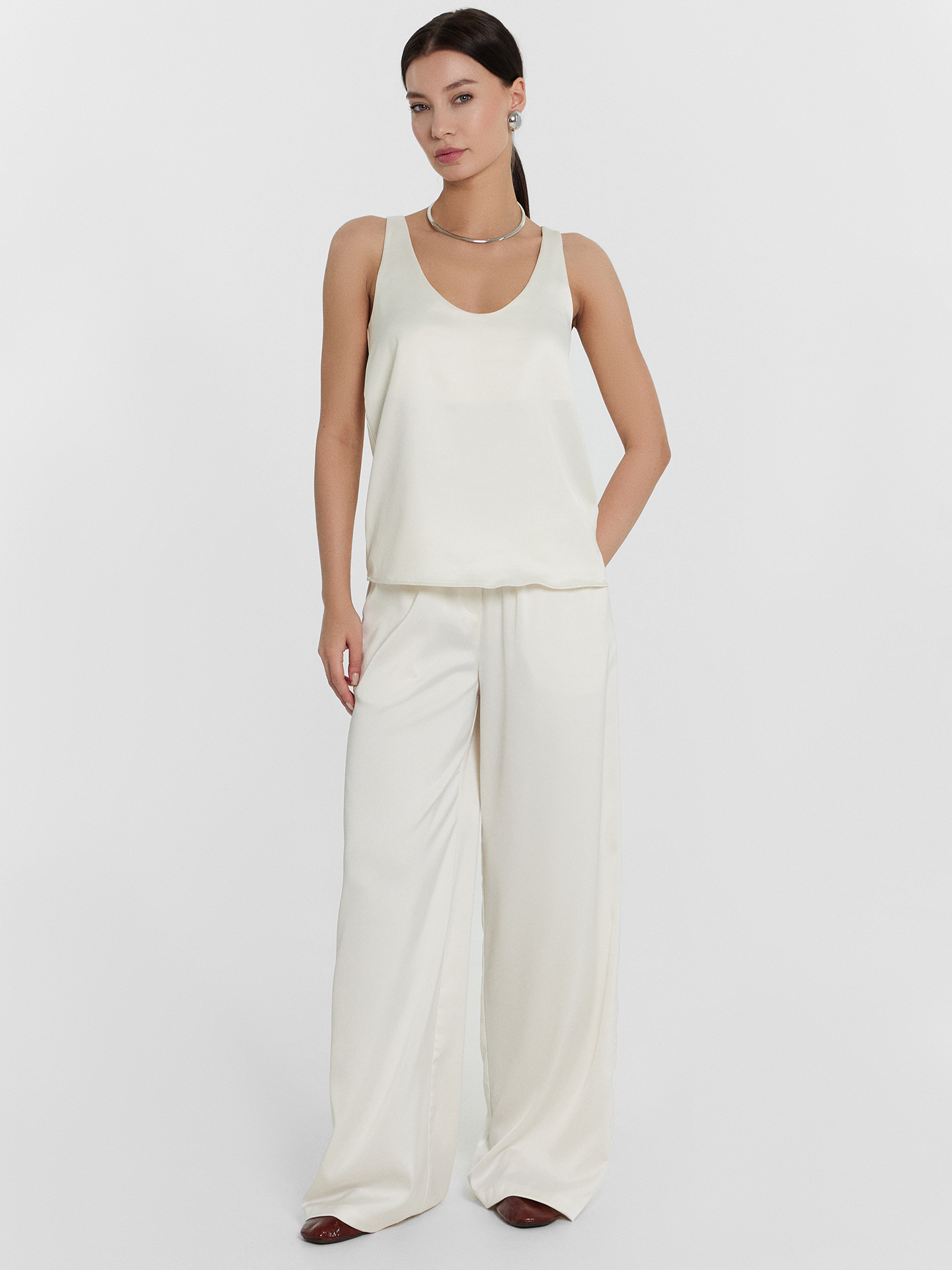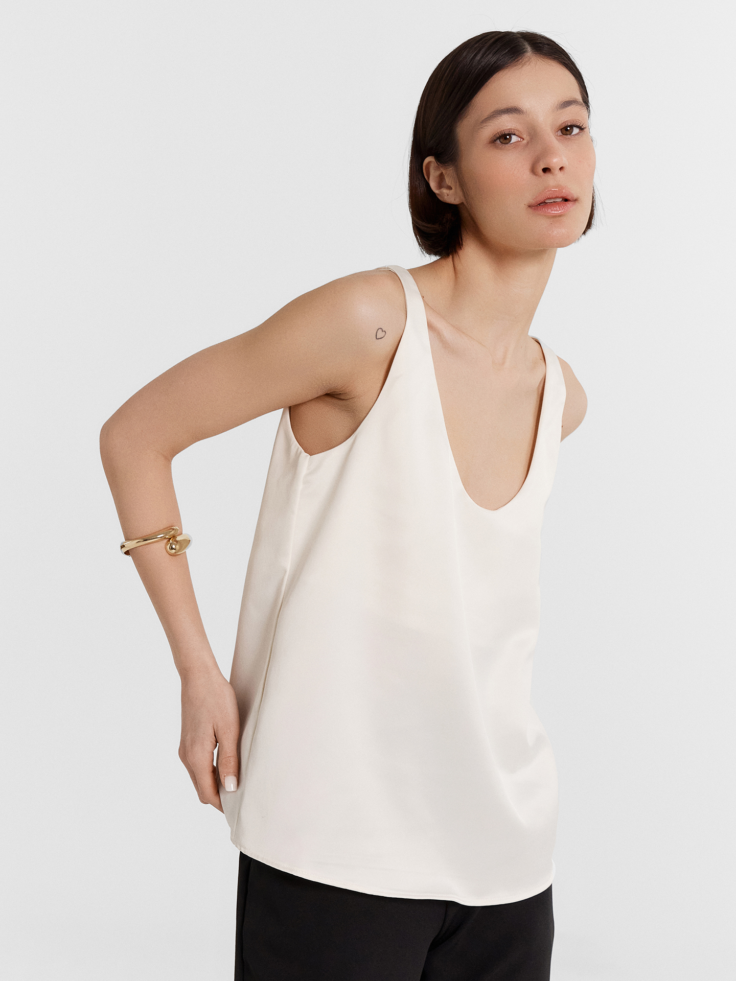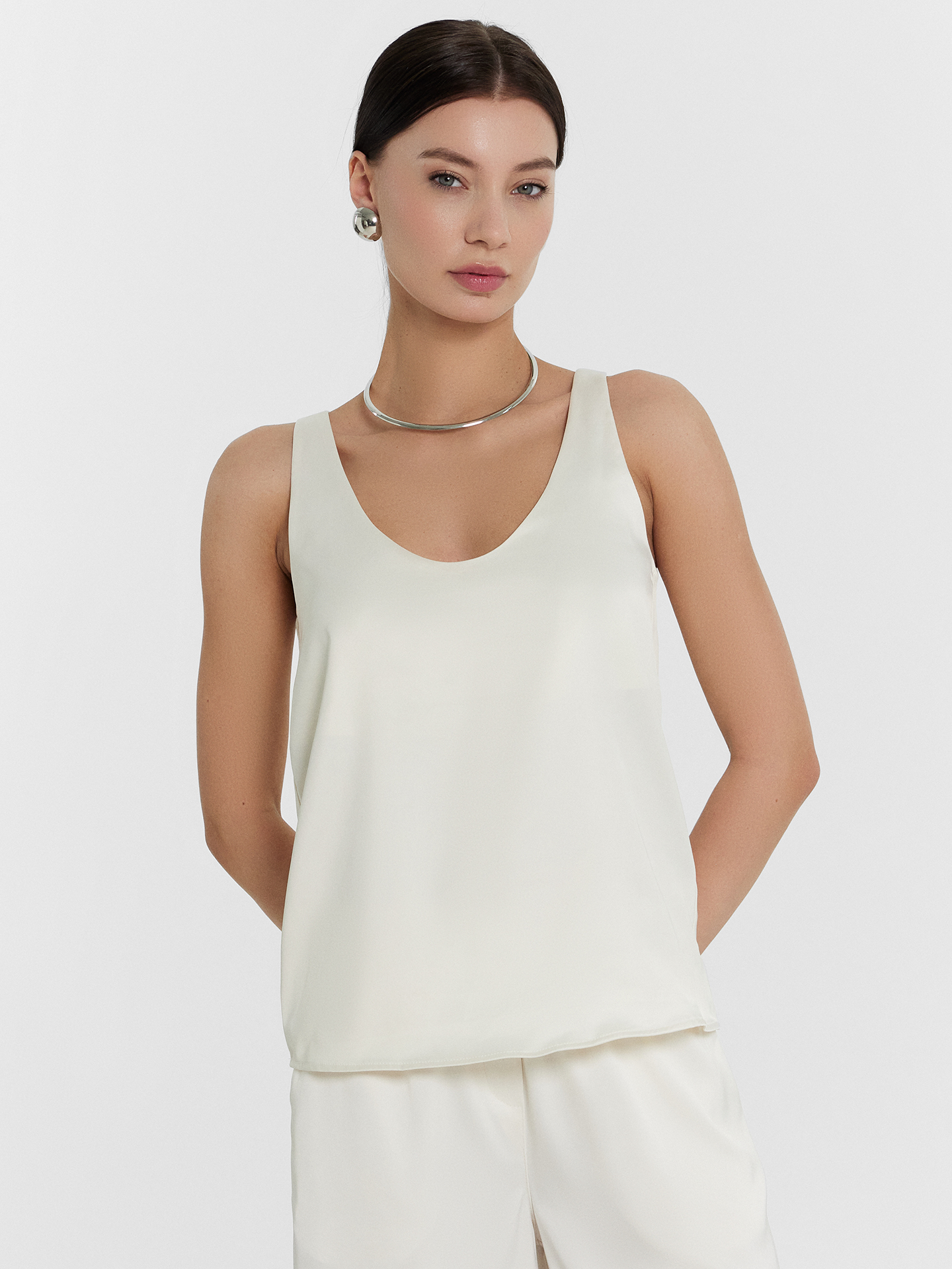 Элегантная блуза на узких бретелях – идеальный выбор для создания стильного и изысканного образа. Прямой, свободный силуэт и V-образная горловина придают модели утончённость и шарм. Перед и спинка на подкладке из основного материала обеспечивают комфорт и дополнительную плотность, а нижние срезы аккуратно обработаны швом вподгибку, что придаёт изделию завершённый вид. Блуза выполнена из прочного и приятного к телу струящегося материала, который красиво подчеркивает изящные линии фигуры. Этот материал не только отлично смотрится, но и дарит ощущение нежности и лёгкости при каждом движении. Такая блуза станет отличным дополнением вашего гардероба, подходящим как для повседневных образов, так и для особых случаев.