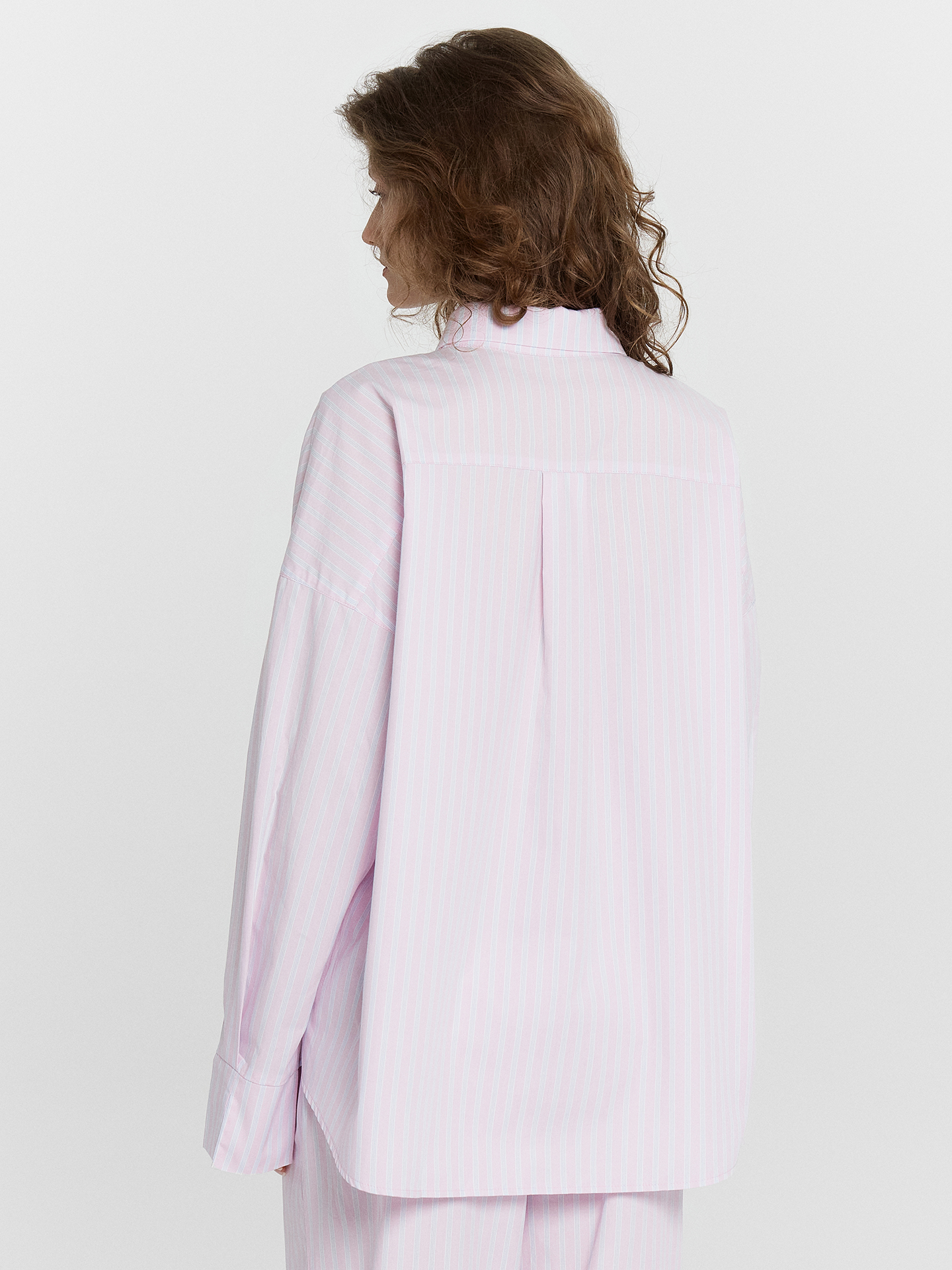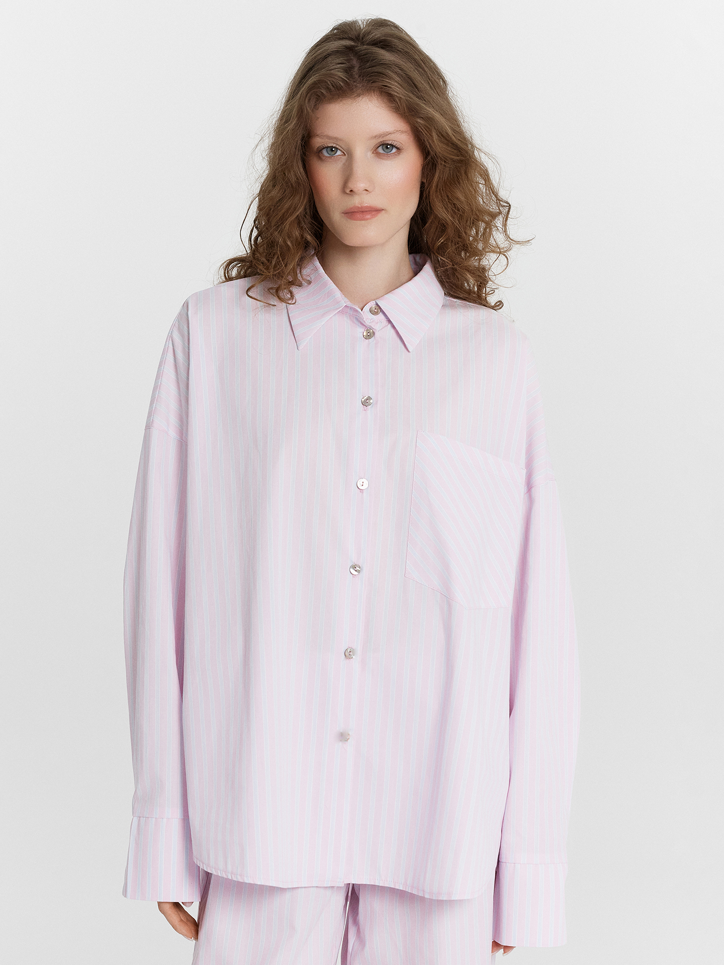 Блузка женская свободного силуэта из ткани. Горловина круглой формы, в горловину втачан воротник с отрезной стойкой из основной ткани. Плечо спущено, пройма углублена. По пройме проложена отделочная строчка. Рукав втачной, длинный, со одностореней складкой по низу. По низу рукава отрезная манжета из основной ткани с разрезом. По переду центарльная застежкана на пуговицы 10мм. На левой передней детали накладной карман. Спинка с отрезной кокеткой и складкой по центру. Низ блузки фигурный.