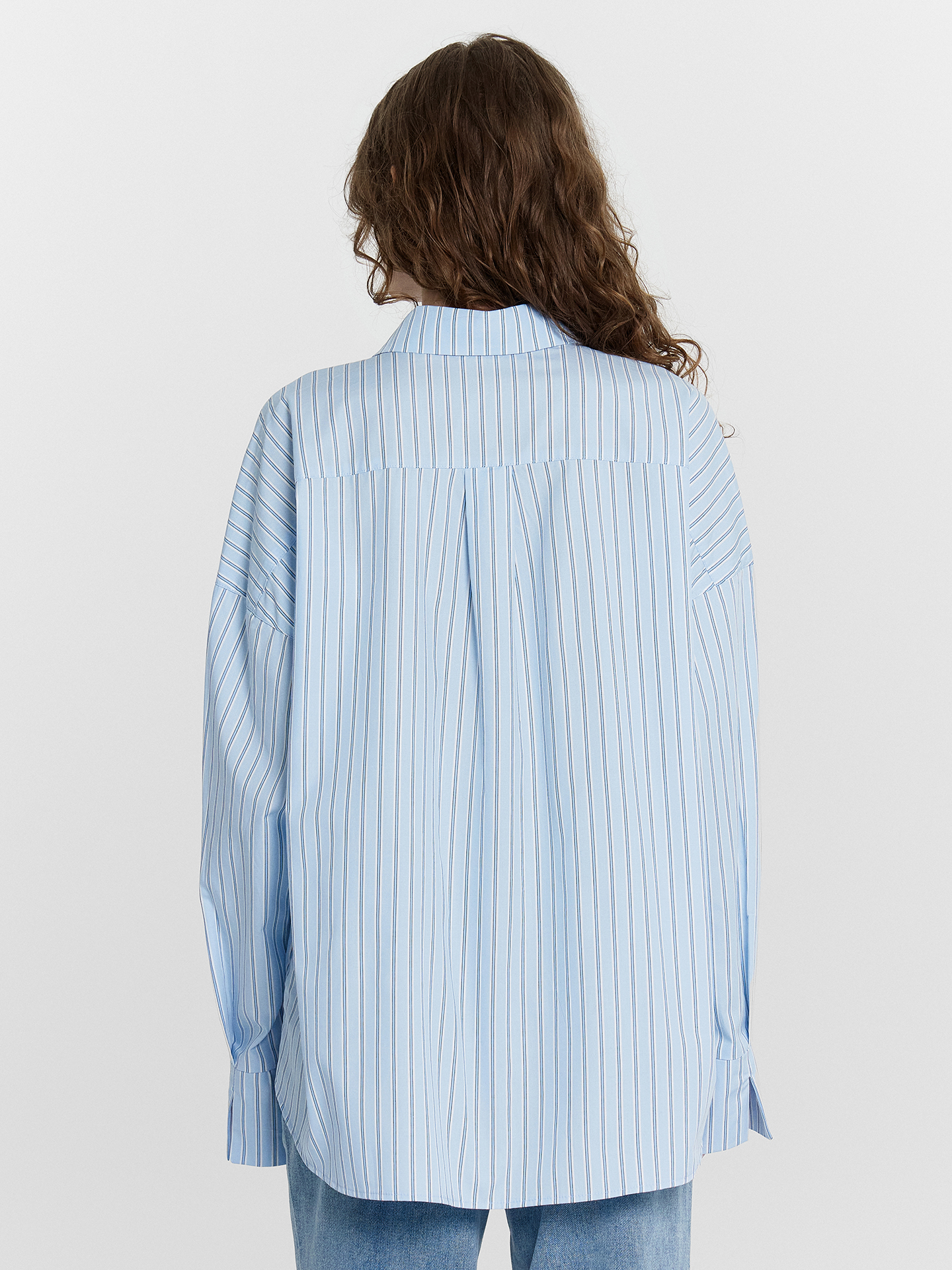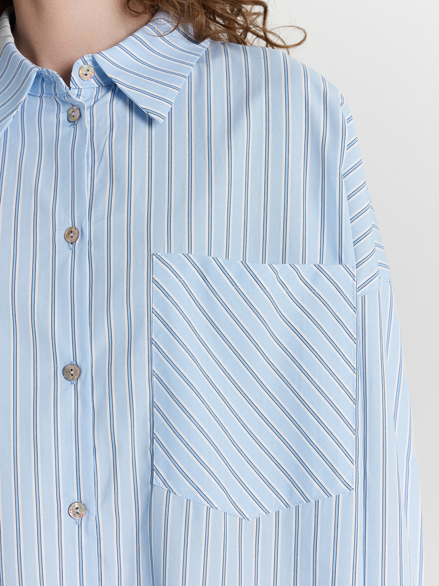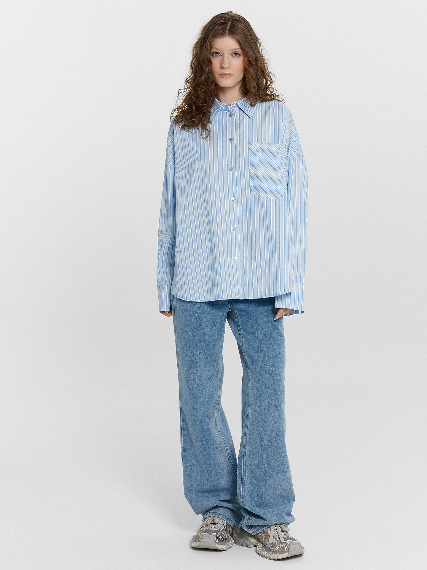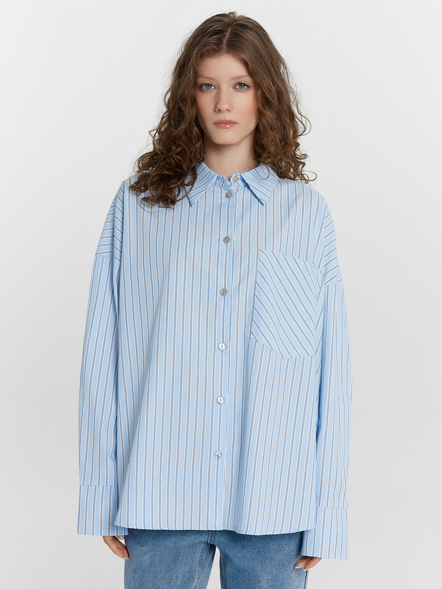 Блузка женская свободного силуэта из ткани. Горловина круглой формы, в горловину втачан воротник с отрезной стойкой из основной ткани. Плечо спущено, пройма углублена. По пройме проложена отделочная строчка. Рукав втачной, длинный, со одностореней складкой по низу. По низу рукава отрезная манжета из основной ткани с разрезом. По переду центарльная застежкана на пуговицы 10мм. На левой передней детали накладной карман. Спинка с отрезной кокеткой и складкой по центру. Низ блузки фигурный.
