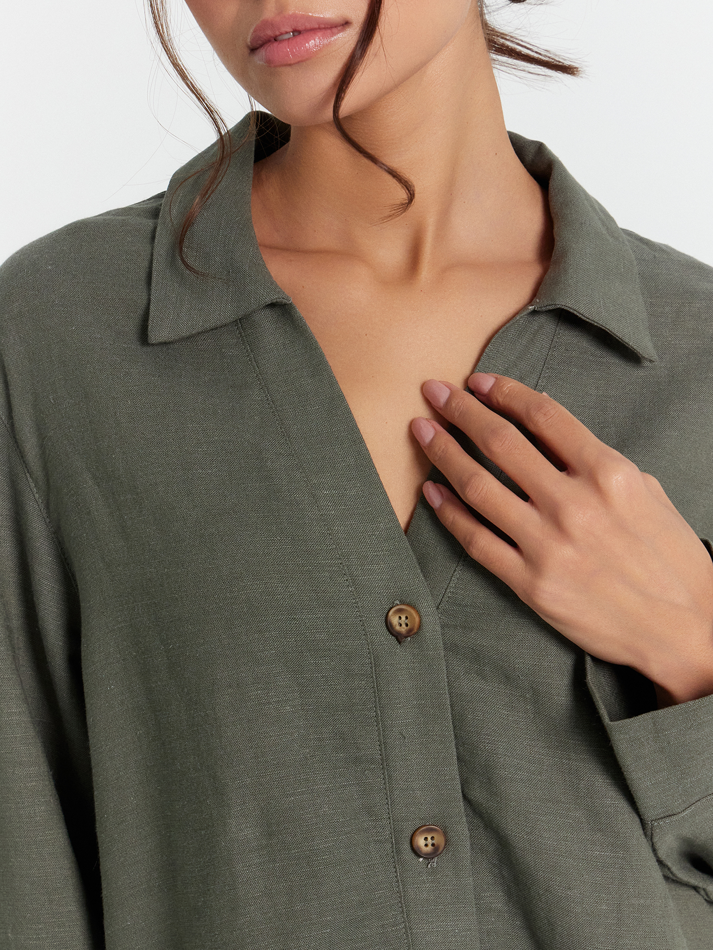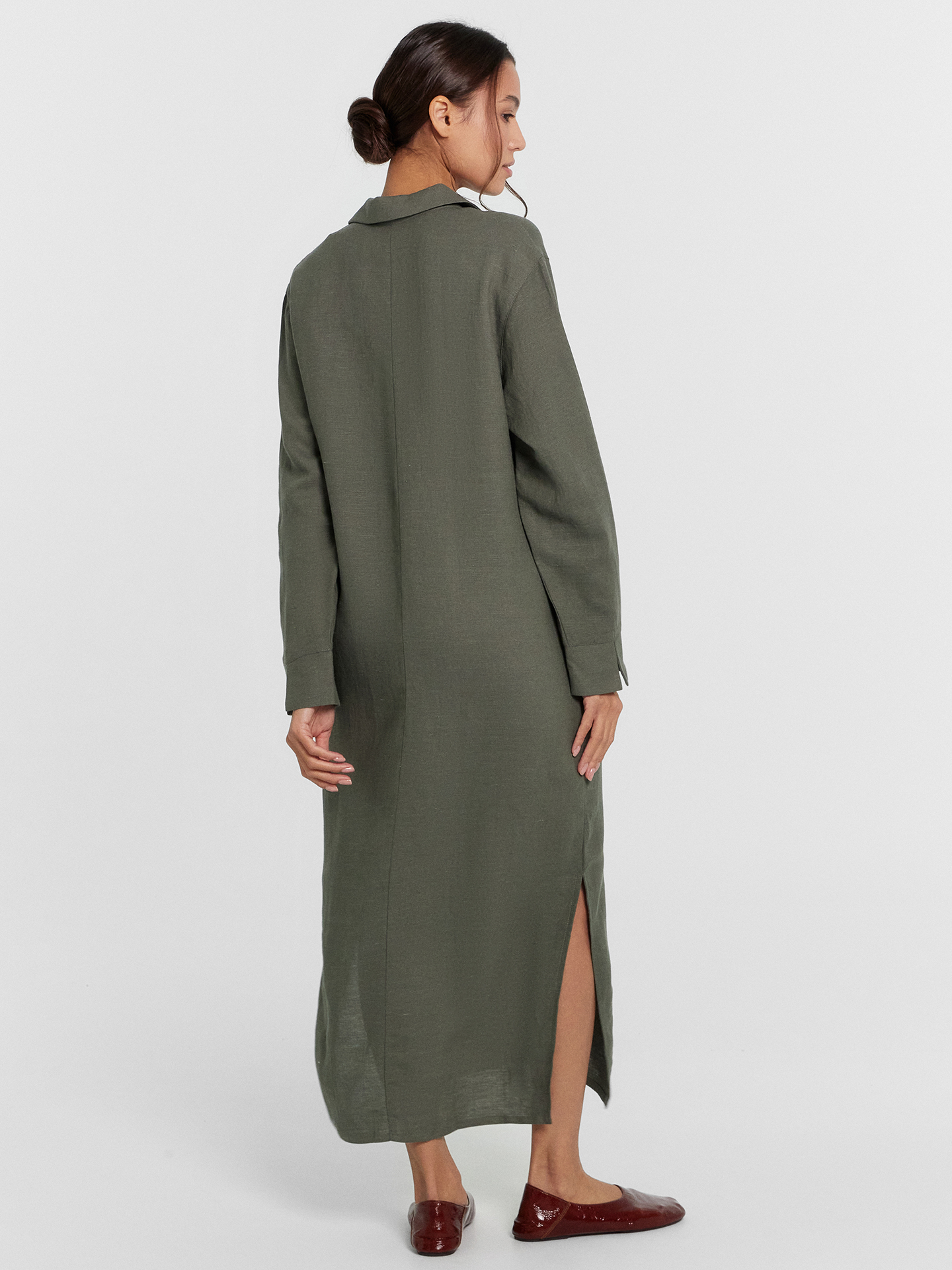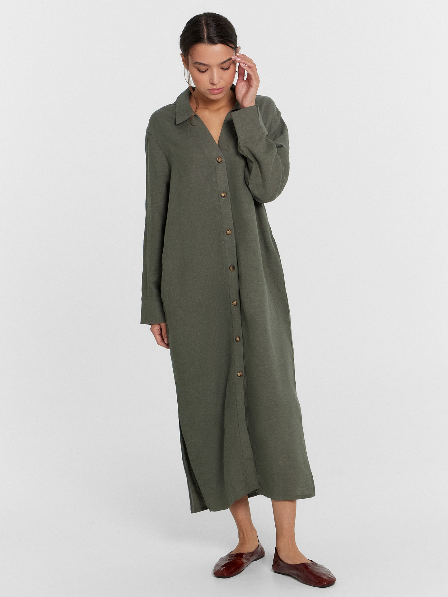 Познакомьтесь с нашим стильным и удобным миди платьем прямого кроя из натурального льна, которое станет незаменимым элементом Вашего гардероба. Эта модель отличается своей элегантностью и функциональностью, идеально подходя как для повседневных образов, так и для особых случаев. Это платье выполнено с V-образной горловиной и стояче-отложным воротником, что придает ему особый шарм и утонченность. Слегка спущенное плечо и длинные рукава с манжетами обеспечивают комфорт и стильный вид, а застежкана петли и пуговицы добавляет удобства и изысканности. Это платье прекрасно сочетается с различными аксессуарами и обувью, создавая разнообразные образы для любого случая.