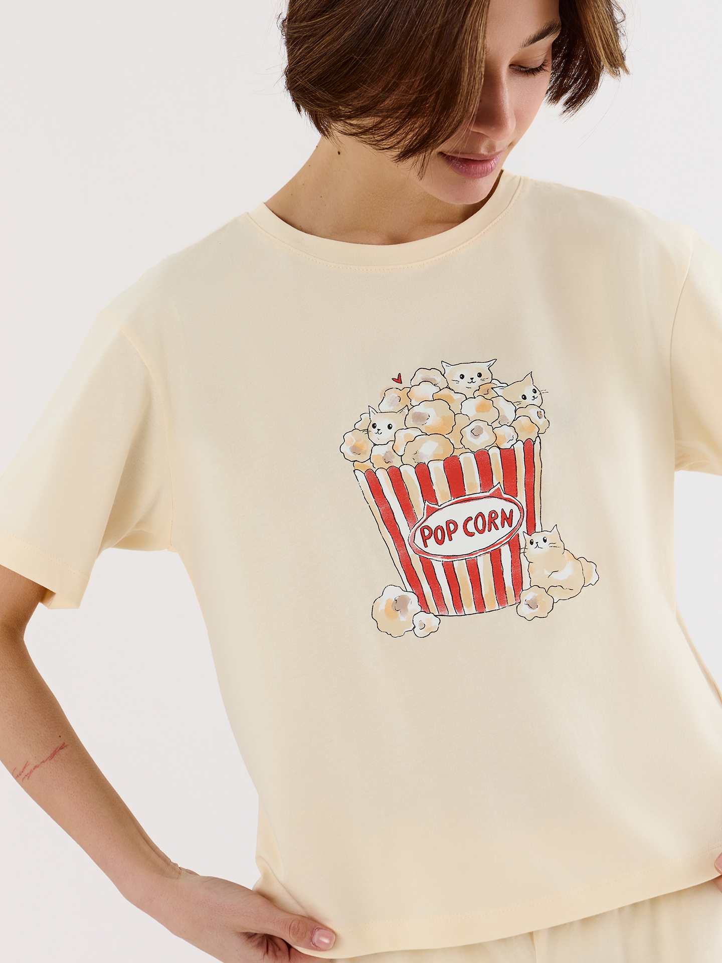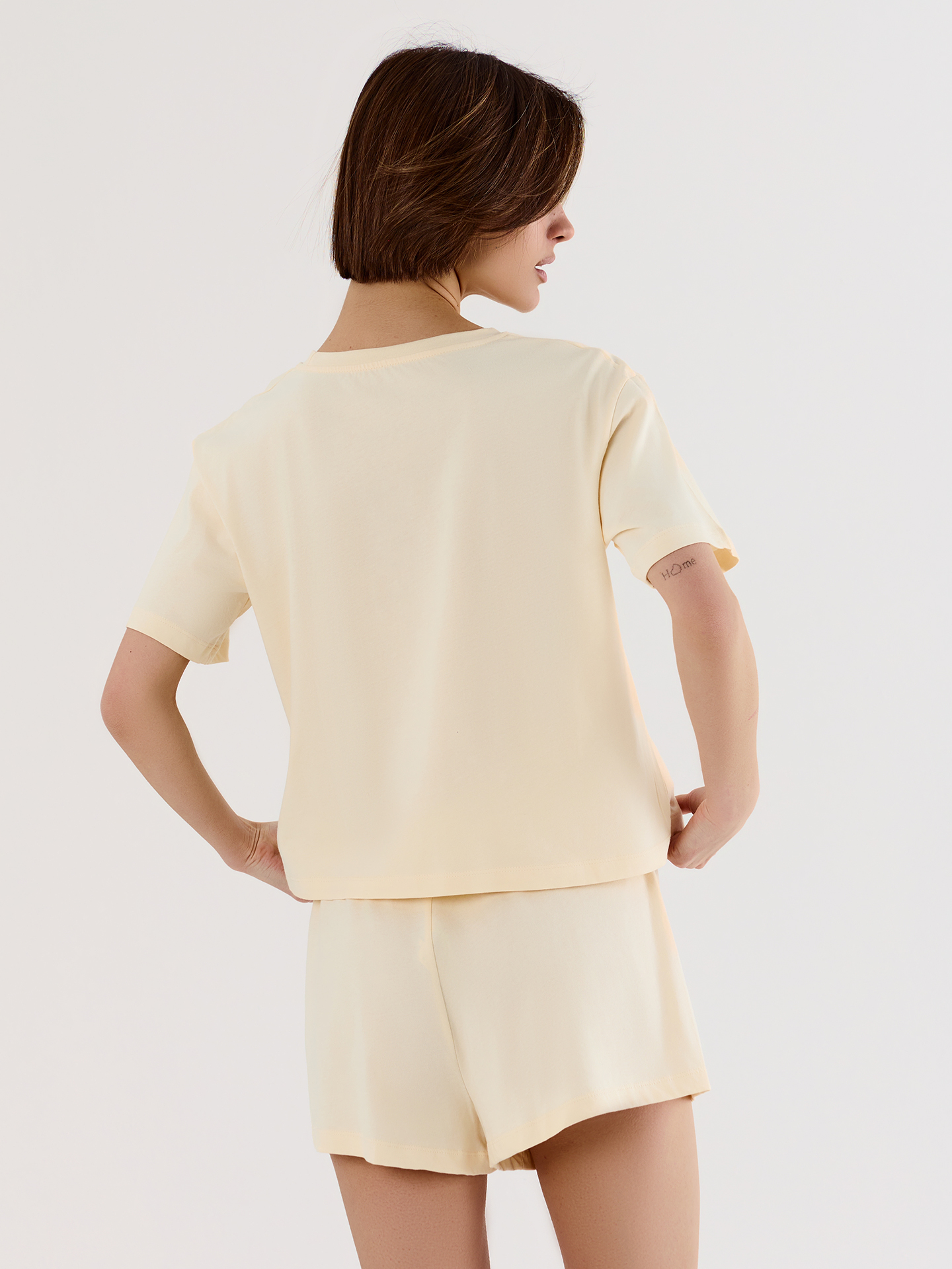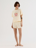 Футболка свободного силуэта из мягкой кулирной глади с круглой горловиной и слегка спущенной линией плеча обеспечивает невесомую свободу движений. Коричневый цвет служит идеальным фоном для изысканной надписи, напоминающей о важности изящества в повседневности. Короткие шорты с леопардовым принтом, дополненные эластичным поясом, мягко облегают бедра, создавая чувство раскрепощенности и легкости.