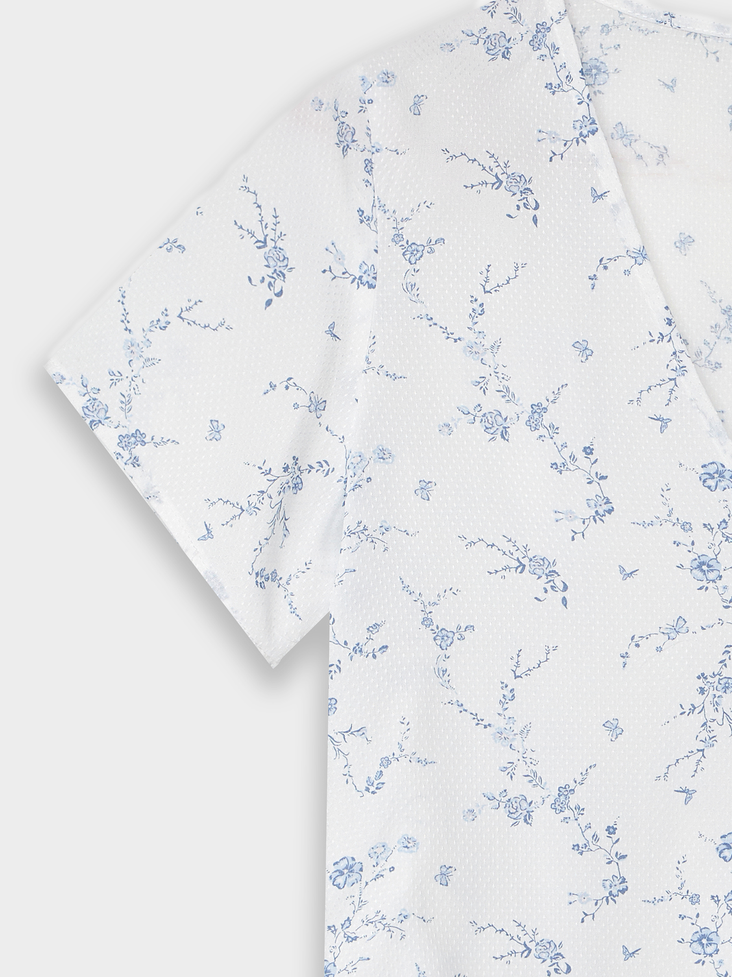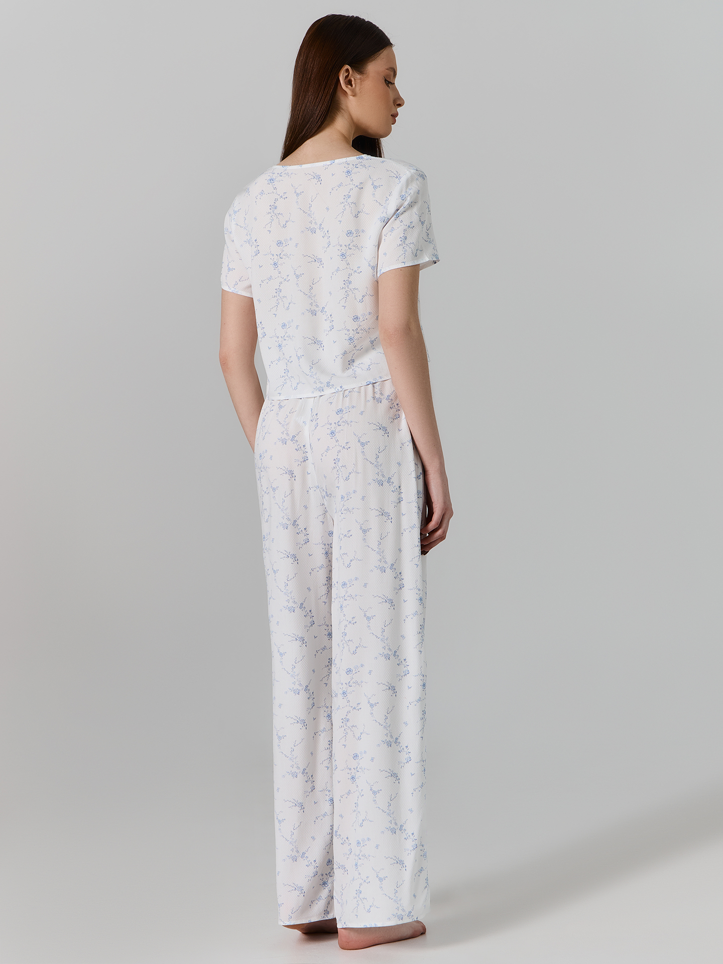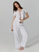 Комплект женский состоит из блузы и брюк. Блуза прямая короткая. Горловина V-образной формы. Горловина и борта обработаны бейкой из основного полотна. По переду центральная застежка на завязки. Рукава втачные короткие. Нижние срезы блузы и рукавов обработаны швом вподгибку с закрытым срезом. Брюки прямые свободные, посадка высокая. Пояс отрезной с эластичной тесьмой внутри (вн. 50мм 50RV). Нижний срез обработан швом вподгибку с закрытым срезом.