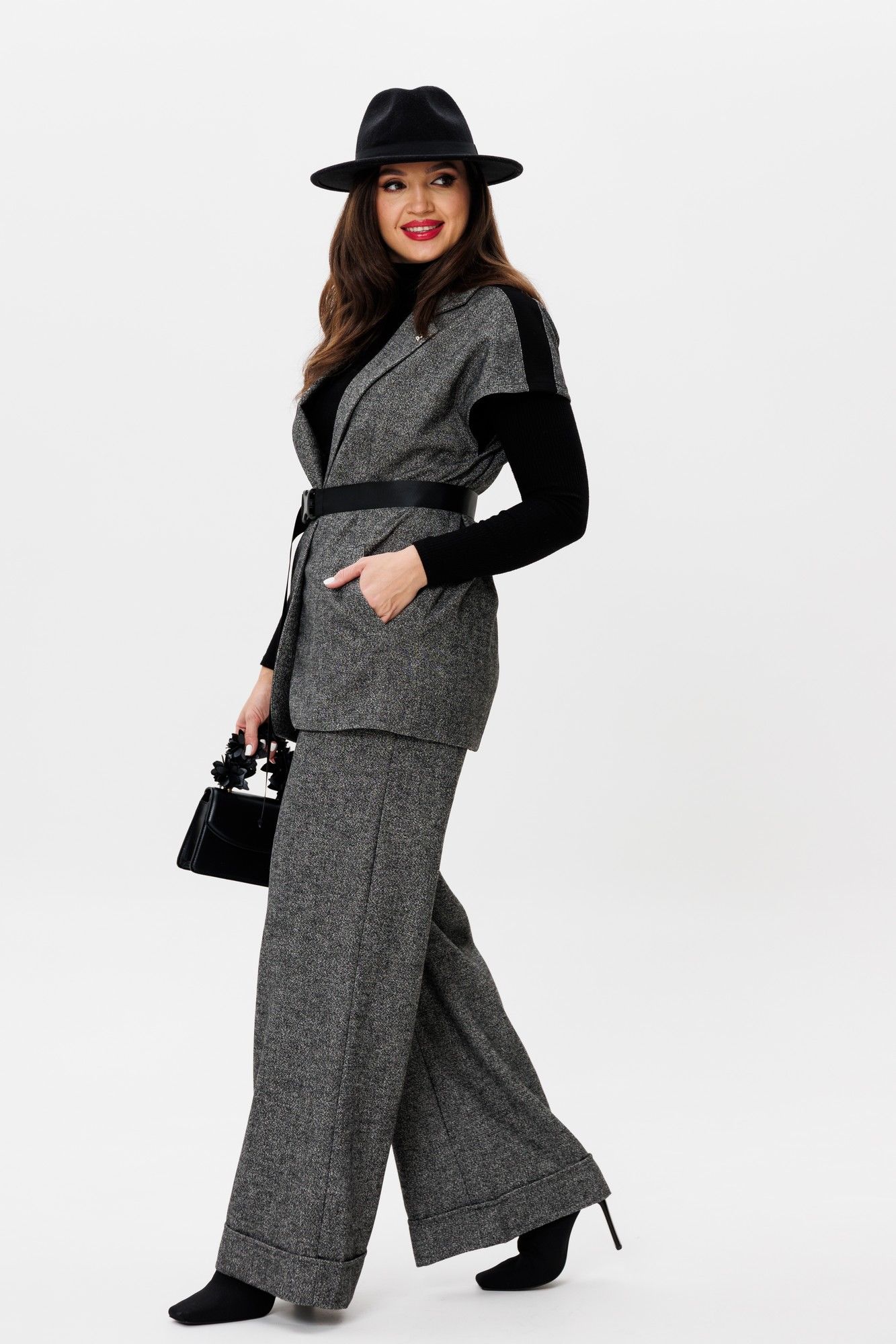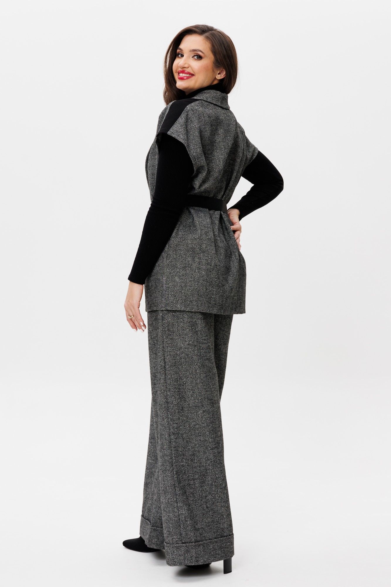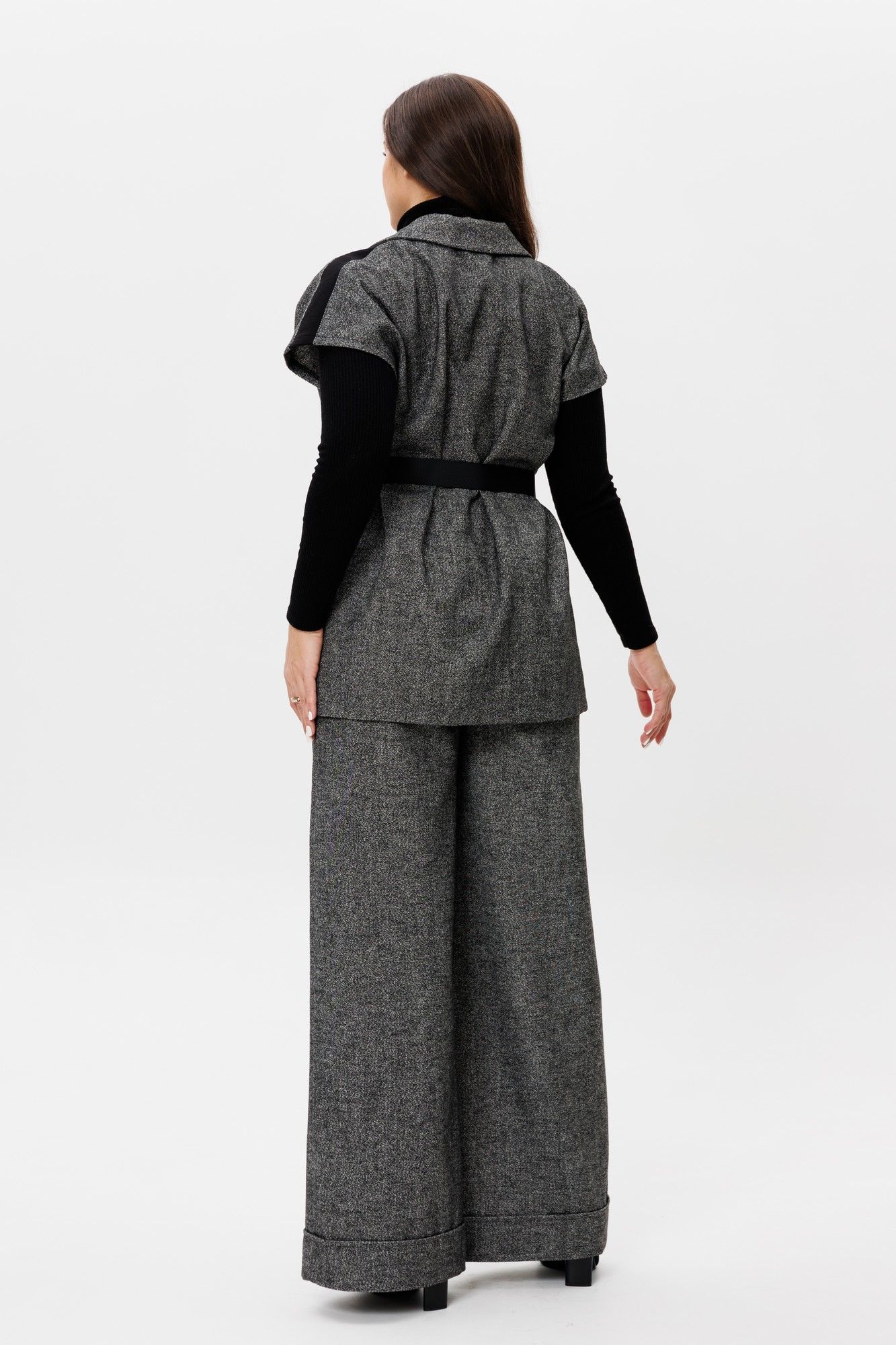 Эффектный и универсальный, удобный женский костюм состоящий из двух предметов: удлиненного жилета и брюк-палаццо. Изделие выполнено из костюмного твида. Жилет прямого полуприлегающего силуэта с пиджачным воротником (раскладными лацканами), также на жилете имеются прорезные карманы с листочками, на плечевом поясе вставки из контрастного черного трикотажа. Декором служит запонка на воротнике. Брюки- палаццо, по низу с цельнокроеной манжетой; по верху на притачном поясе с резинкой по спинке, застежка в левом боковом шве на тесьму молнию. К костюму прилагается съемный контрастный пояс с застежкой-карабином. Длина жилета по спинке 75 см(+-1см), длина плеча 28см(+-1см). Длина брюк по боковому шву 110см(+-1см), длин брюк по шаговому шву 76см(+-1см). Изделие подойдет на рост 170см.