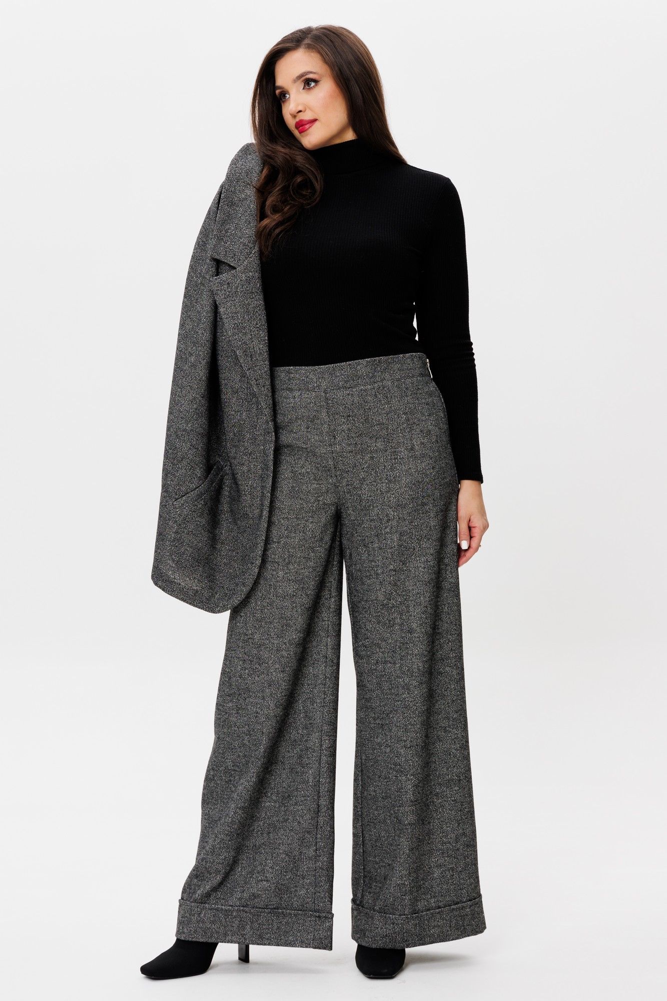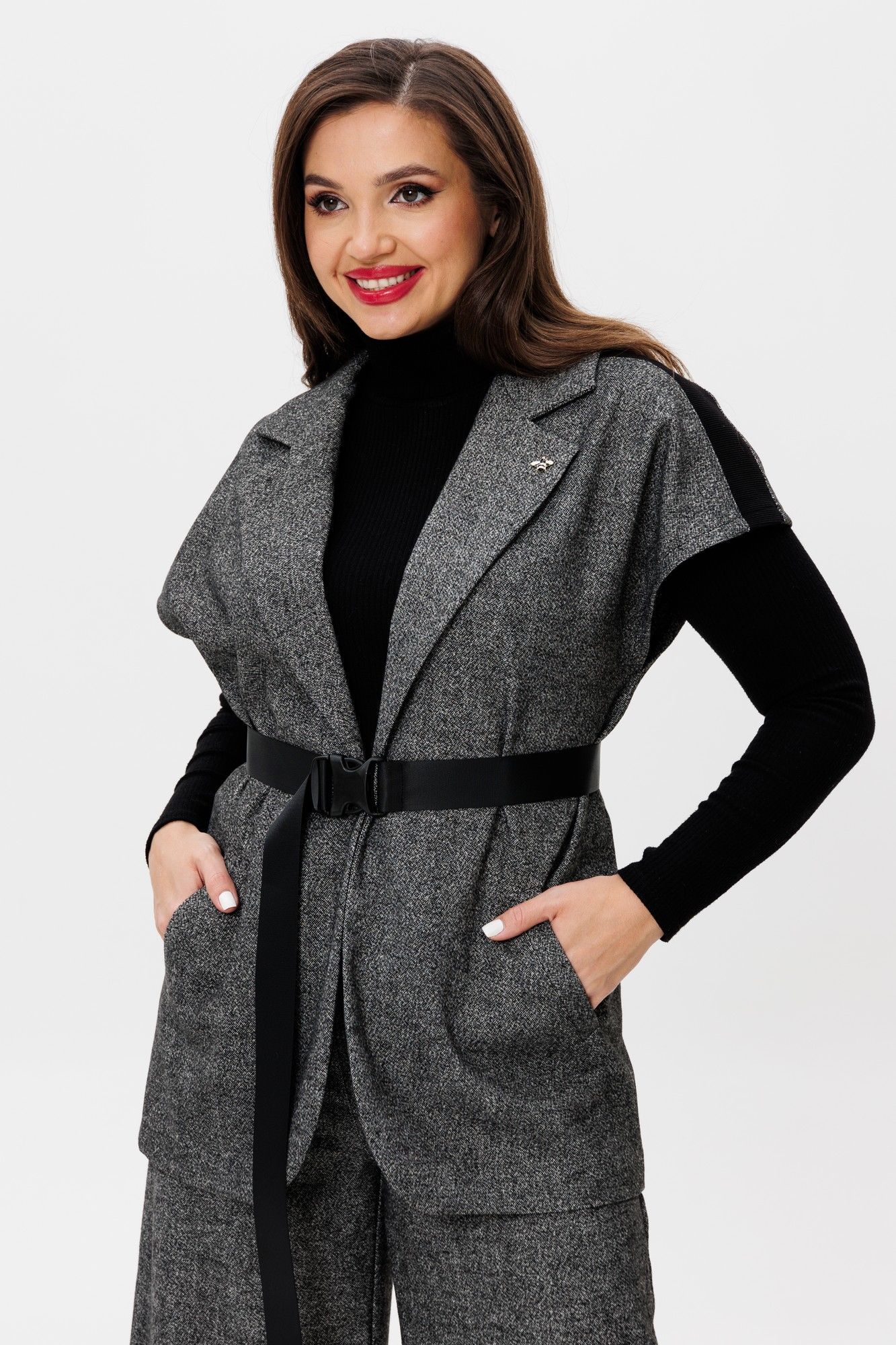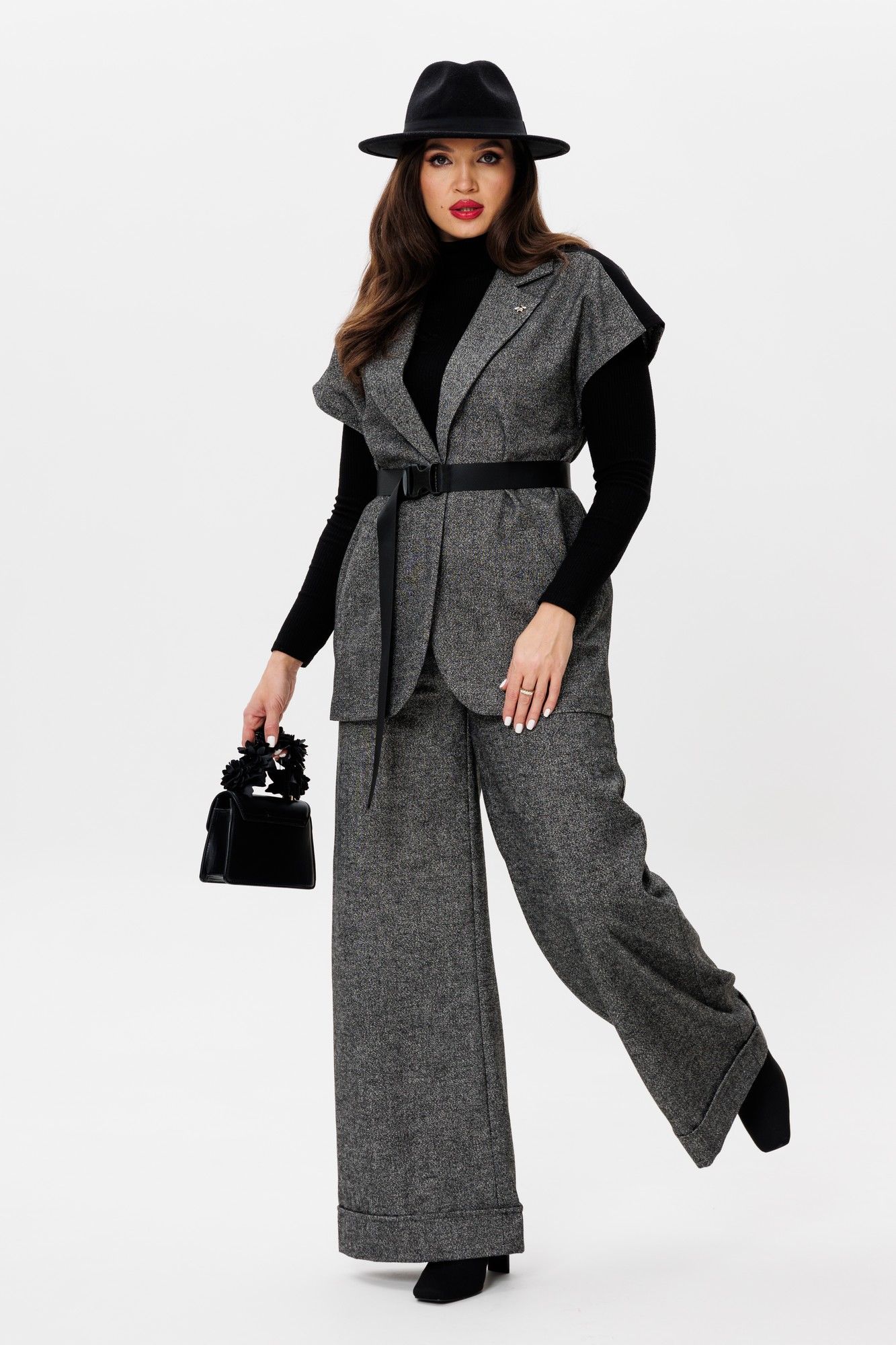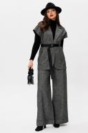 Эффектный и универсальный, удобный женский костюм состоящий из двух предметов: удлиненного жилета и брюк-палаццо. Изделие выполнено из костюмного твида. Жилет прямого полуприлегающего силуэта с пиджачным воротником (раскладными лацканами), также на жилете имеются прорезные карманы с листочками, на плечевом поясе вставки из контрастного черного трикотажа. Декором служит запонка на воротнике. Брюки- палаццо, по низу с цельнокроеной манжетой; по верху на притачном поясе с резинкой по спинке, застежка в левом боковом шве на тесьму молнию. К костюму прилагается съемный контрастный пояс с застежкой-карабином. Длина жилета по спинке 75 см(+-1см), длина плеча 28см(+-1см). Длина брюк по боковому шву 110см(+-1см), длин брюк по шаговому шву 76см(+-1см). Изделие подойдет на рост 170см.