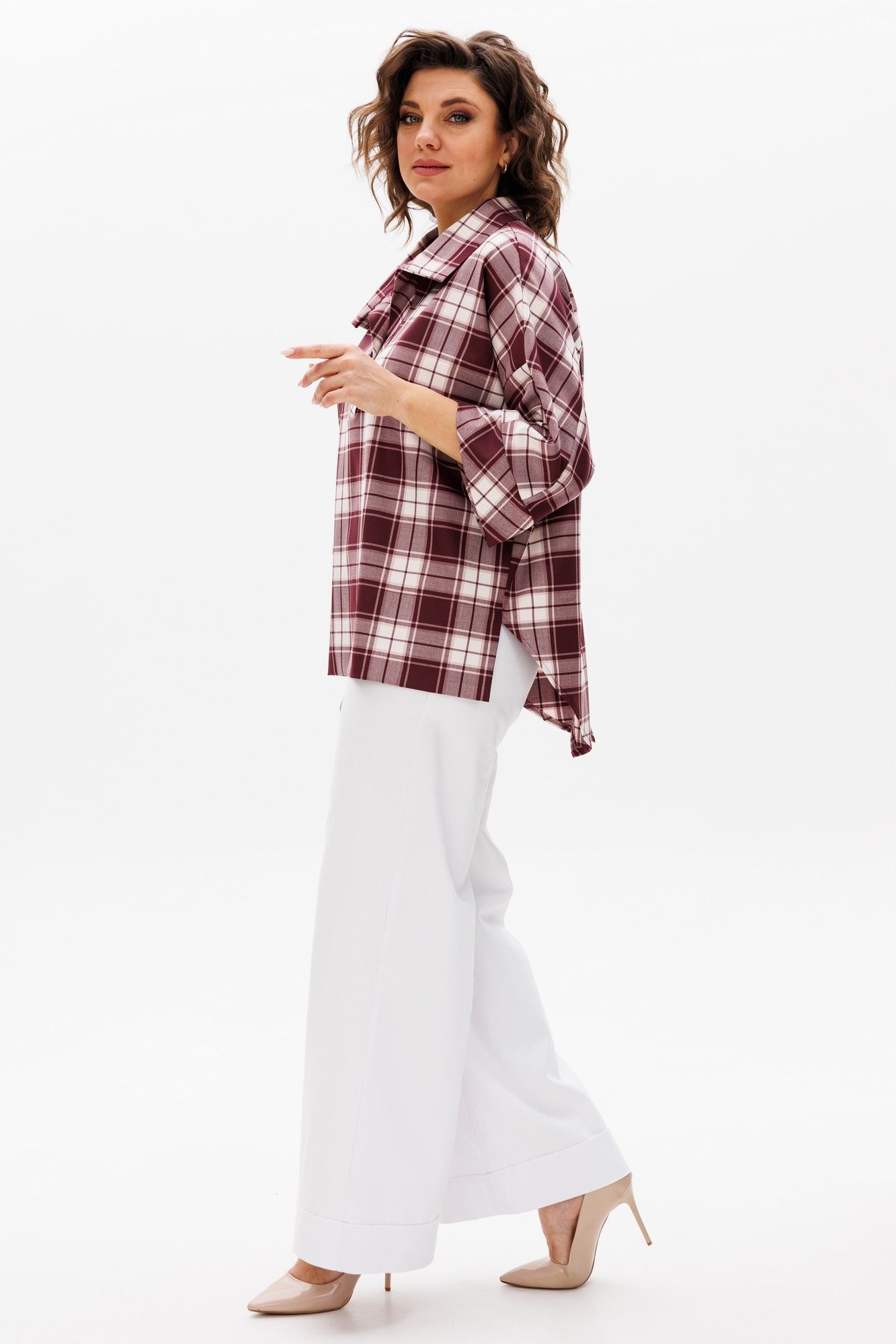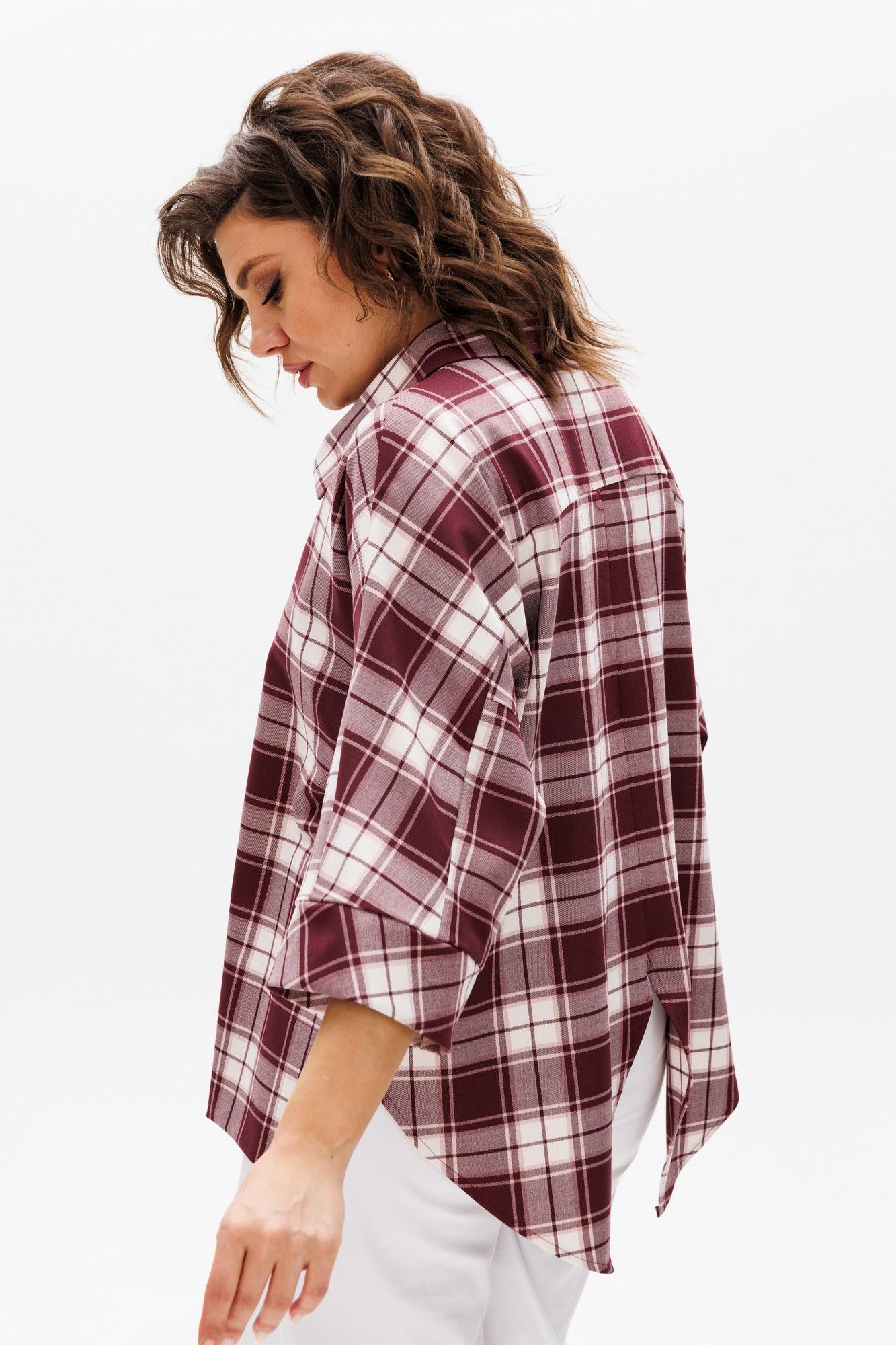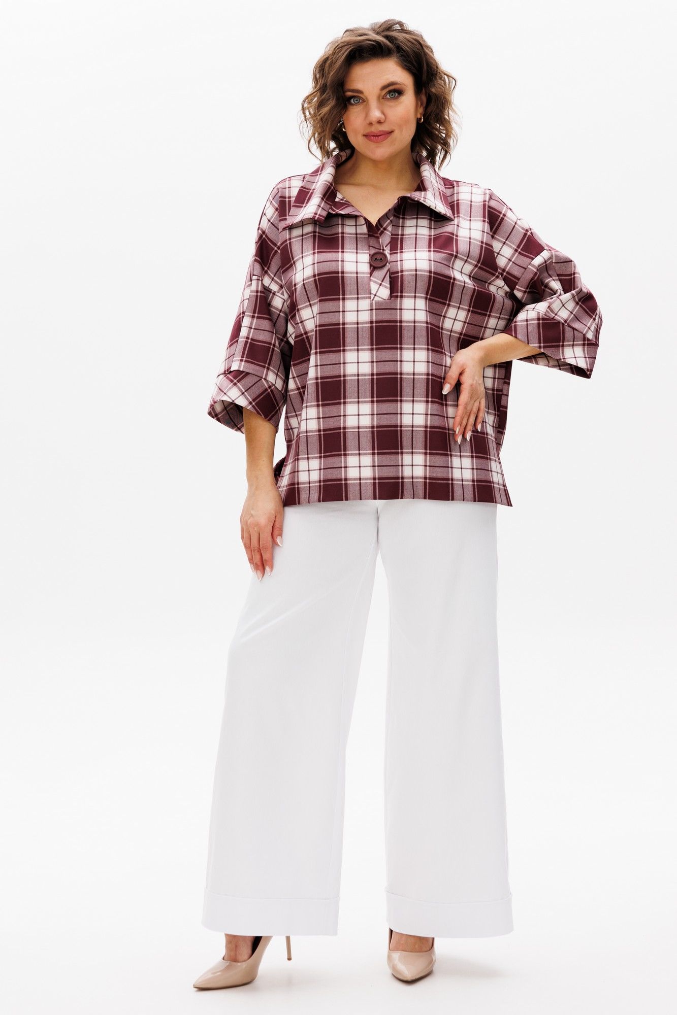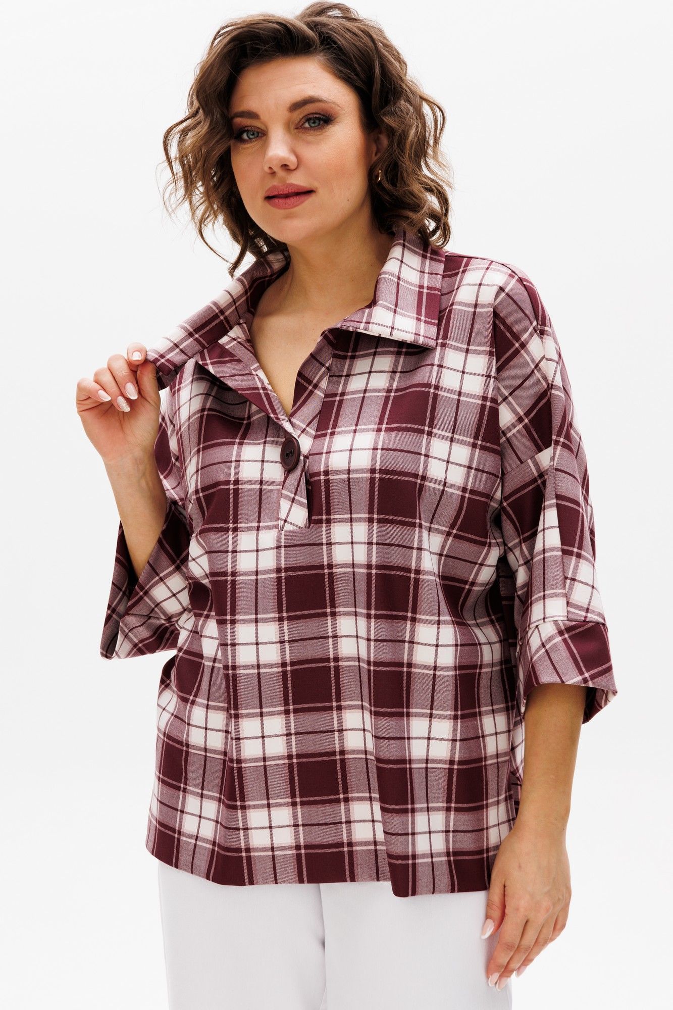 Женская блуза в стиле «бохо» прекрасно вольется в повседневную жизнь и станет одной из любимых базовых вещей в Вашем гардеробе. Блуза свободного кроя. Перед цельный с планкой-застежкой до груди. Спинка с плечевой кокеткой, переходящей в рукав, низ фигурный. Рукав 3/4 с притачной манжетой по низу, по бокам изделия разрезы. По низу переда широкая подгибка. Изделие хорошо сочетается как с брюками, так и с юбками, с классической и спортивной обувью. Длина изделия по спинке 74 (+/- 1 см). Длина рукава от горловины 55 (+/- 1 см). Изделие подойдет на рост 170 см.