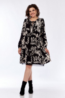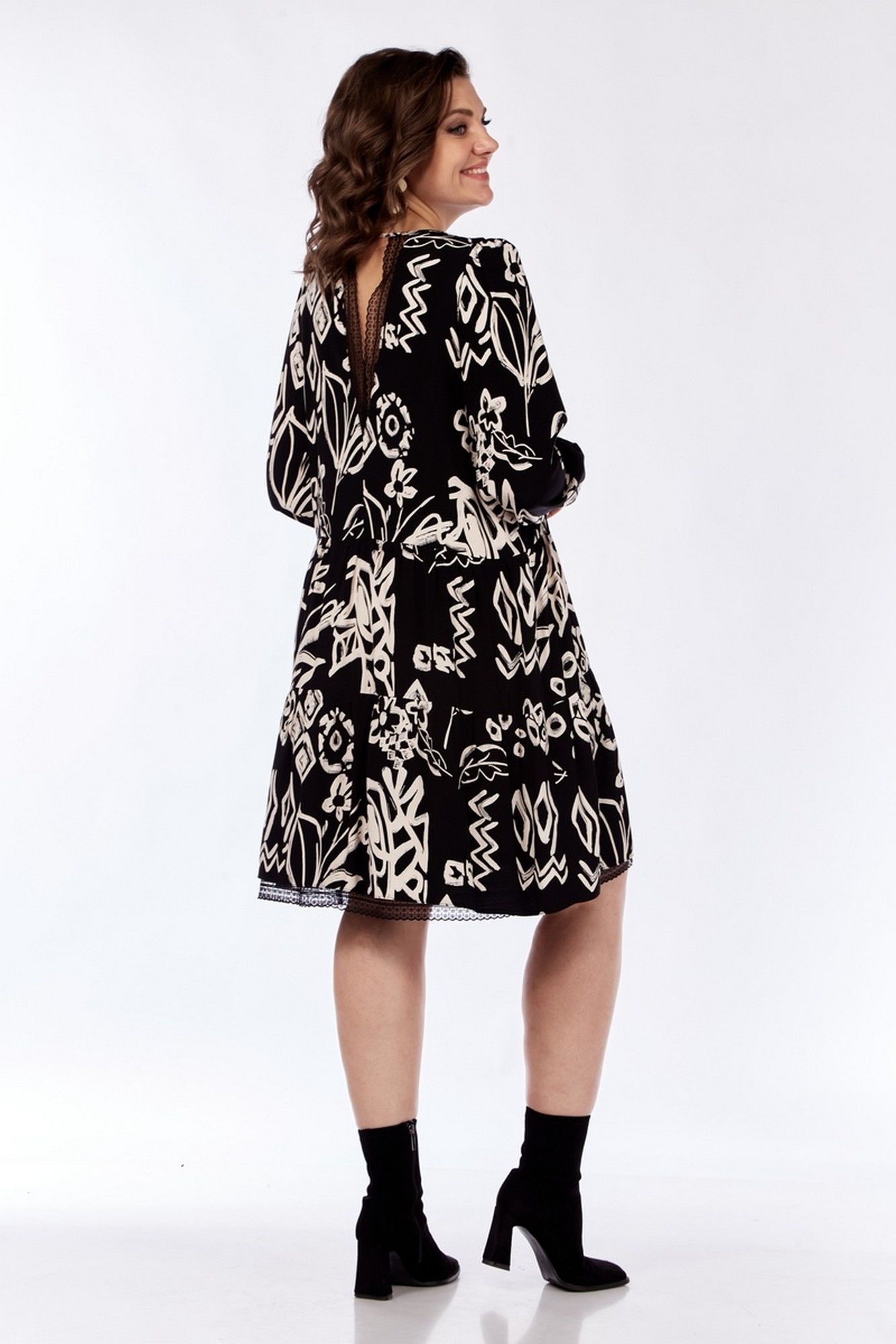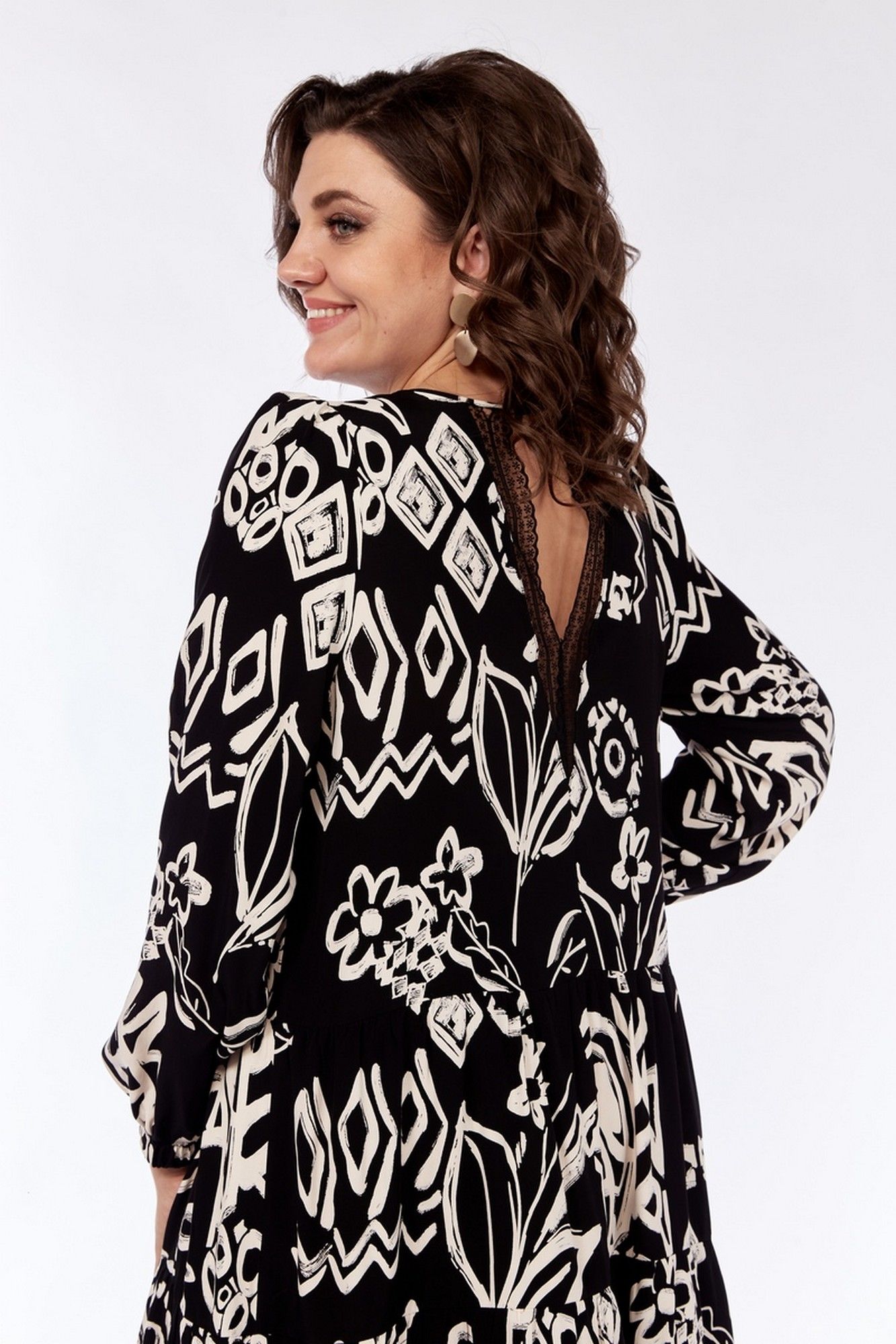 Платье женское свободного силуэта. Округлый вырез горловины, на завязках. Рукав втачной, со сборкой, по низу-на резинке. Изделие с подрезами, со сборкой. По спинке-декоративный вырез с кружевом. Нижний валан платье выполнен из сетки с кружевом. Длина по спинке-93см, длина рукава-63см. Без нижнего платья.