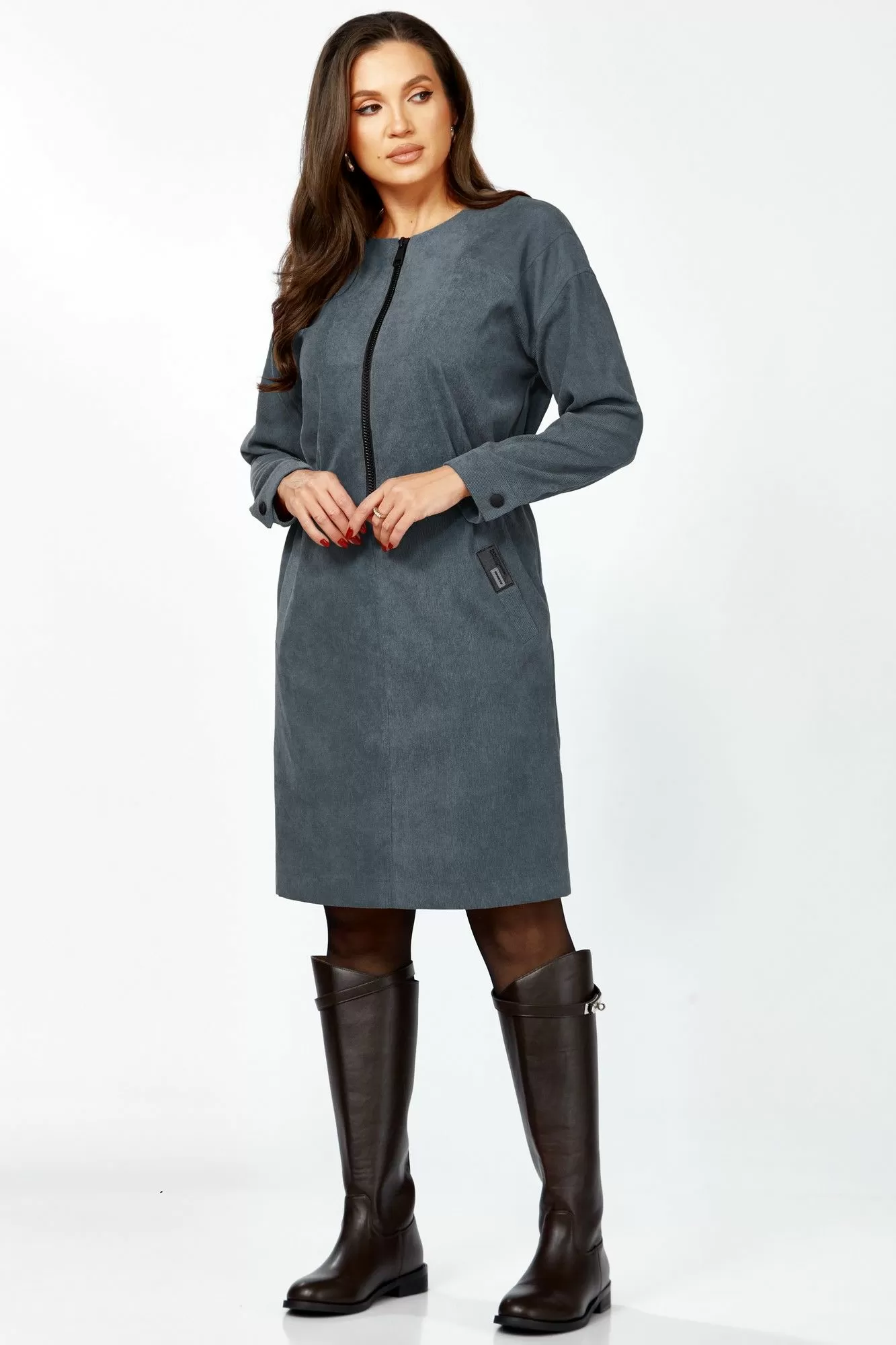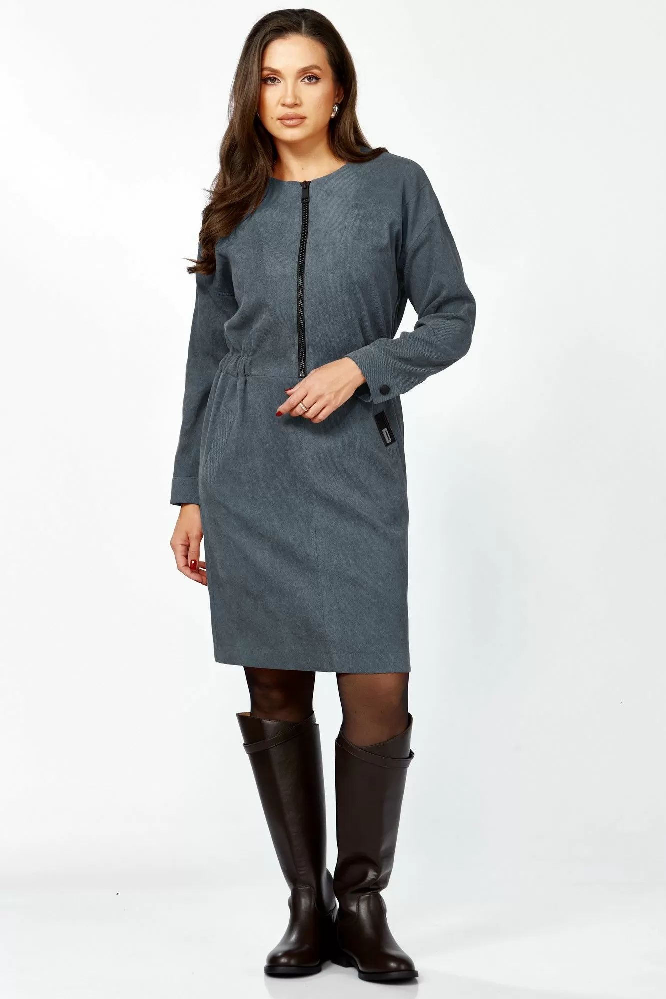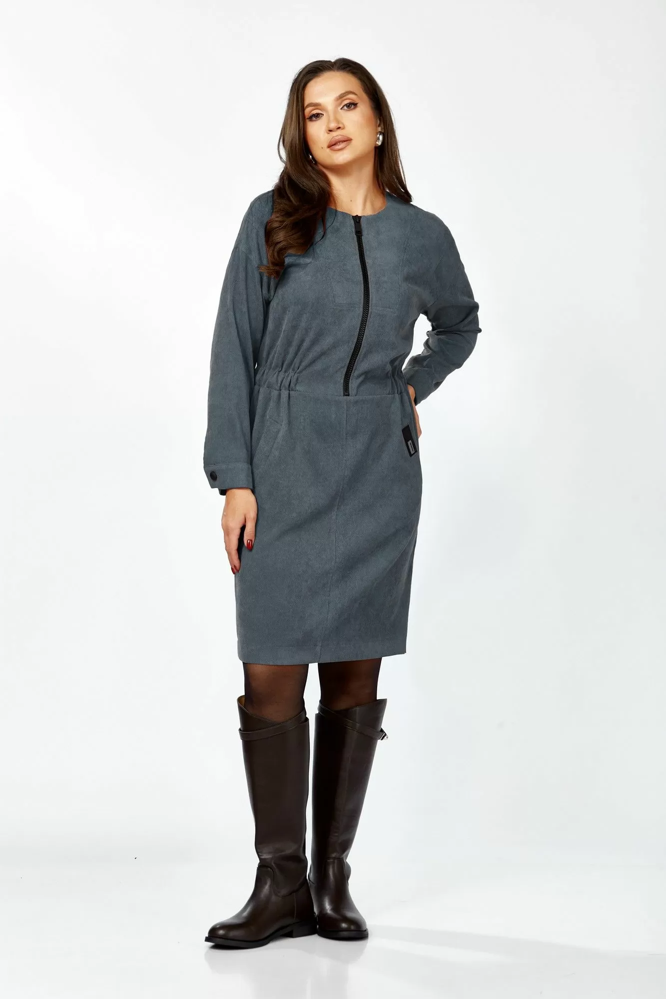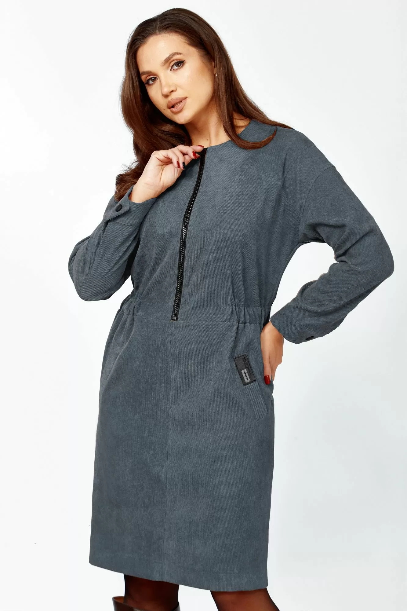 Платье полуприлегающего силуэта из мягкой, комфортной штруксовой ткани. Рукав спущенный, длинный, на манжете с застёжкой на 1 петлю и 1 пуговицу, разрезом. Горловина круглая, застёжка на тесьму-молнию контрастного цвета до талии. По талии подрез, по бокам спереди вставлена резинка, верхняя часть платья имитирует бомбер. Карманы- наклонные листочки, расположены на уровне бёдер по переднему полотнищу юбки, на левой листочке настрочена нашивка контрастного цвета. Перед платья с декоративными подрезами и отстрочкой. Спинка отрезная по талии, на резинке, со средним швом и разрезом по низу.
