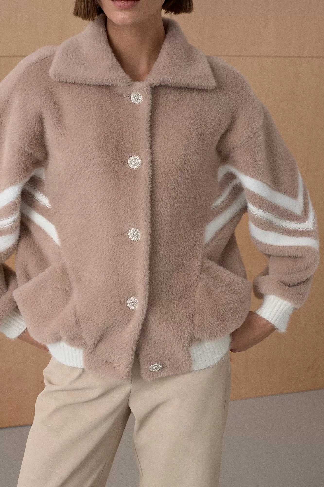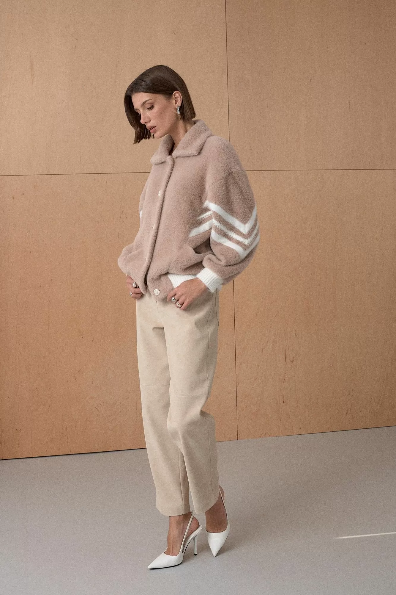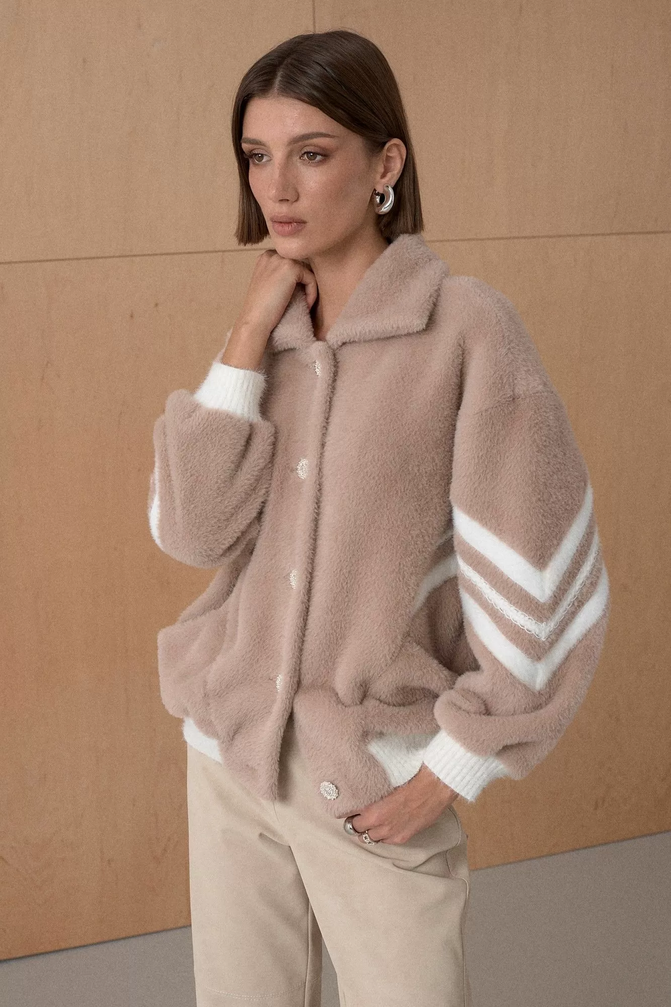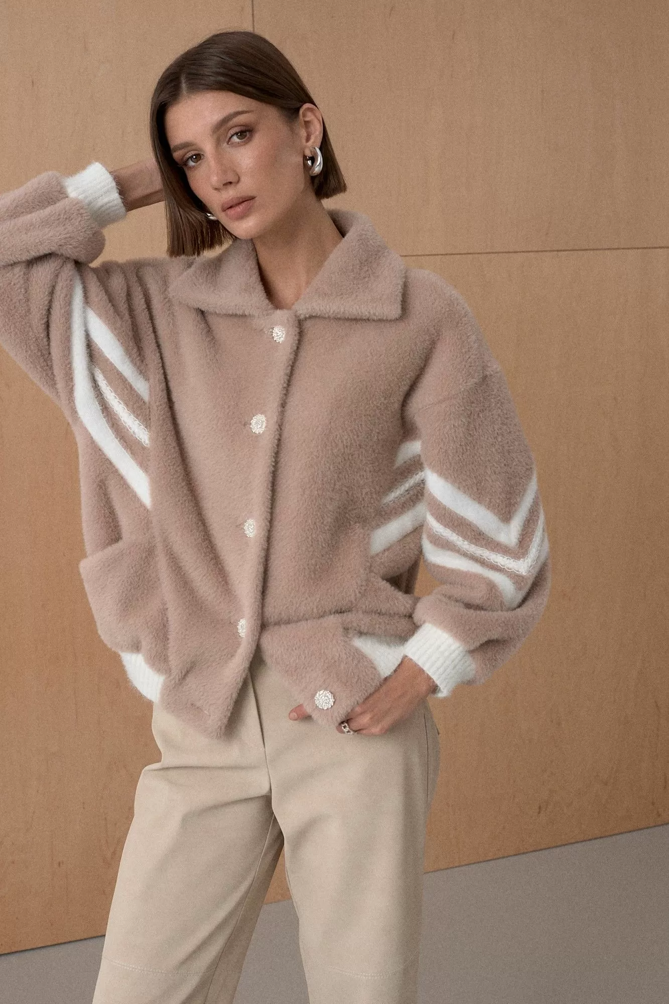 Джемпер из мягкого фактурного трикотажного полотна. Джемпер в силуэте олимпийки. Застежка на премиальные итальянские пуговицы. На рукавах декоративные ленты в виде лампасов. Длина от плечевой точки у основая шеи 64 см. Состав 100% ПЭ