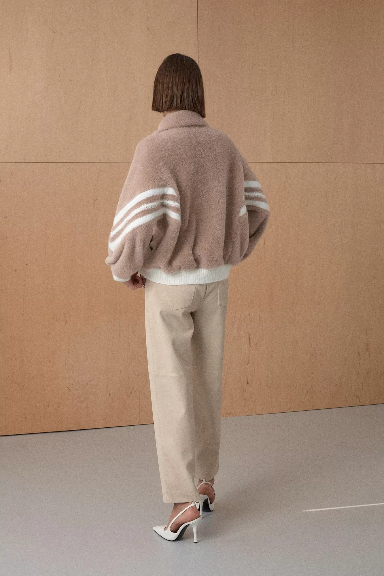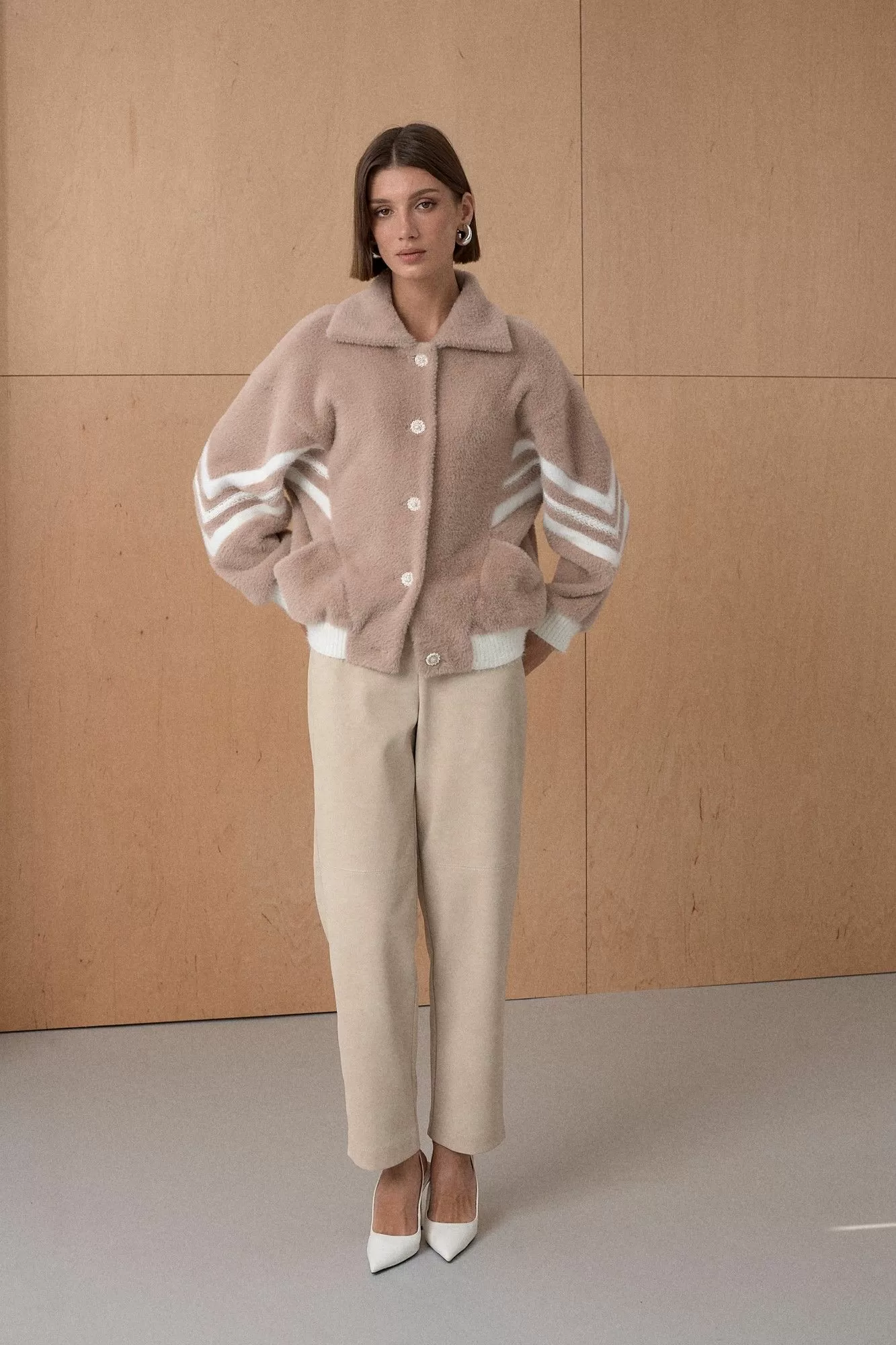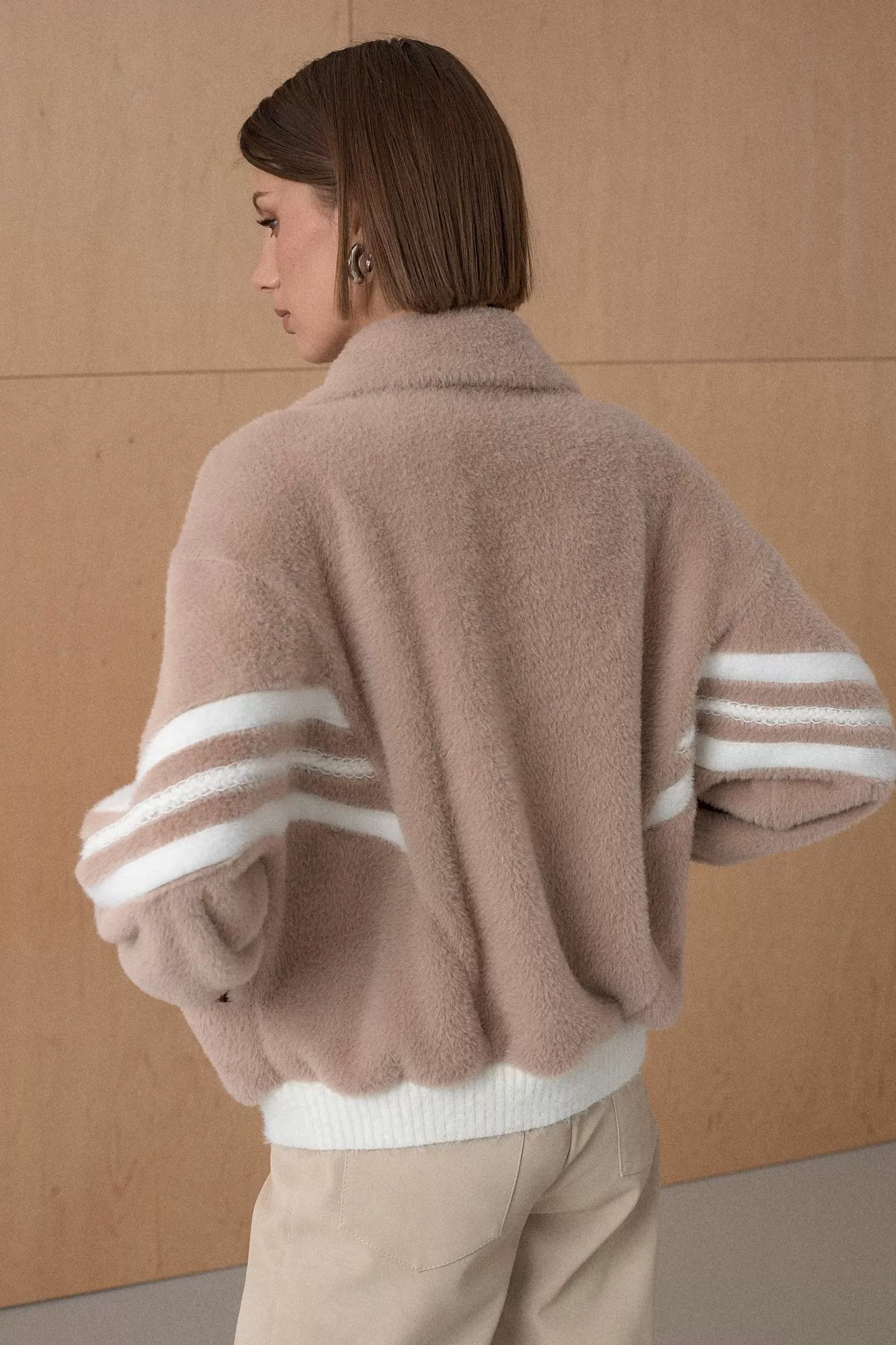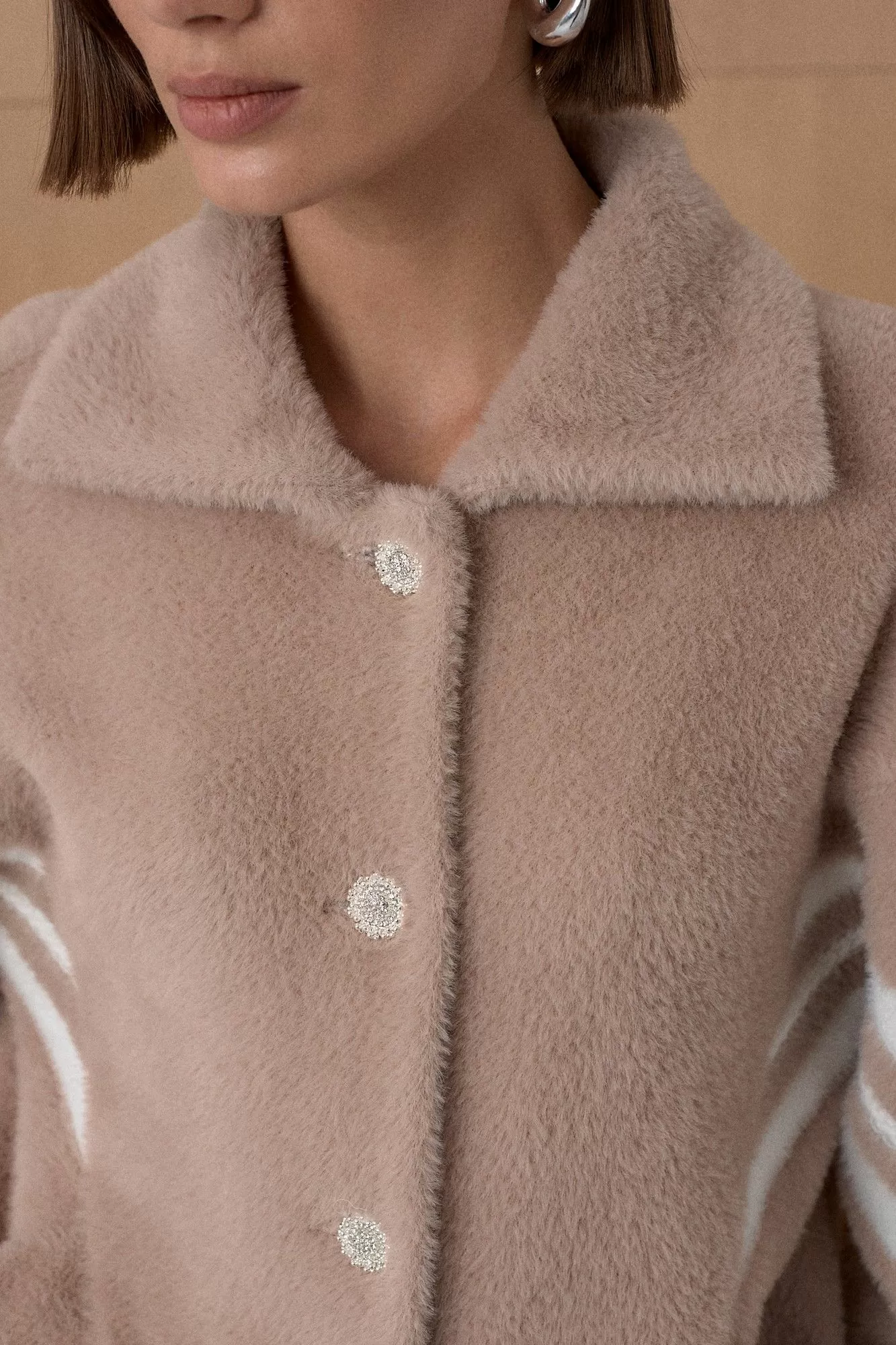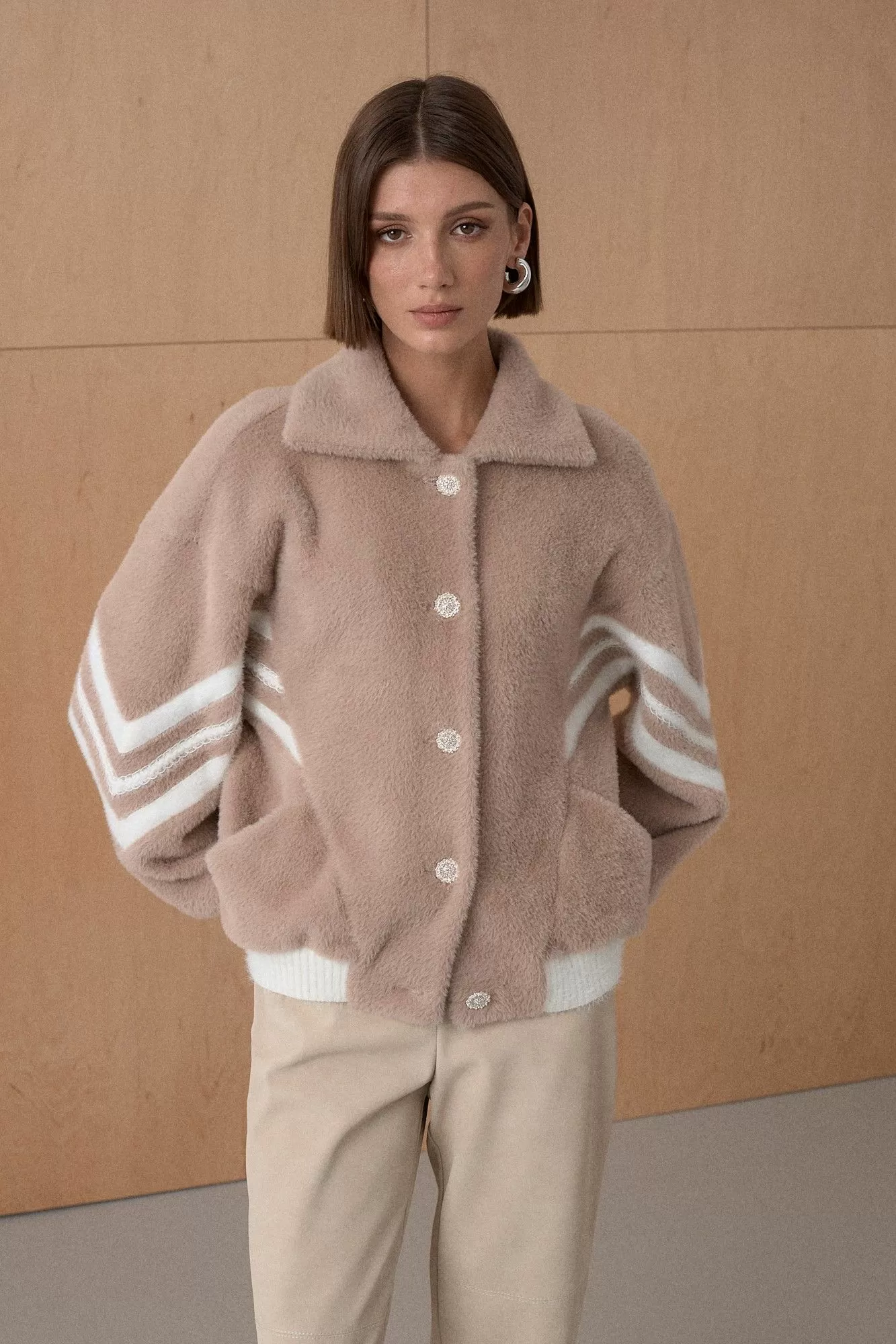Джемпер из мягкого фактурного трикотажного полотна. Джемпер в силуэте олимпийки. Застежка на премиальные итальянские пуговицы. На рукавах декоративные ленты в виде лампасов. Длина от плечевой точки у основая шеи 64 см. Состав 100% ПЭ