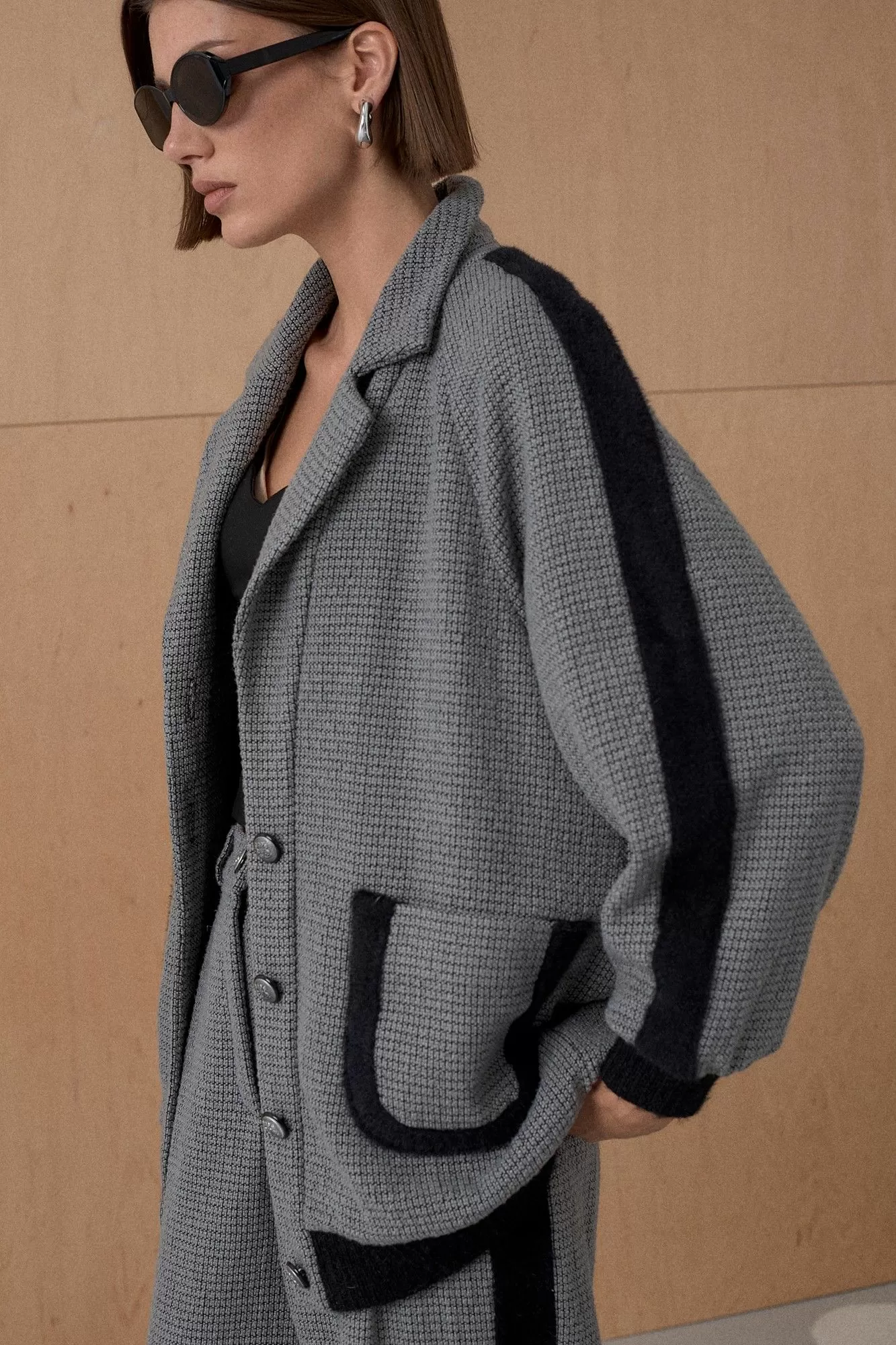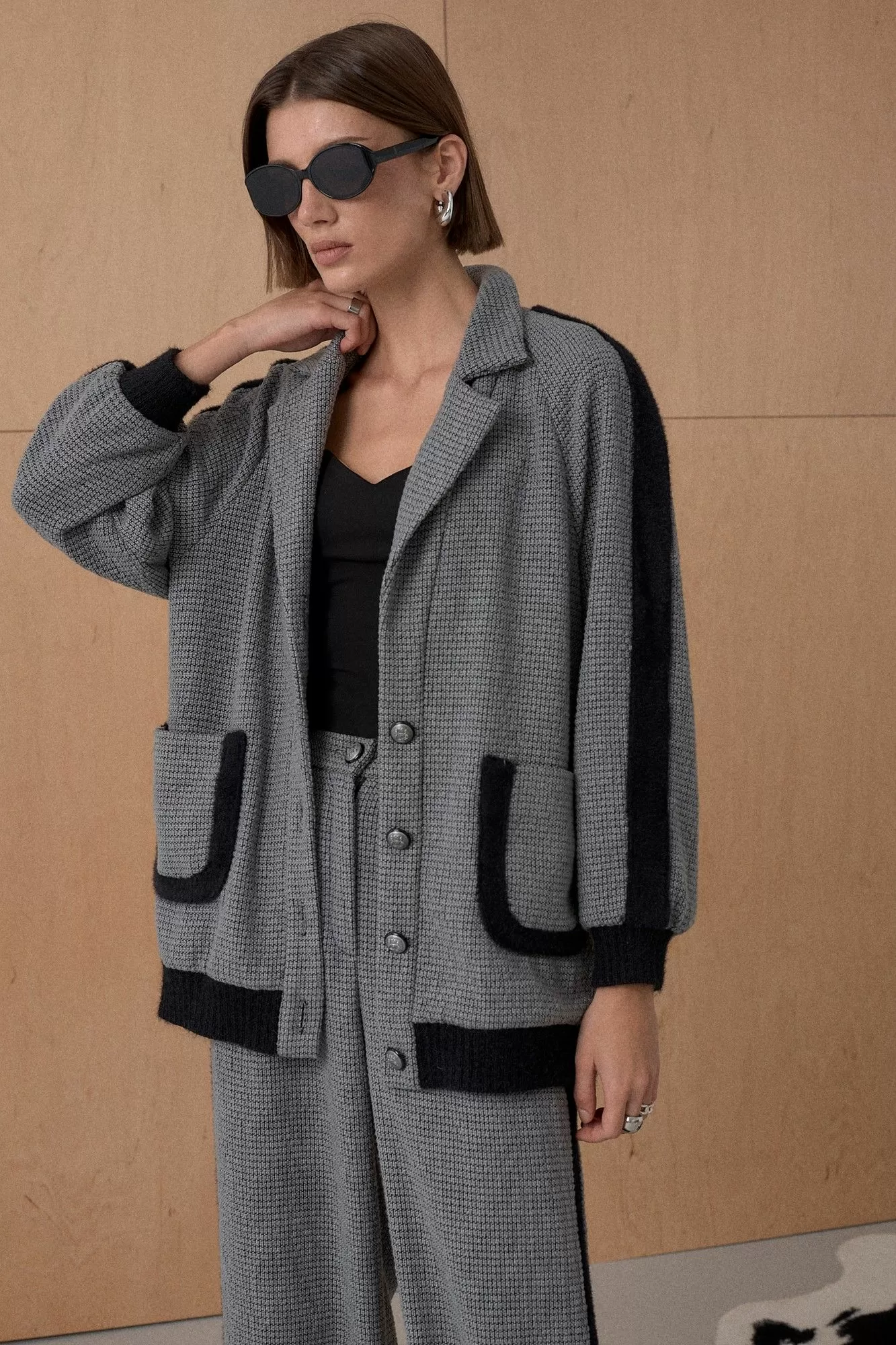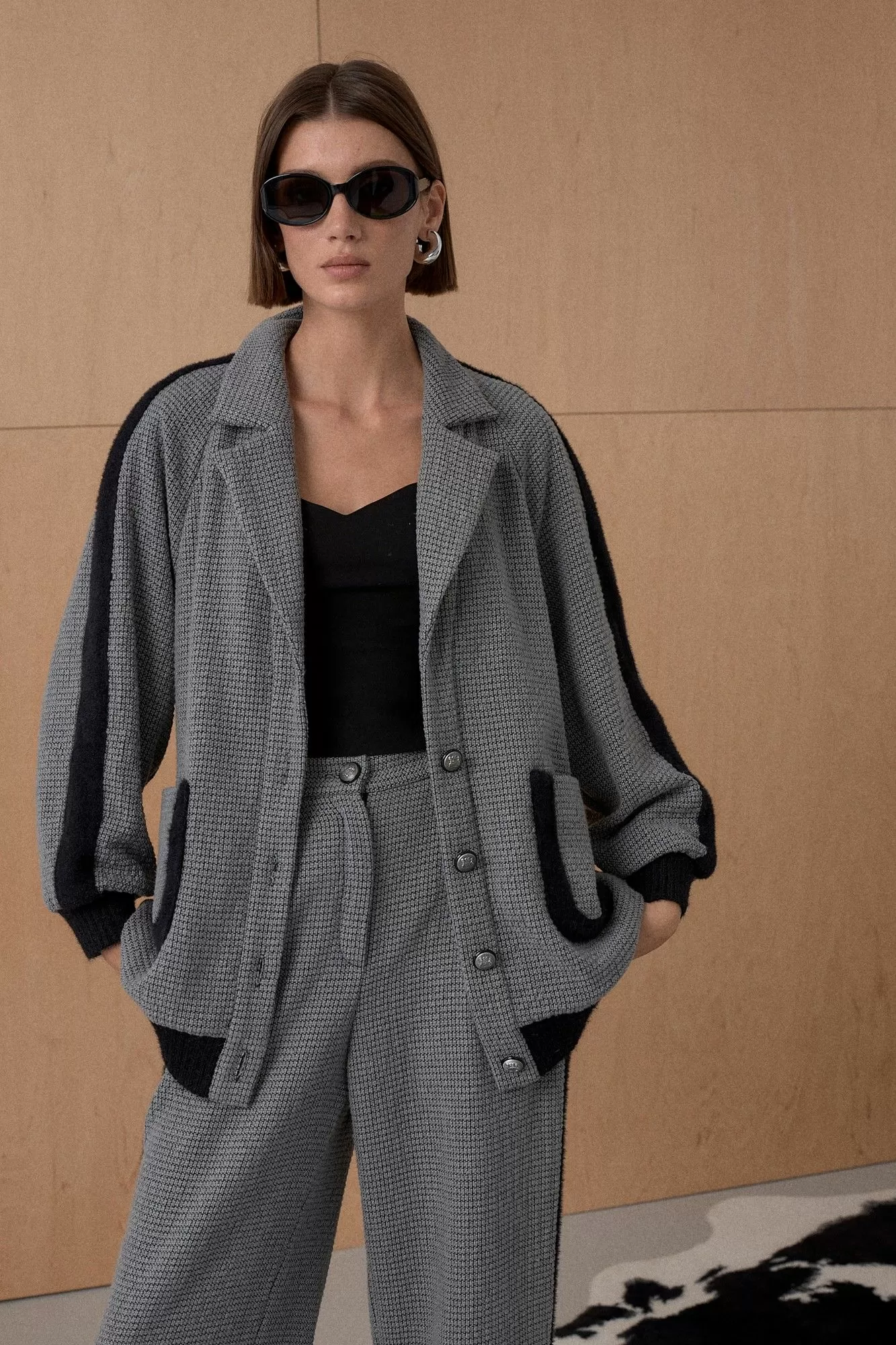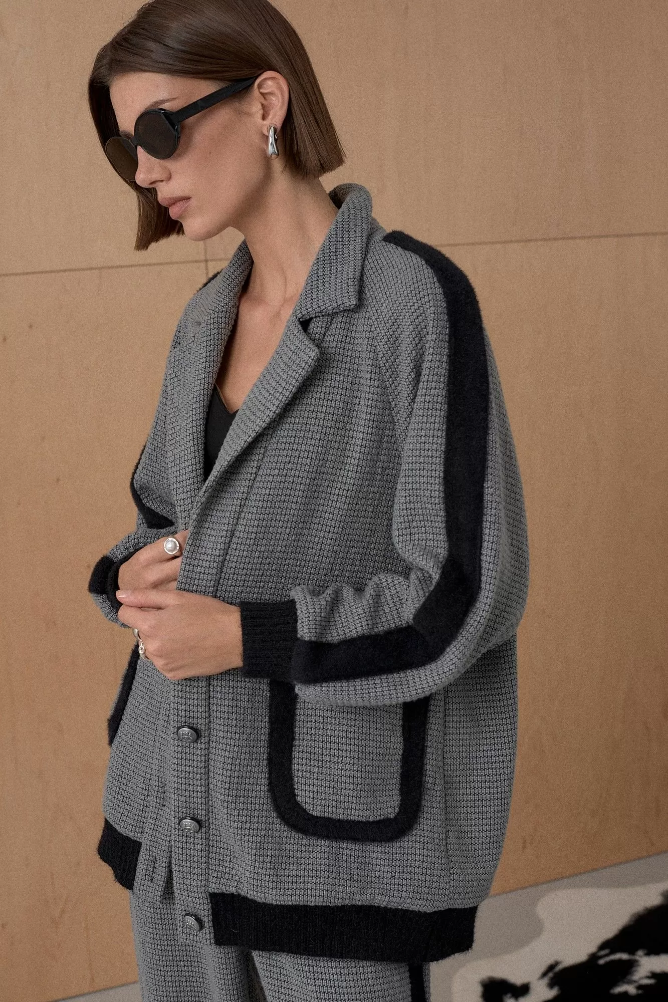Жакет из твидовой ткани декорирован лентами в виде лампасов. На подкладке. Длина от плечевой точки у основая шеи 76 см. Состав 73% ПЭ, 21% вискоза, 6% спандекс