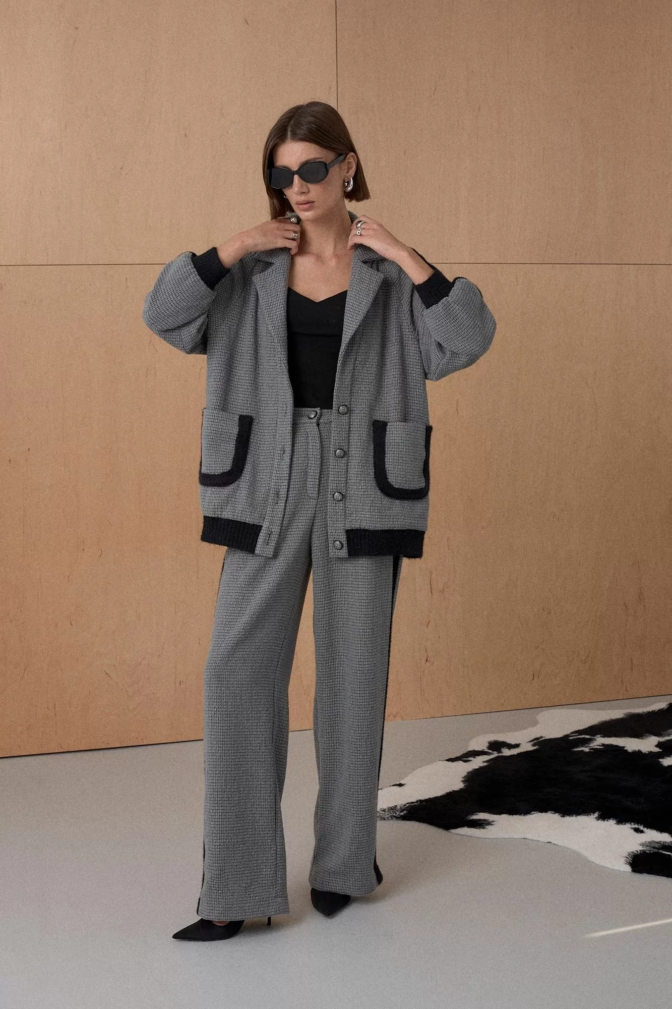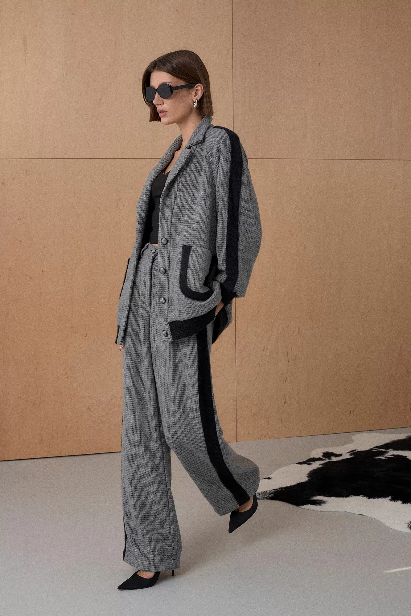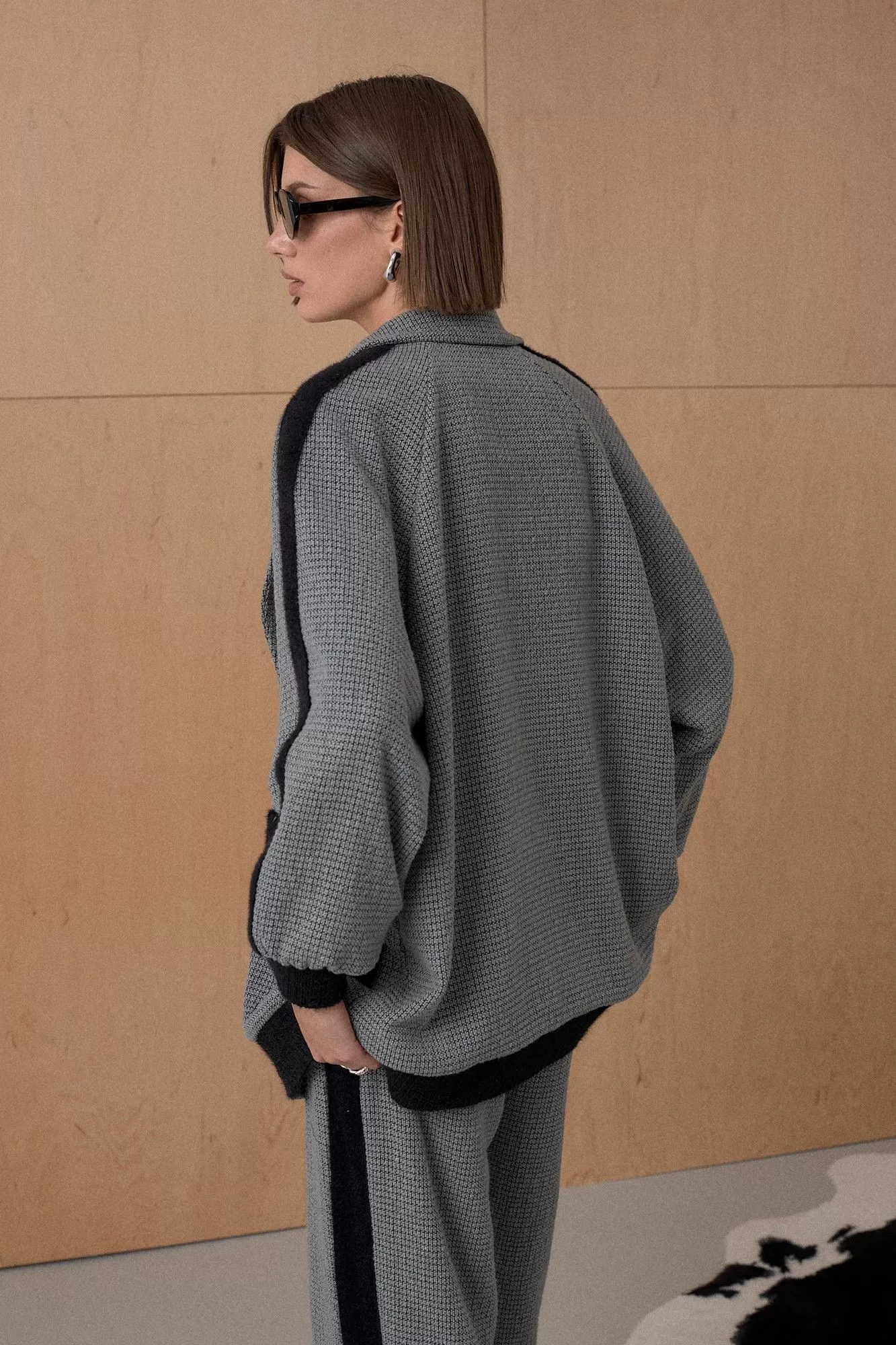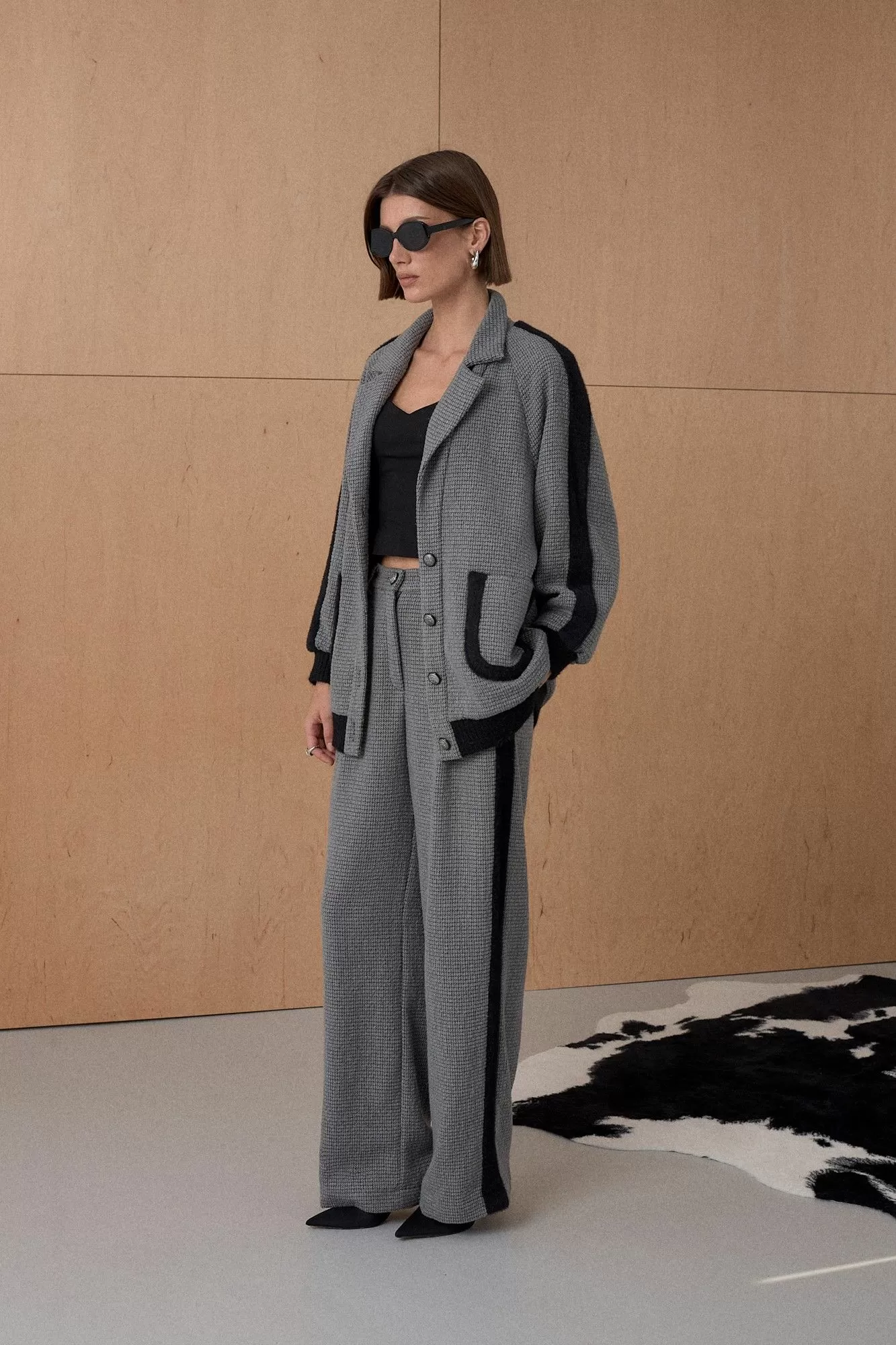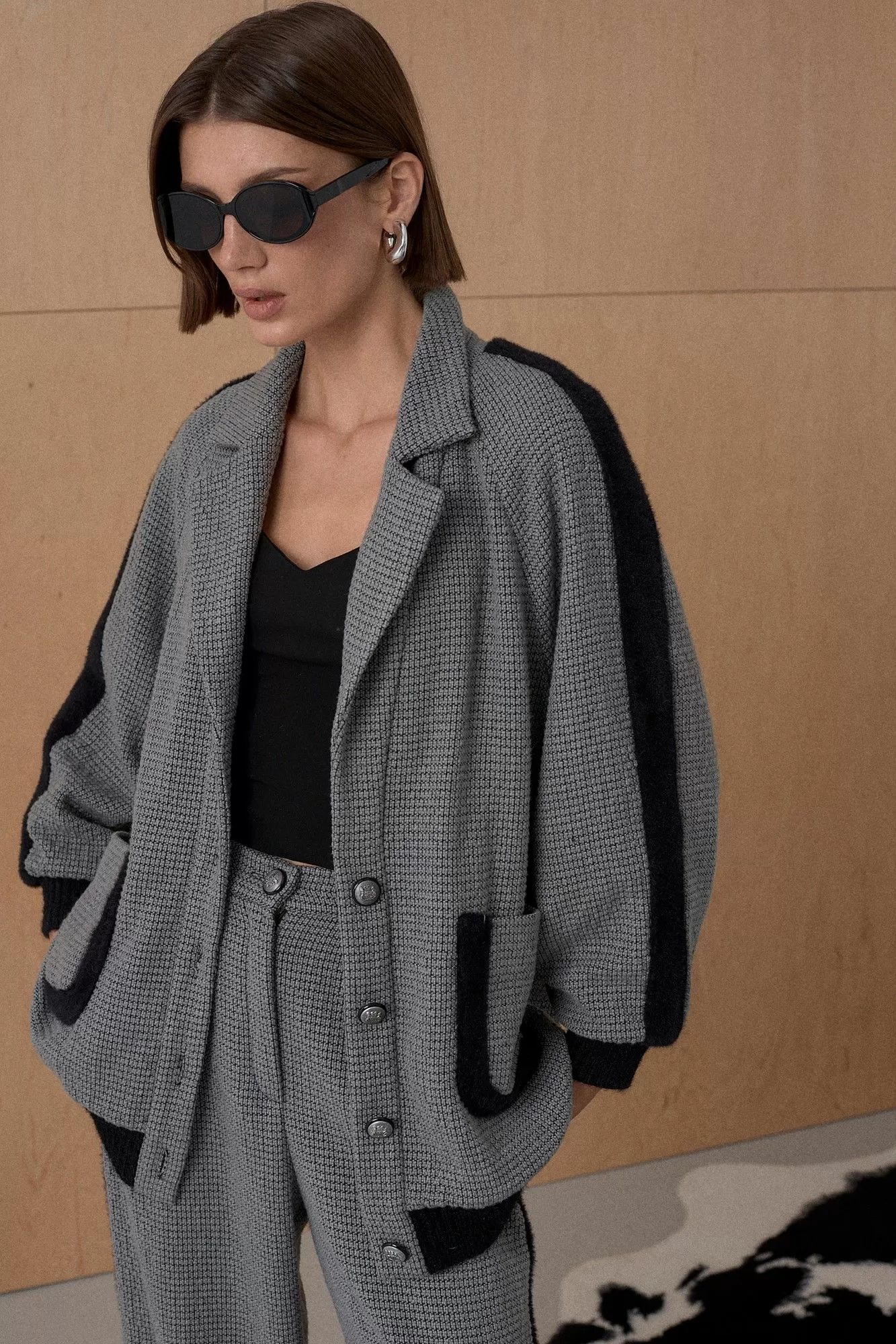 Жакет из твидовой ткани декорирован лентами в виде лампасов. На подкладке. Длина от плечевой точки у основая шеи 76 см. Состав 73% ПЭ, 21% вискоза, 6% спандекс
