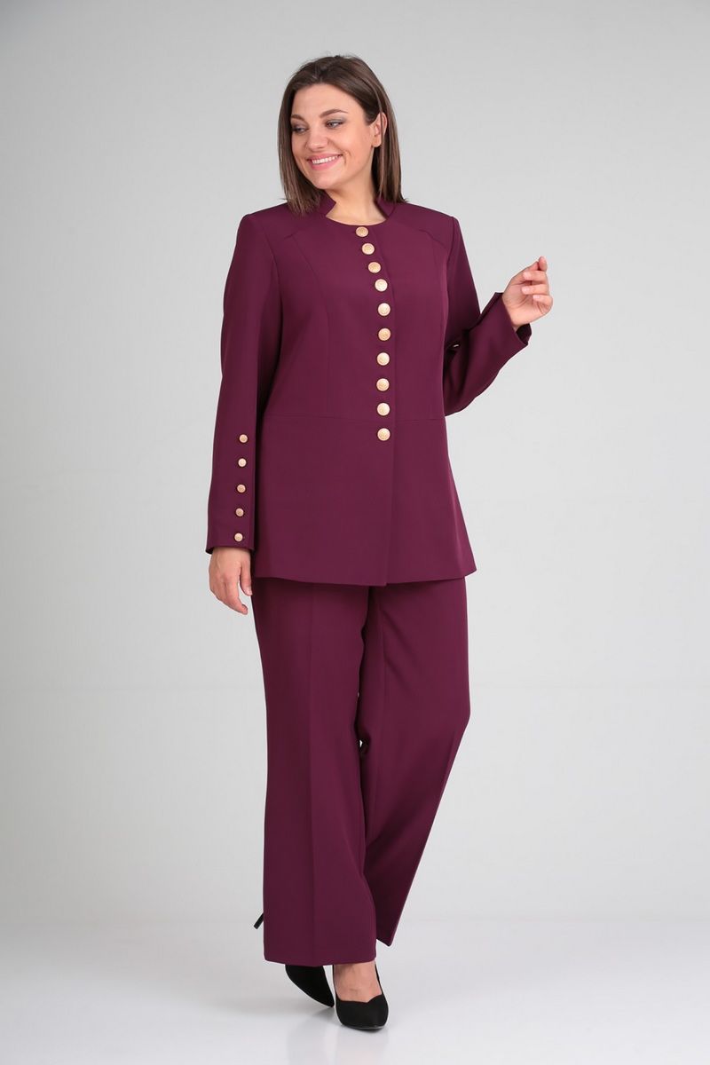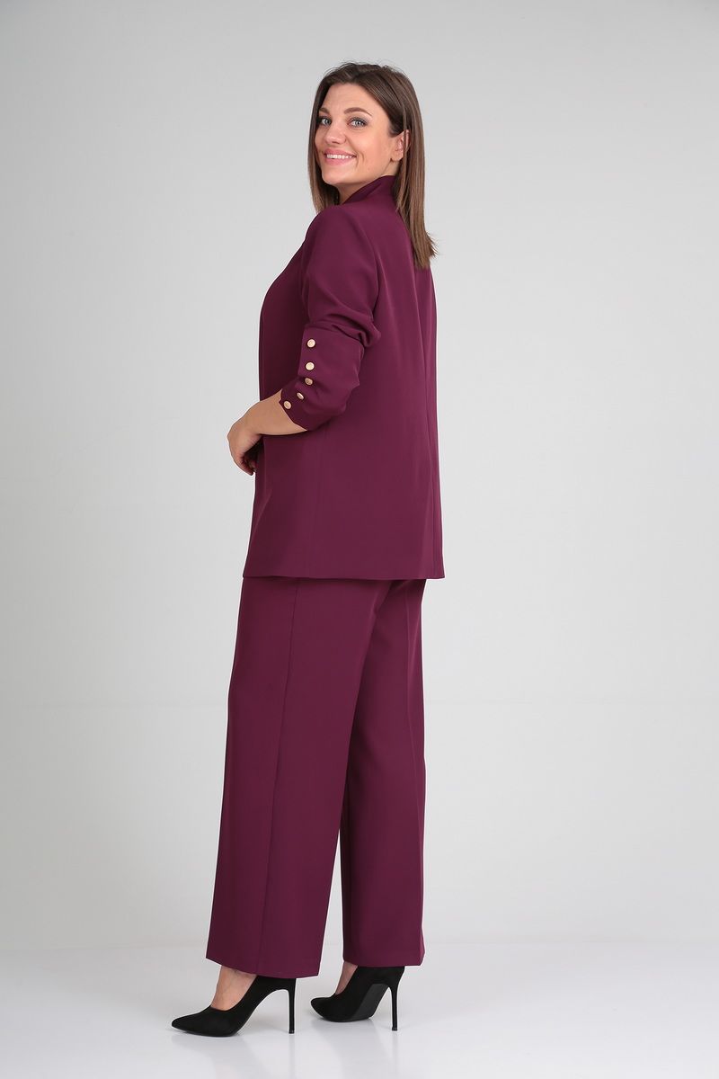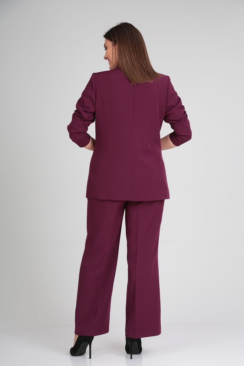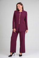Комплект женский двухпредметный, состоящий из жакета и брюк, выполнен из костюмной ткани (слегка тянется). Жакет на подкладке прямого силуэта, на полочках сверху кокетки. Воротник – небольшая стойка. Рукав двухшовный, по переду рукавов пришиты по пять декоративных металлических пуговиц. Декором служат металлические пуговицы с гербом. Длина жакета по среднему шву спинки – р46,48 -68, р50,52,54,56,58,6062,64 – 70 Длина рукава во всех р-ах – 61 Ширина рукава на уровне глубины проймы ½ - р46-9,5, р48-20, р50-20,5, р52-21, р54-21,5, р56-22, р58-22,5, р60-23,5, р62-24 ОГ ½ - р46-50, р48-52, р50-54, р52-56, р54-58, р56-60, р58-62, р60-64, р62-66, р64-68 ОТ ½ - р46-49, р48-51, р50-53, р52-55, р54-57, р56-59, р58-61, р60-63, р62-65, р64-67 ОБ ½ - р46-56, р48-58, р50-60, р52-62, р54-64, р56-66, р58-68, р60-70, р62-72, р64-74 Брюки широкие, по бокам пояса вставлена резинка, обработаны карманы. Длина брюк по боковому шву – р46-60 – 107, р62,64 – 109 ОТ ½ ( с раст резинкой) – р46-46, р48-48, р50-50, р52-52, р54-54, р56-56, р58-58, р60-60, р62-62, р64-64 ОБ ½ - р46-53, р48-55, р50-57, р52-59, р54-61, р56-63, р58-65, р60-67, р62-69, р64-70 Длина брюк по внутреннему шву – р46-54-80, р56,58,60-80,5, р62,64-81 Ширина брюк внизу – р46-53, р48-54, р50-57, р52-58, р54-59, р56-61, р58-62, р60-63, р62,64-65