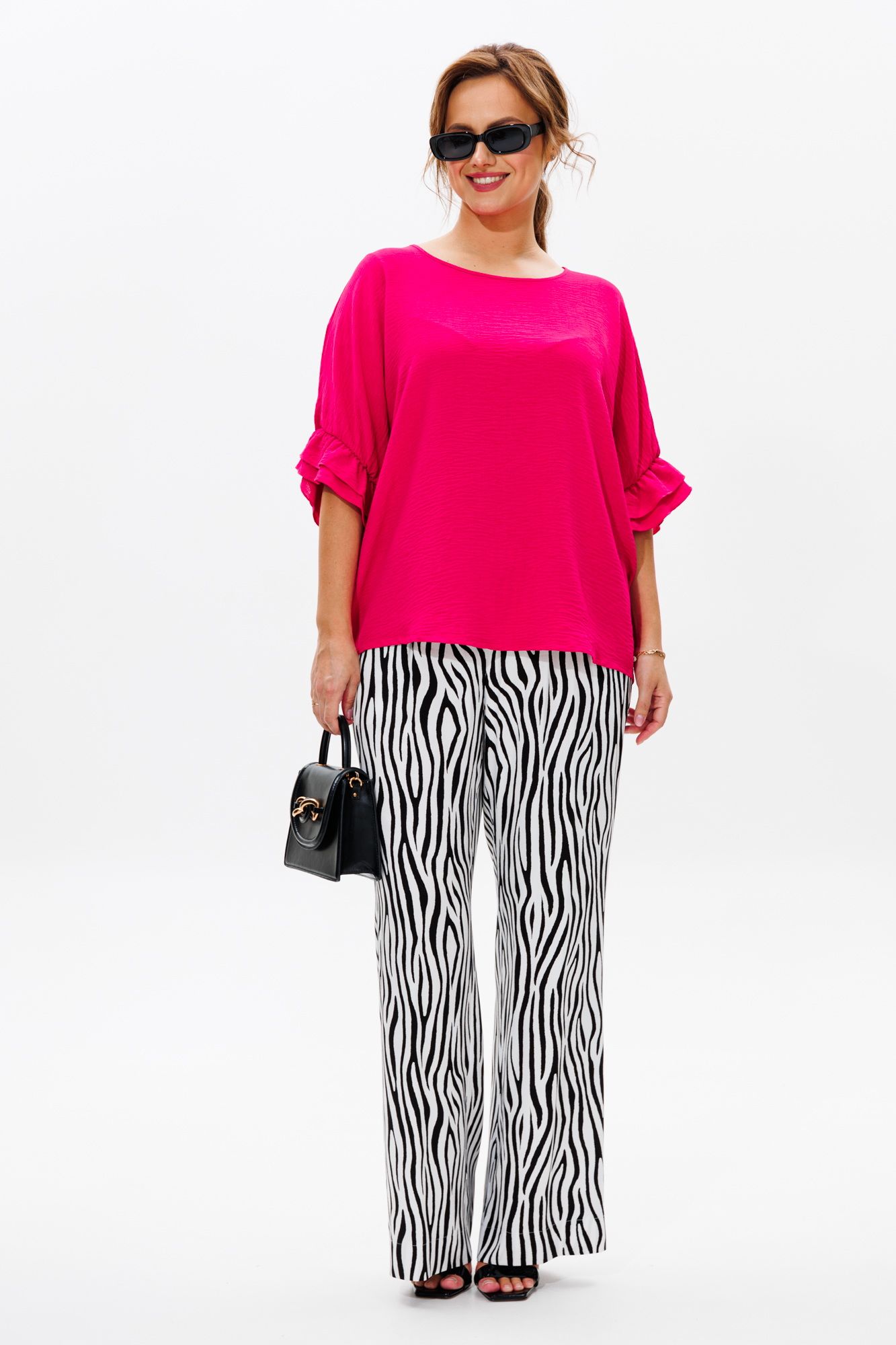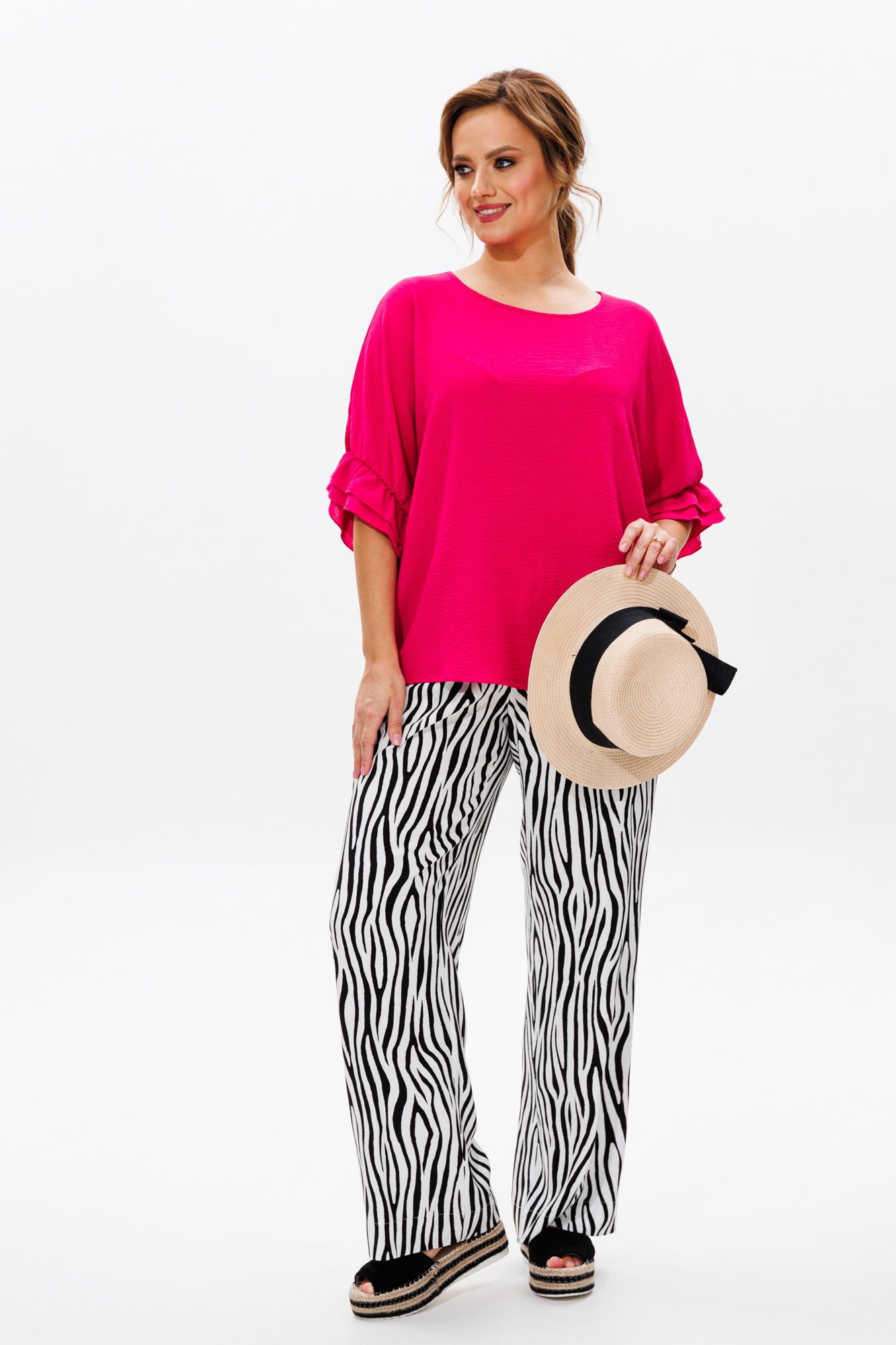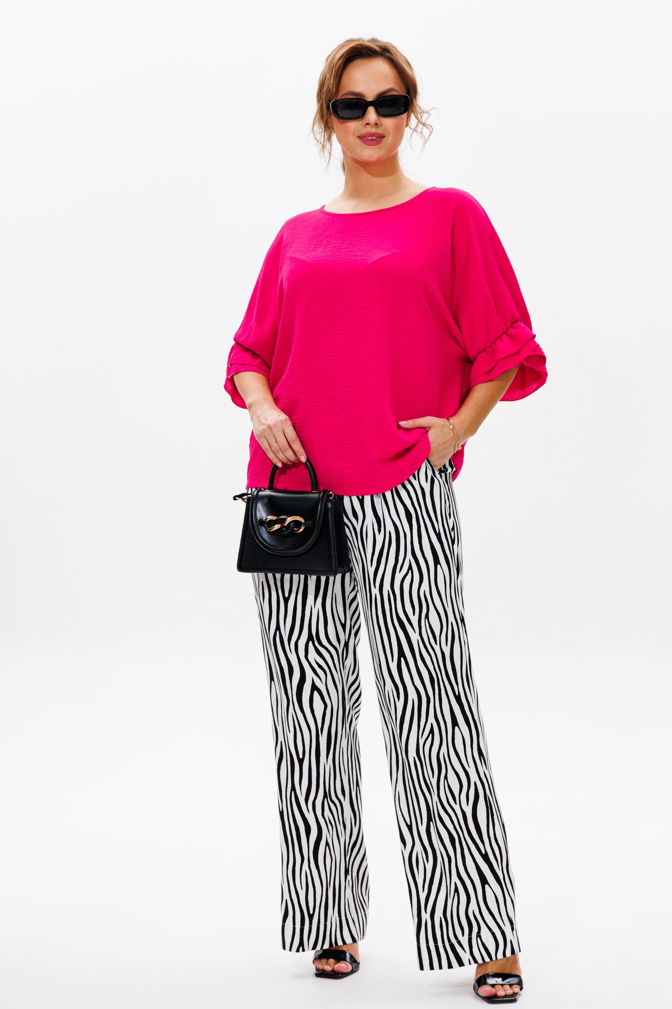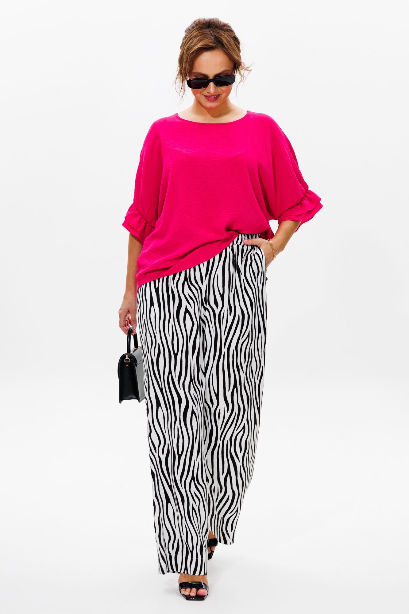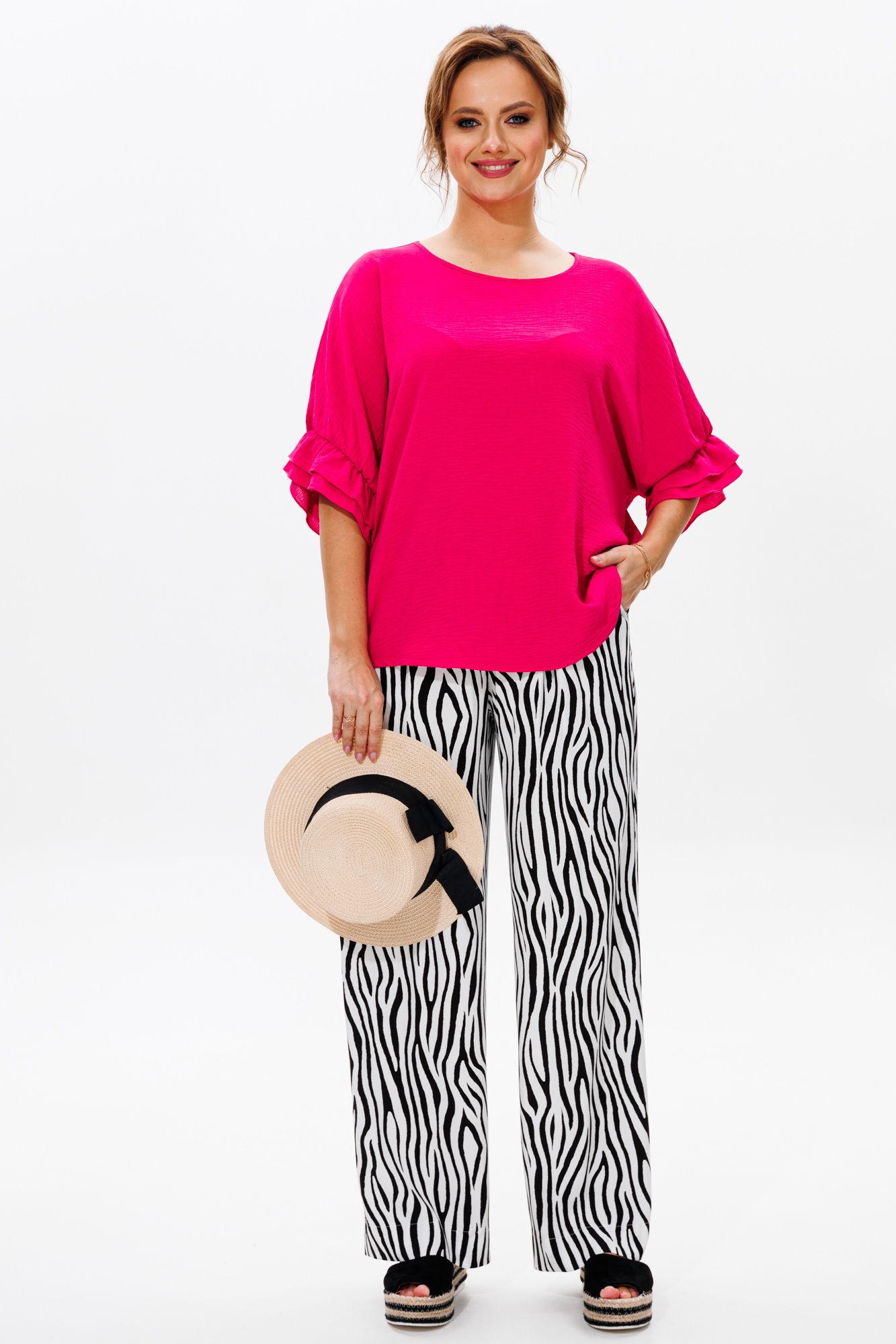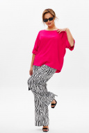 Стильный женский костюм, состоящий из блузы и брюк. Блуза прямого свободного силуэта со спущенной линией плеча, выполненная из блузочной ткани (тянется). Горловина округлой формы, обработана окантовкой. Спинка со средним швом. Низ рукава оформлен двумя волонами, присборенными на резинку. Длина блузы по среднему шву спинки – р48,50,52 – 63, р54,56,58 – 65 Длина рукава от горловины – р48,50,52 – 37, р54,56,58 – 38 Ширина рукава внизу с раст резинкой (макс) ½ - р48-26, р50-27, р52-28, р54-29, р56-30, р58-31 ОГ ½ - р48-64, р50-66, р52-68, р54-70, р56-72, р58-74 ОТ ½ - р48-61, р50-63, р52-65, р54-67, р56-69, р58-71 ОБ ½ - р48-62, р50-64, р52-66, р54-68, р56-70, р58-72 Брюки свободного прямого кроя с высокой посадкой, выполненные из легкой костюмной ткани (не тянется).В боковых швах наклонные карманы. Верхний срез оформлен поясом с эластичной резинкой. Длина брюк по боковому шву – р48,50,52 – 109, р54,56,58 – 111 Длина брюк по внутреннему шву во всех р-ах - 79 Ширина брюк внизу ½ - р48-28, р50-29, р52-30, р54-31, р56-32, р58-33 Высота посадки брюк спереди – р48,50,52 – 32, р54,56,58 – 34 Высота посадки брюк сзади – р48,50,52 – 46,5, р54,56,58 – 48,5 Обхват бедра ½ - р48-37, р50-38, р52-39, р54-40, р56-41, р58-42 ОТ с раст резинкой ½ - р48-55, р50-57, р52-59, р54-61, р56-63, р58-65 ОБ ½ - р48-56, р50-58, р52-60, р54-62, р56-64, р58-66