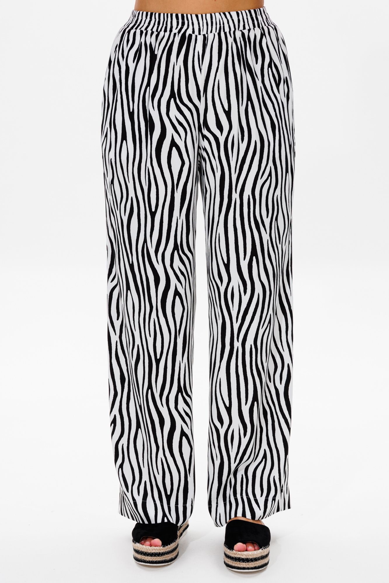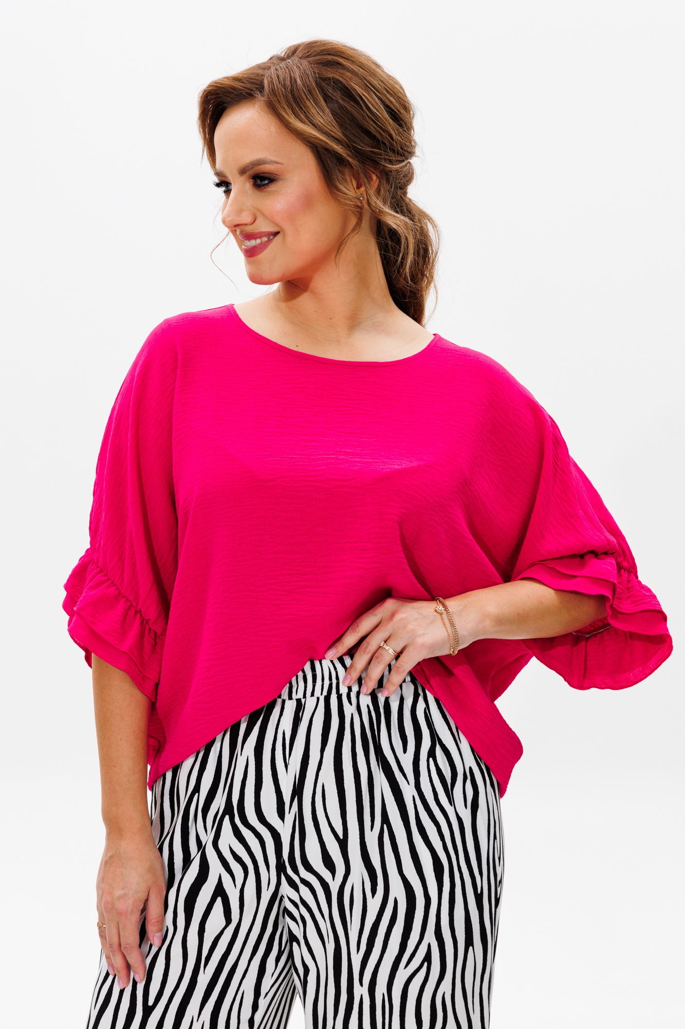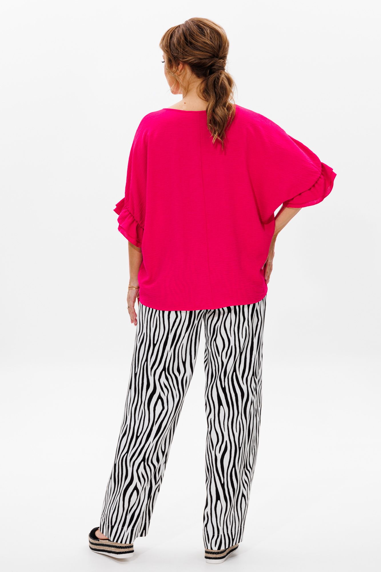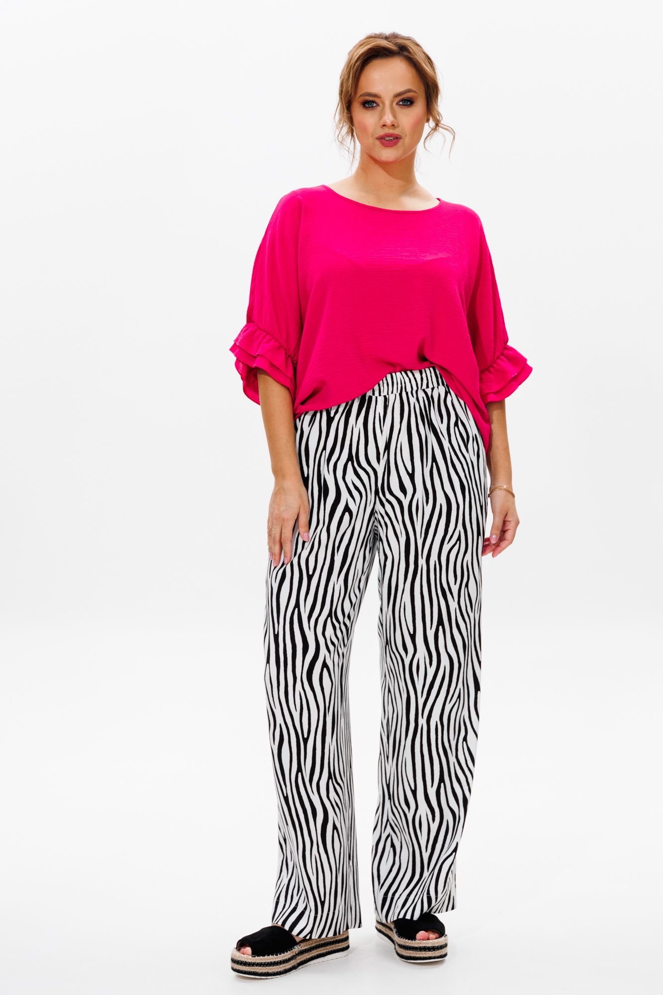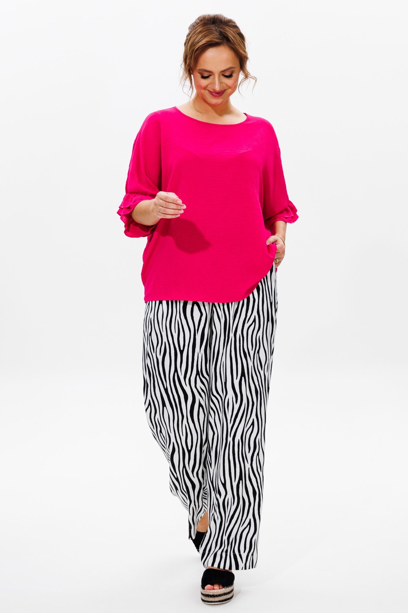 Стильный женский костюм, состоящий из блузы и брюк. Блуза прямого свободного силуэта со спущенной линией плеча, выполненная из блузочной ткани (тянется). Горловина округлой формы, обработана окантовкой. Спинка со средним швом. Низ рукава оформлен двумя волонами, присборенными на резинку. Длина блузы по среднему шву спинки – р48,50,52 – 63, р54,56,58 – 65 Длина рукава от горловины – р48,50,52 – 37, р54,56,58 – 38 Ширина рукава внизу с раст резинкой (макс) ½ - р48-26, р50-27, р52-28, р54-29, р56-30, р58-31 ОГ ½ - р48-64, р50-66, р52-68, р54-70, р56-72, р58-74 ОТ ½ - р48-61, р50-63, р52-65, р54-67, р56-69, р58-71 ОБ ½ - р48-62, р50-64, р52-66, р54-68, р56-70, р58-72 Брюки свободного прямого кроя с высокой посадкой, выполненные из легкой костюмной ткани (не тянется).В боковых швах наклонные карманы. Верхний срез оформлен поясом с эластичной резинкой. Длина брюк по боковому шву – р48,50,52 – 109, р54,56,58 – 111 Длина брюк по внутреннему шву во всех р-ах - 79 Ширина брюк внизу ½ - р48-28, р50-29, р52-30, р54-31, р56-32, р58-33 Высота посадки брюк спереди – р48,50,52 – 32, р54,56,58 – 34 Высота посадки брюк сзади – р48,50,52 – 46,5, р54,56,58 – 48,5 Обхват бедра ½ - р48-37, р50-38, р52-39, р54-40, р56-41, р58-42 ОТ с раст резинкой ½ - р48-55, р50-57, р52-59, р54-61, р56-63, р58-65 ОБ ½ - р48-56, р50-58, р52-60, р54-62, р56-64, р58-66