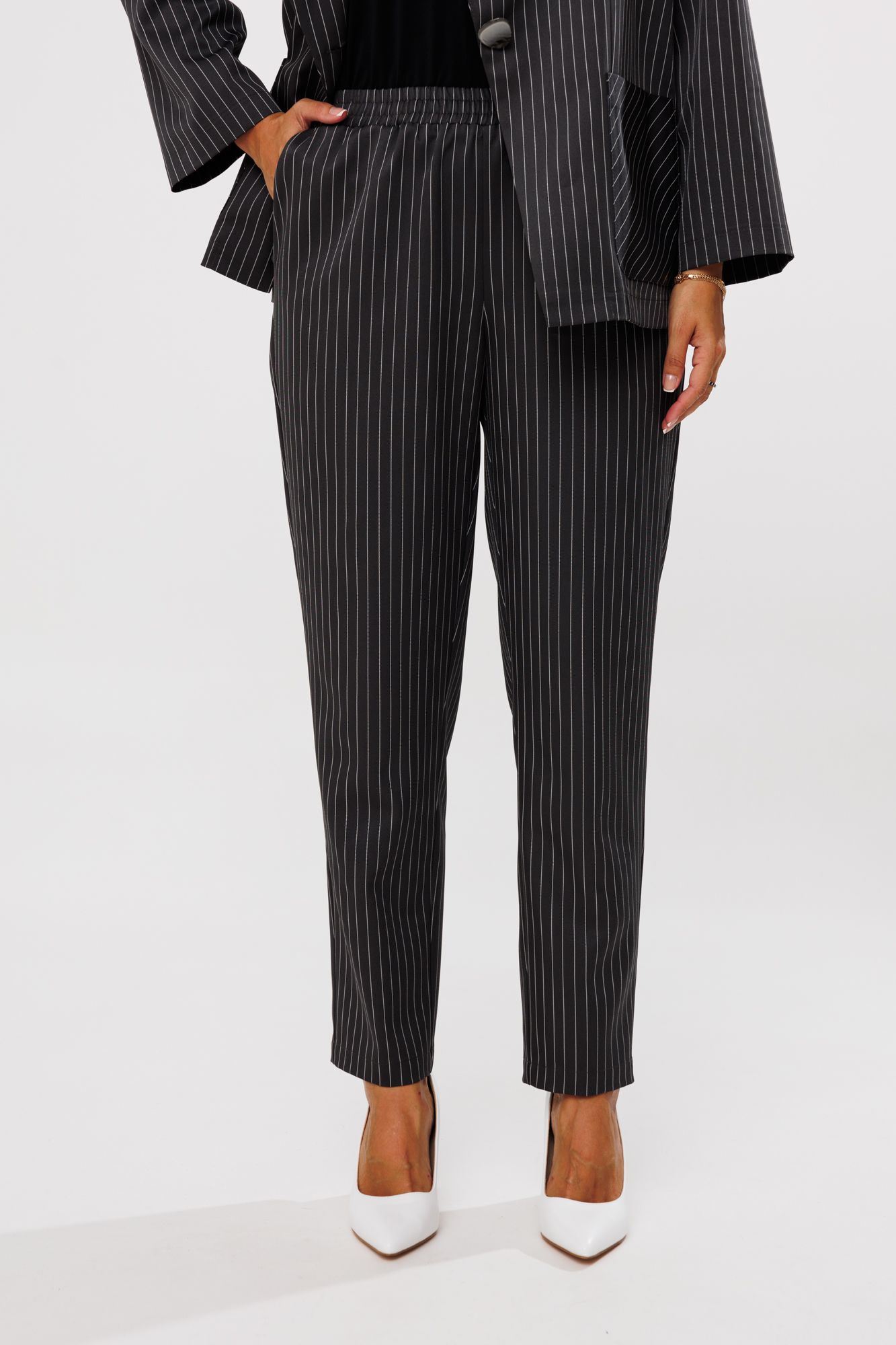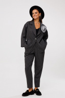 Костюм, состоящий из жакета и брюк, выполненных из костюмной ткани в полоску (чуть тянется). Жакет прямого силуэта со спущенной линией плеча. По переду нагрудная вытачка, накладные карманы, центральная застежка на одну петлю-пуговицу. Горловина оформлена воротником пиджачного типа с лацканом. Спинка со средним швом. Рукава одношовные, длиной 7/8. Жакет без подкладки, декорирован съемным цветком. Брюки зауженные к низу с высокой посадкой. В боковых швах наклонные карманы. Верхний срез оформлен поясом с эластичной резинкой.