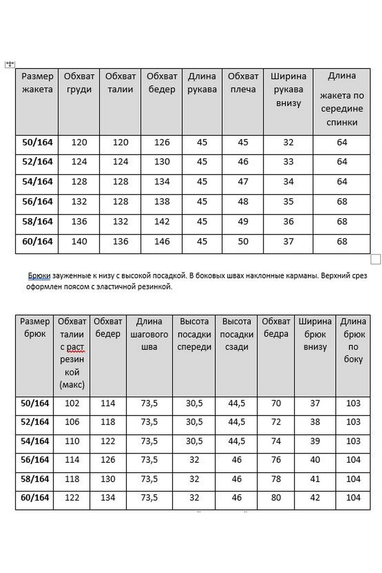 Здравствуйте. В 50 размере в готовом изделии: Жакет - ОБ 126 см., Брюки - ОБ 114 см. Замеры указаны в таблице на фото к модели. Ваша Bellavka 🔶