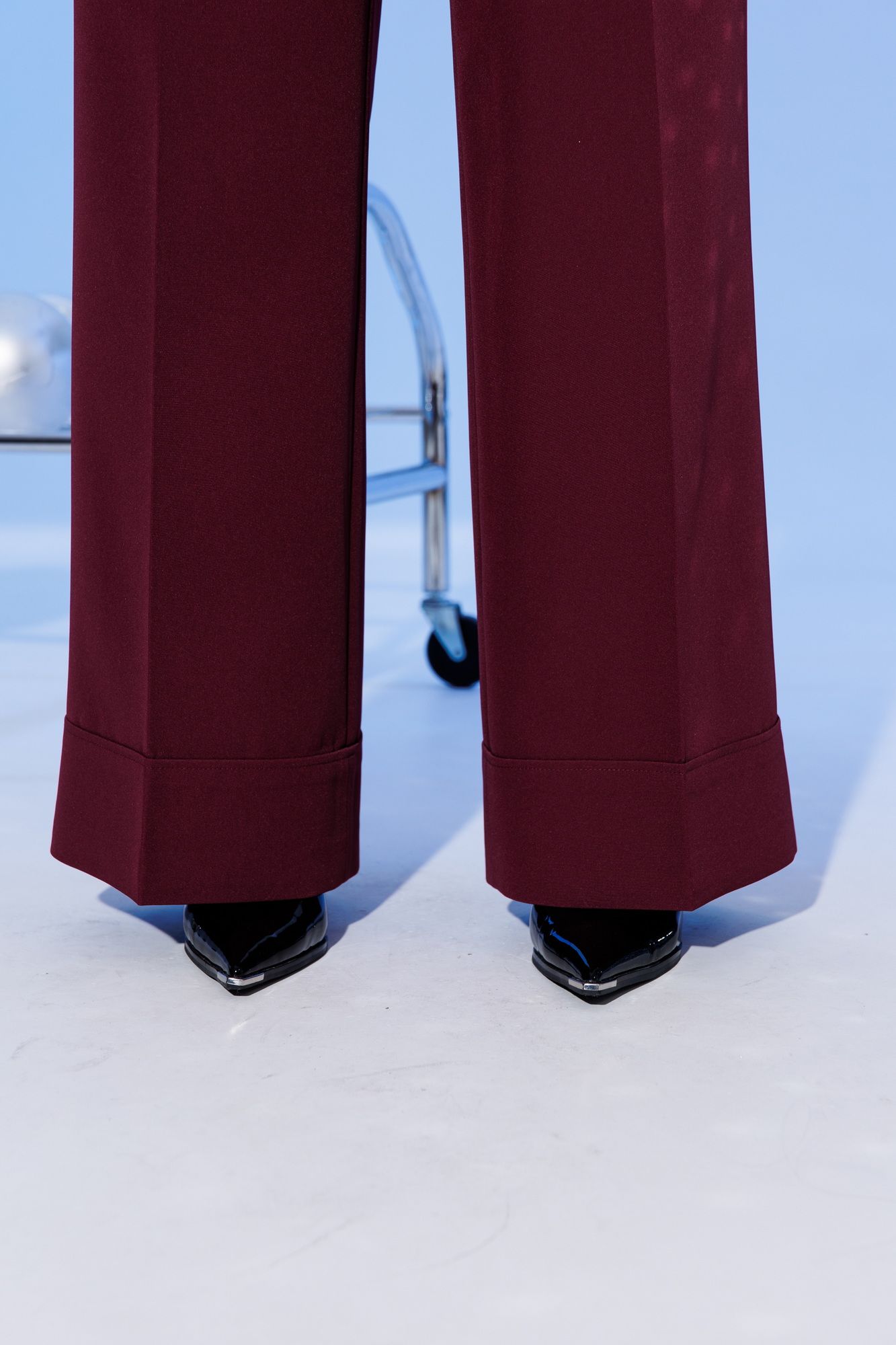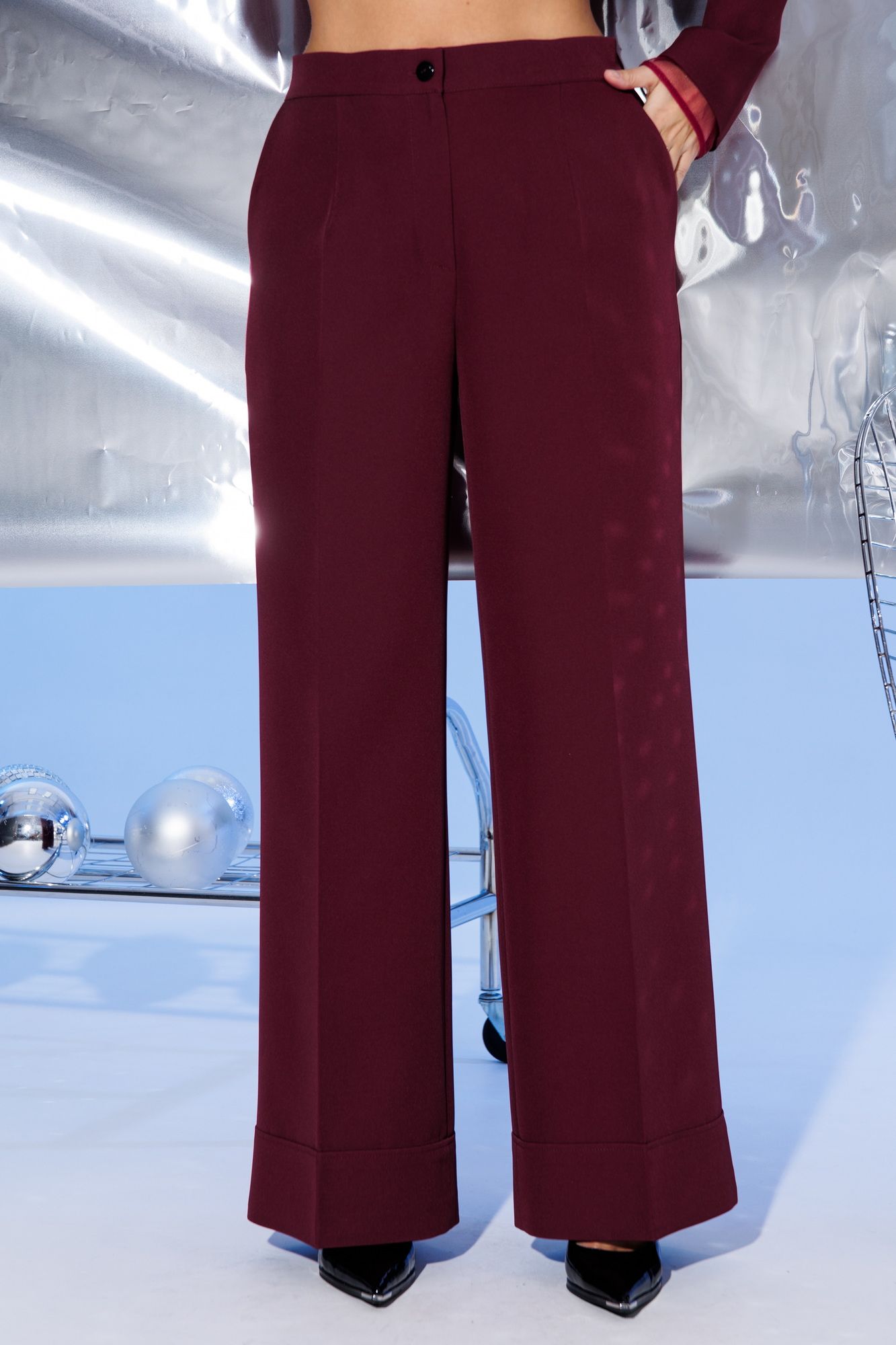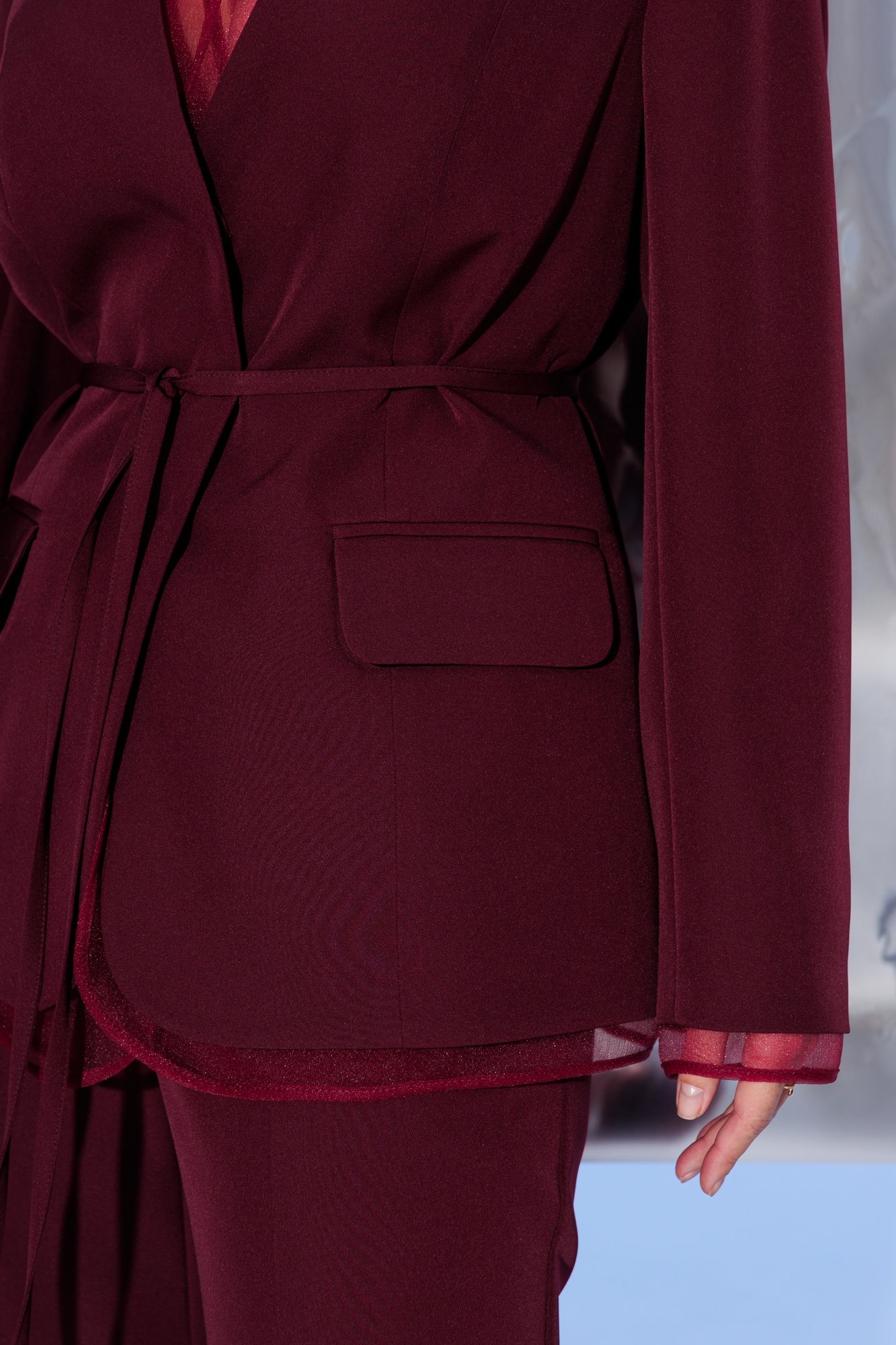 Нарядный женский костюм, состоящий из жакета и брюк, выполненные из костюмной ткани (тянется) с отделкой из органзы. Жакет полуприлегающего силуэта на подкладке. По переду рельефные швы, функциональные прорезные карманы в рамку с клапаном. Застежка центральная на 2 пришивные кнопки. Горловина V-образной формы. Спинка со средним швом, шлицей и рельефными швами. Рукава втачные, двухшовные. Жакет декорирован отделочными клапанами из органзы: по борту, низу и рукаву. В комплект входит пояс из основной ткани. Брюки прямого, свободного кроя с высокой посадкой, с наклонными карманами в боковых швах, по срезу банта – застежка-молния. По передним половинкам талиевые вытачки. По низу брюотрезные манжеты.