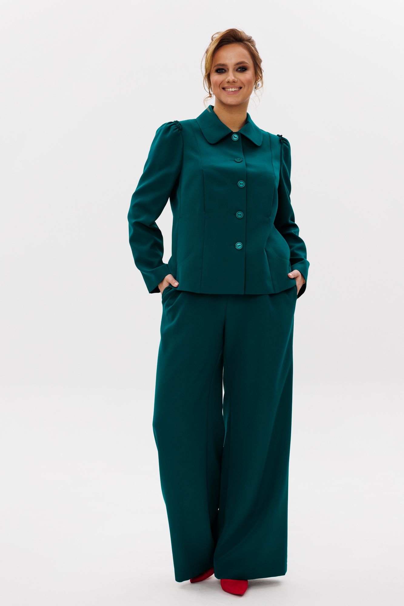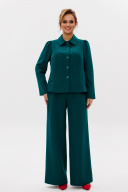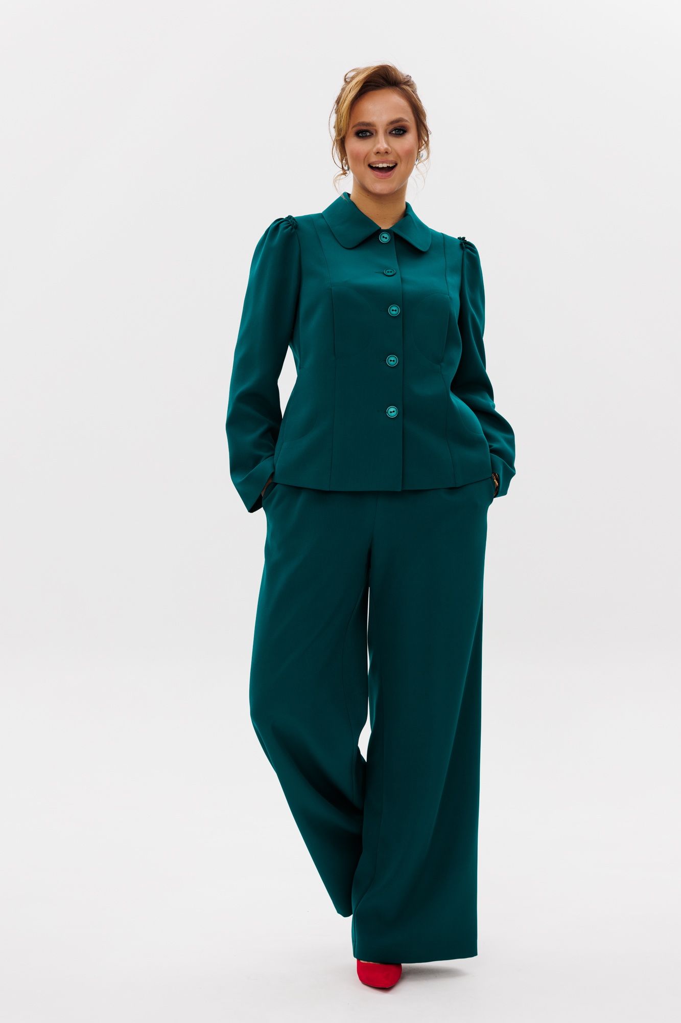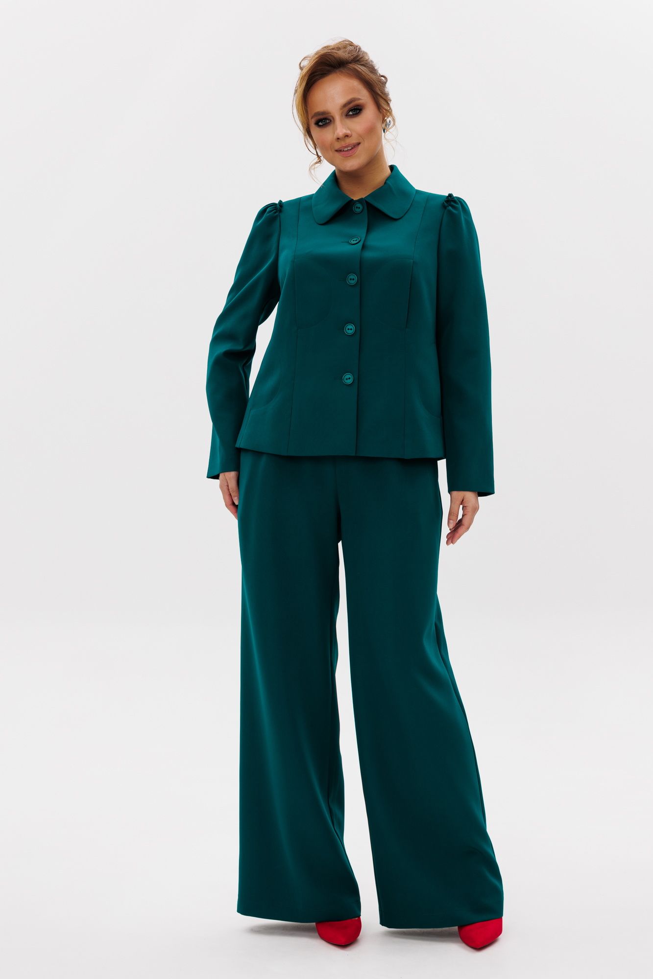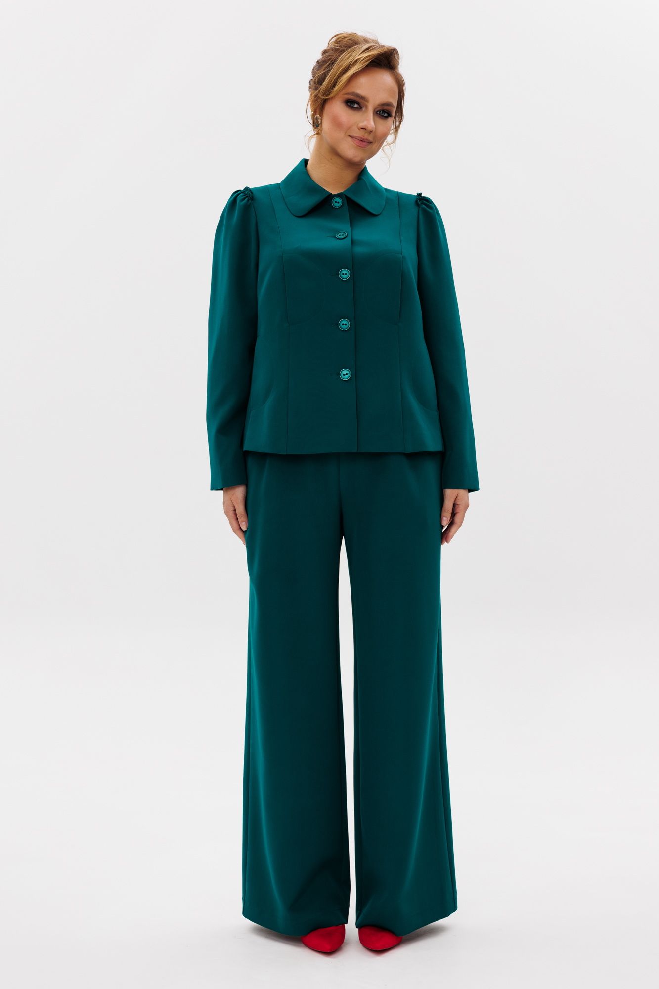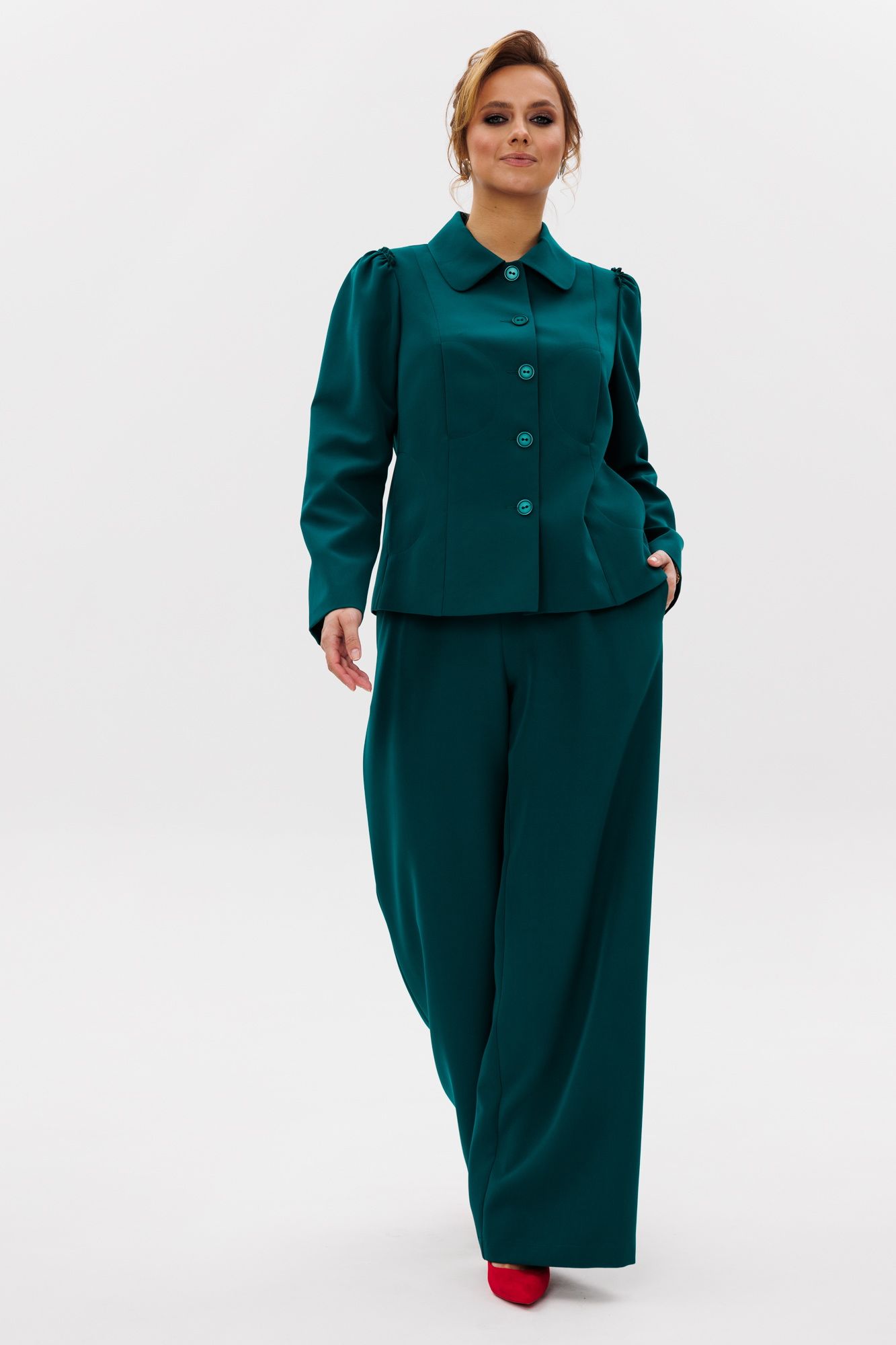 Стильный женский костюм, состоящий из жакета и брюк, выполнен из костюмной ткани (тянется). Жакет полуприлегающего силуэта на подкладке. По переду рельефные швы, отрезной бочок, функциональные карманы в рельефных швах, фигурные отделочные строчки. Застежка центральная на петли-пуговицы. Спинка с рельефными и средним швами. Горловина оформлена рубашечным воротником. Рукава втачные одношовные с присборенным окатом в виде рюши. Брюки свободного прямого кроя с высокой посадкой. В боковых швах функциональные карманы. Верхний срез оформлен поясом с эластичной резинкой.
