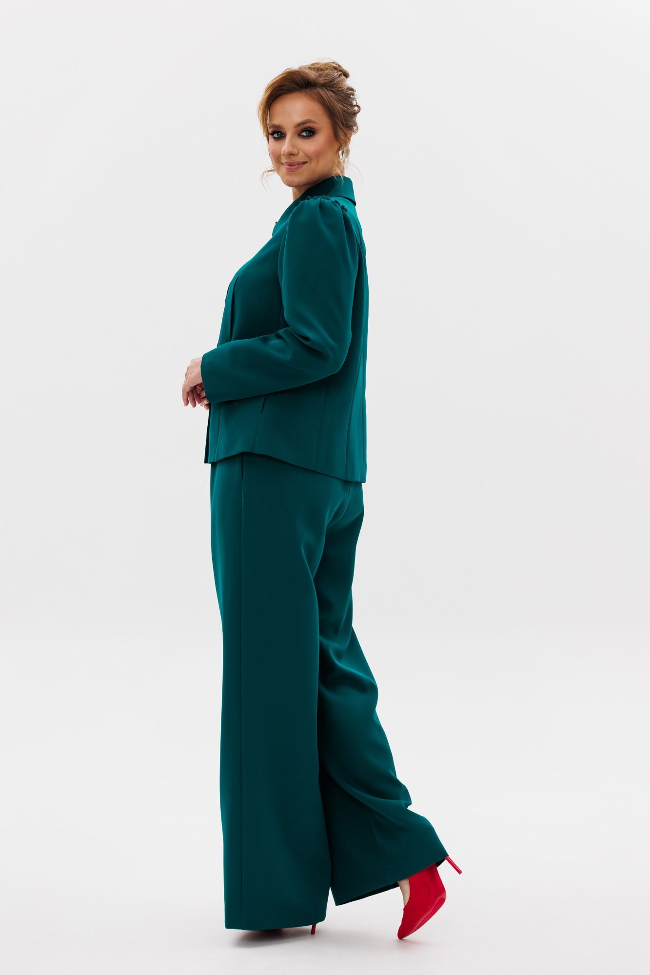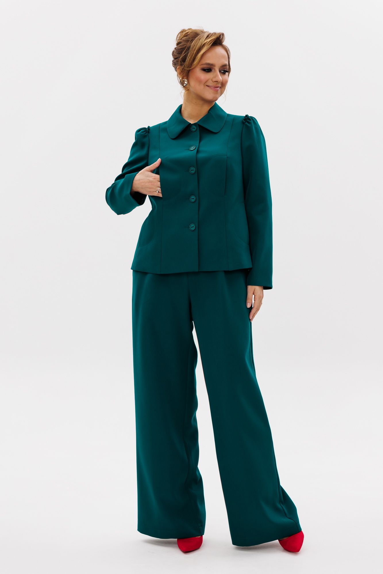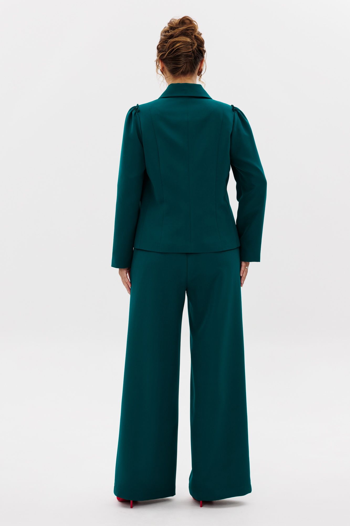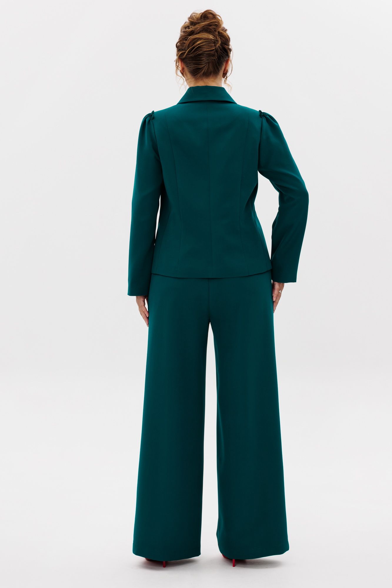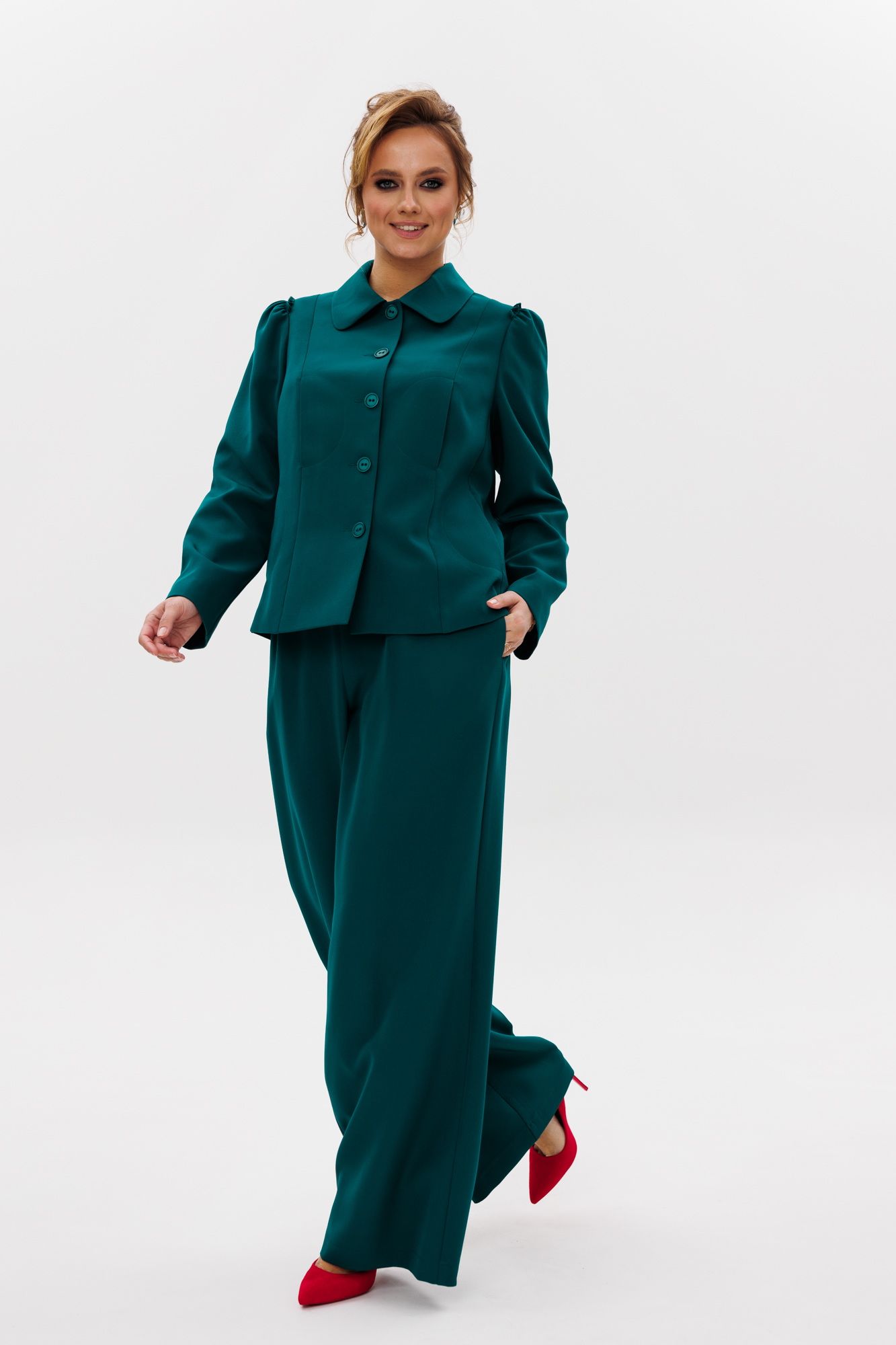 Стильный женский костюм, состоящий из жакета и брюк, выполнен из костюмной ткани (тянется). Жакет полуприлегающего силуэта на подкладке. По переду рельефные швы, отрезной бочок, функциональные карманы в рельефных швах, фигурные отделочные строчки. Застежка центральная на петли-пуговицы. Спинка с рельефными и средним швами. Горловина оформлена рубашечным воротником. Рукава втачные одношовные с присборенным окатом в виде рюши. Брюки свободного прямого кроя с высокой посадкой. В боковых швах функциональные карманы. Верхний срез оформлен поясом с эластичной резинкой.
