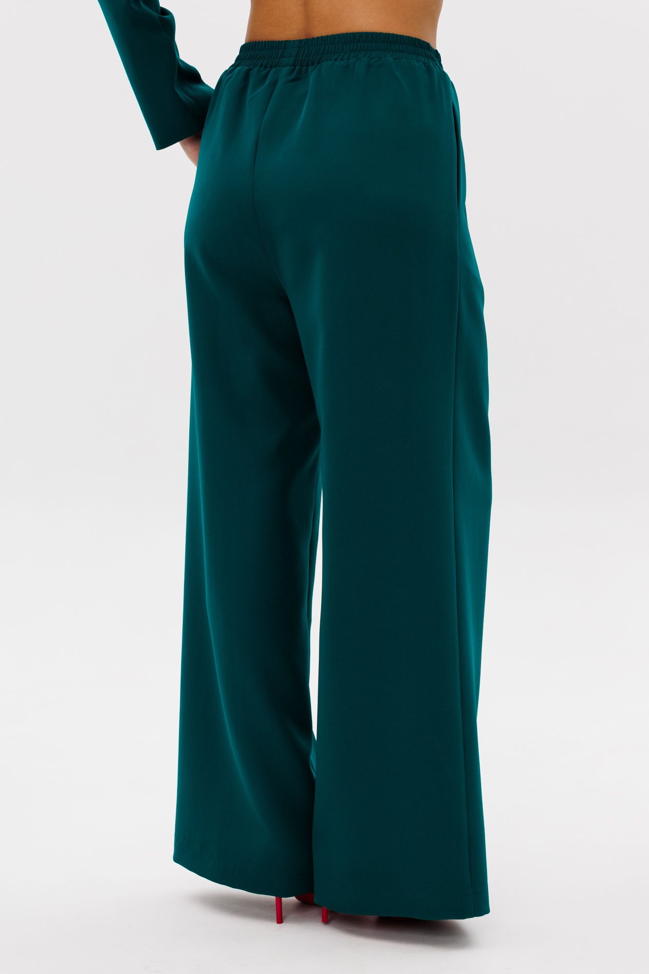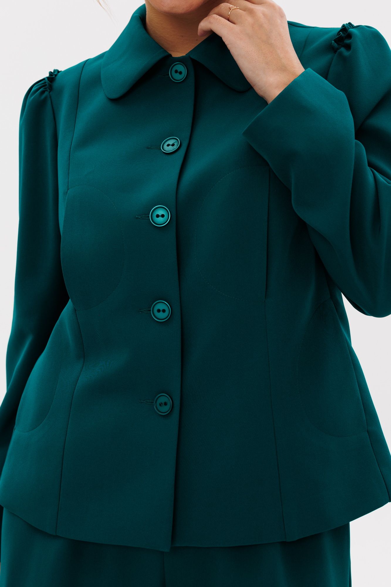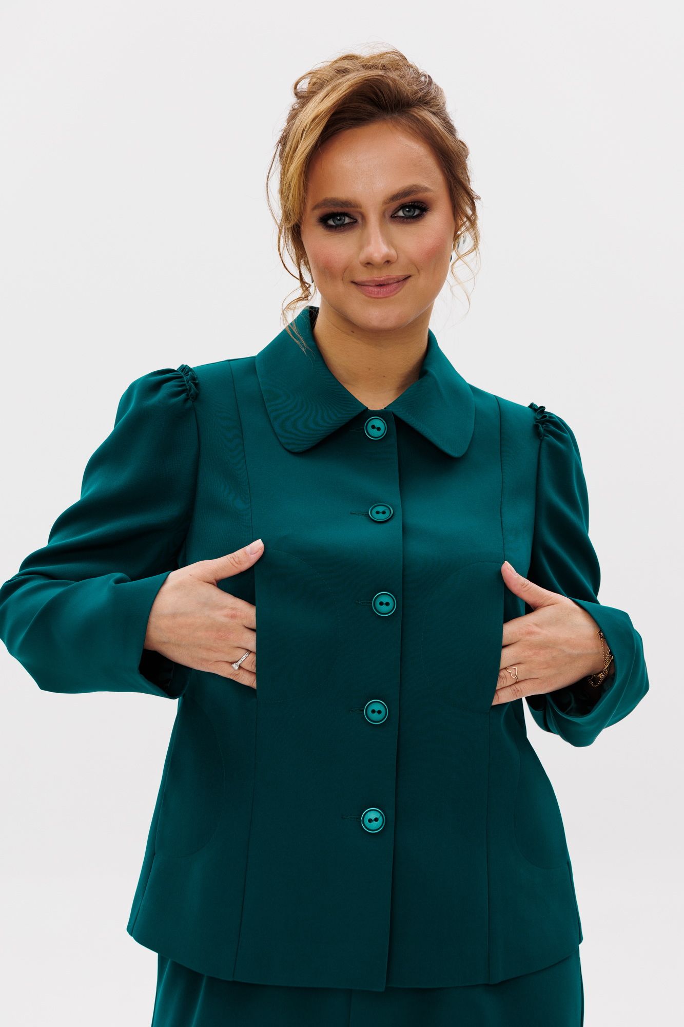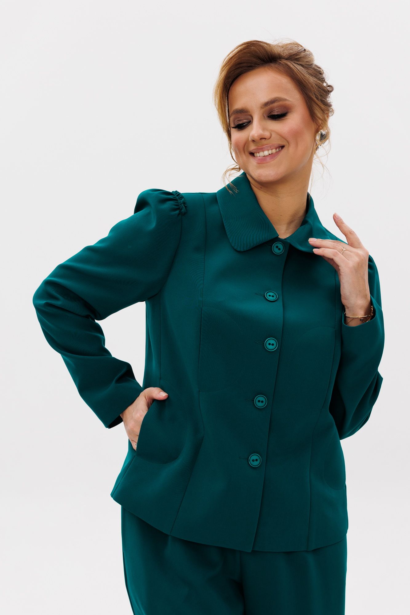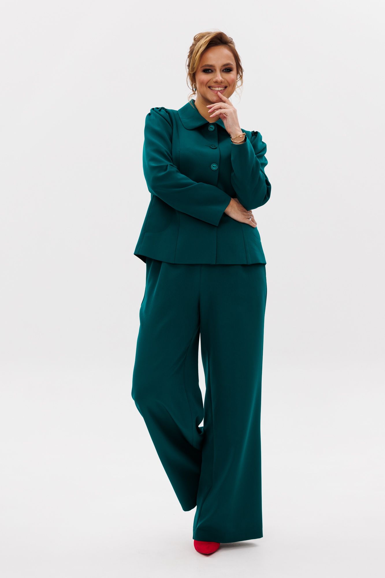 Стильный женский костюм, состоящий из жакета и брюк, выполнен из костюмной ткани (тянется). Жакет полуприлегающего силуэта на подкладке. По переду рельефные швы, отрезной бочок, функциональные карманы в рельефных швах, фигурные отделочные строчки. Застежка центральная на петли-пуговицы. Спинка с рельефными и средним швами. Горловина оформлена рубашечным воротником. Рукава втачные одношовные с присборенным окатом в виде рюши. Брюки свободного прямого кроя с высокой посадкой. В боковых швах функциональные карманы. Верхний срез оформлен поясом с эластичной резинкой.