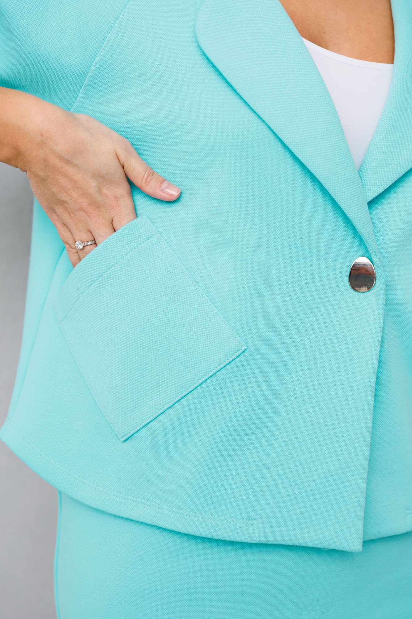 Жакет прямого силуэта без подкладки, выполнен из трикотажного полотна (тянется). По переду накладные карманы, центральная застежка на кнопку и отделочную пуговицу. Горловина оформлена воротником пиджачного типа с лацканом. Рукава покроя «Реглан» с отложными манжетами. Юбка заужена к низу на трикотажной подкладке. По заднему полотнищу средний шов, переходящий в разрез. Верхний срез оформлен поясом с эластичной резинкой.