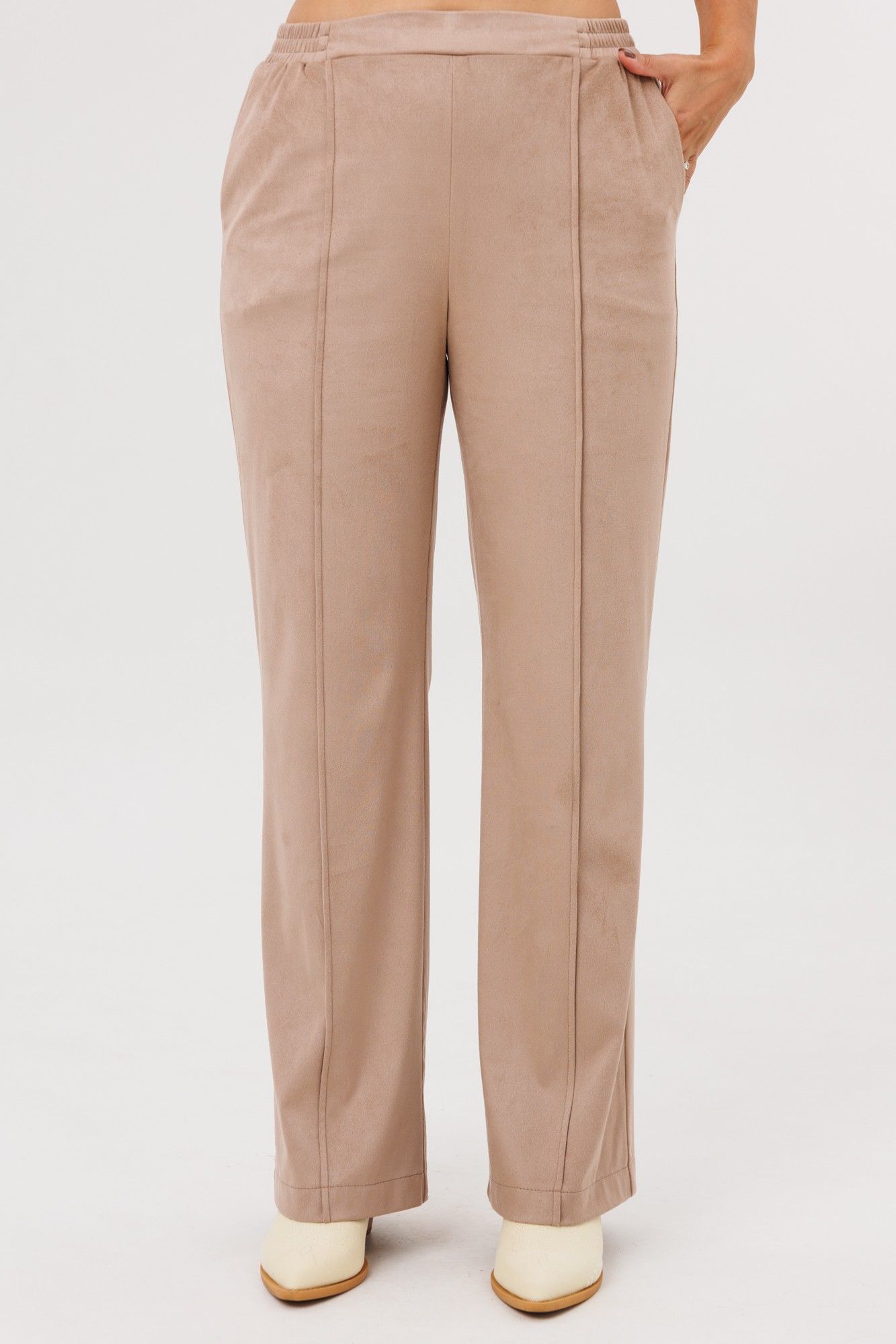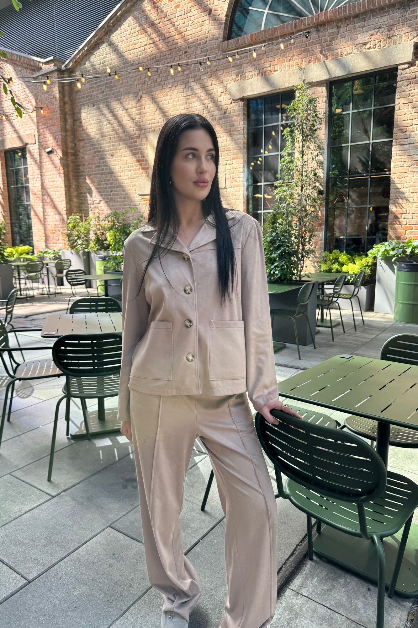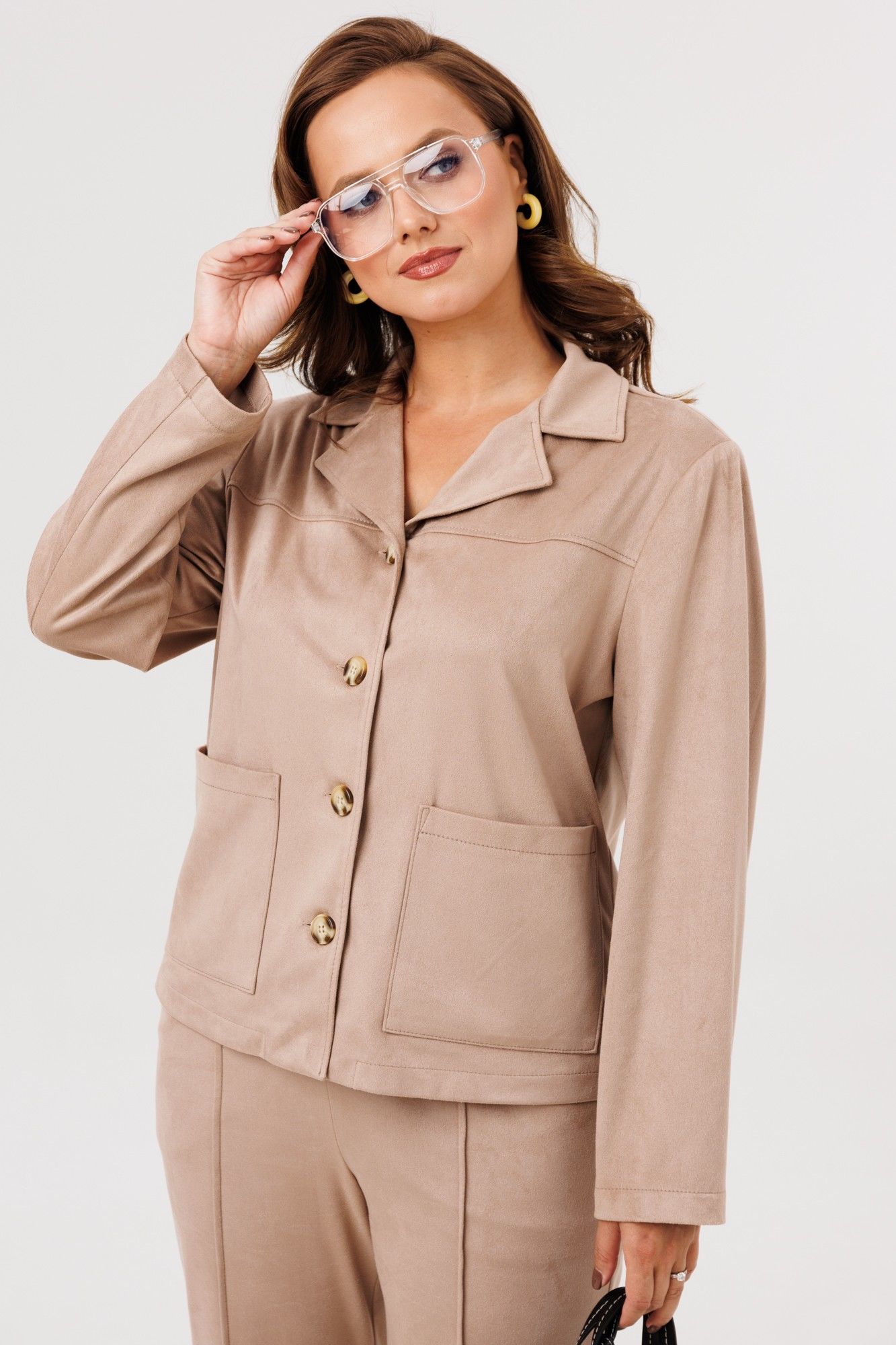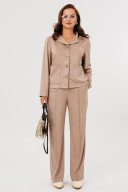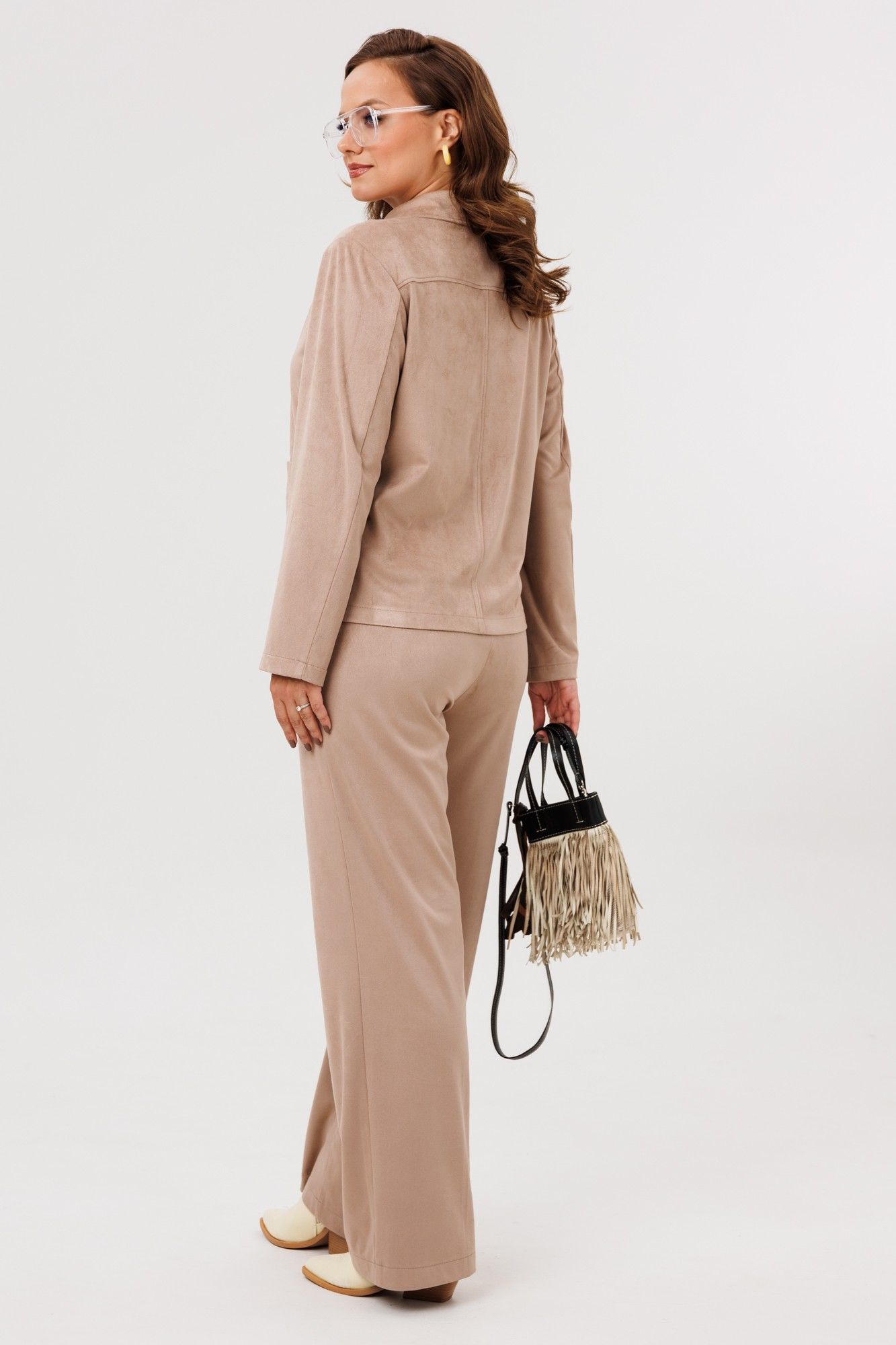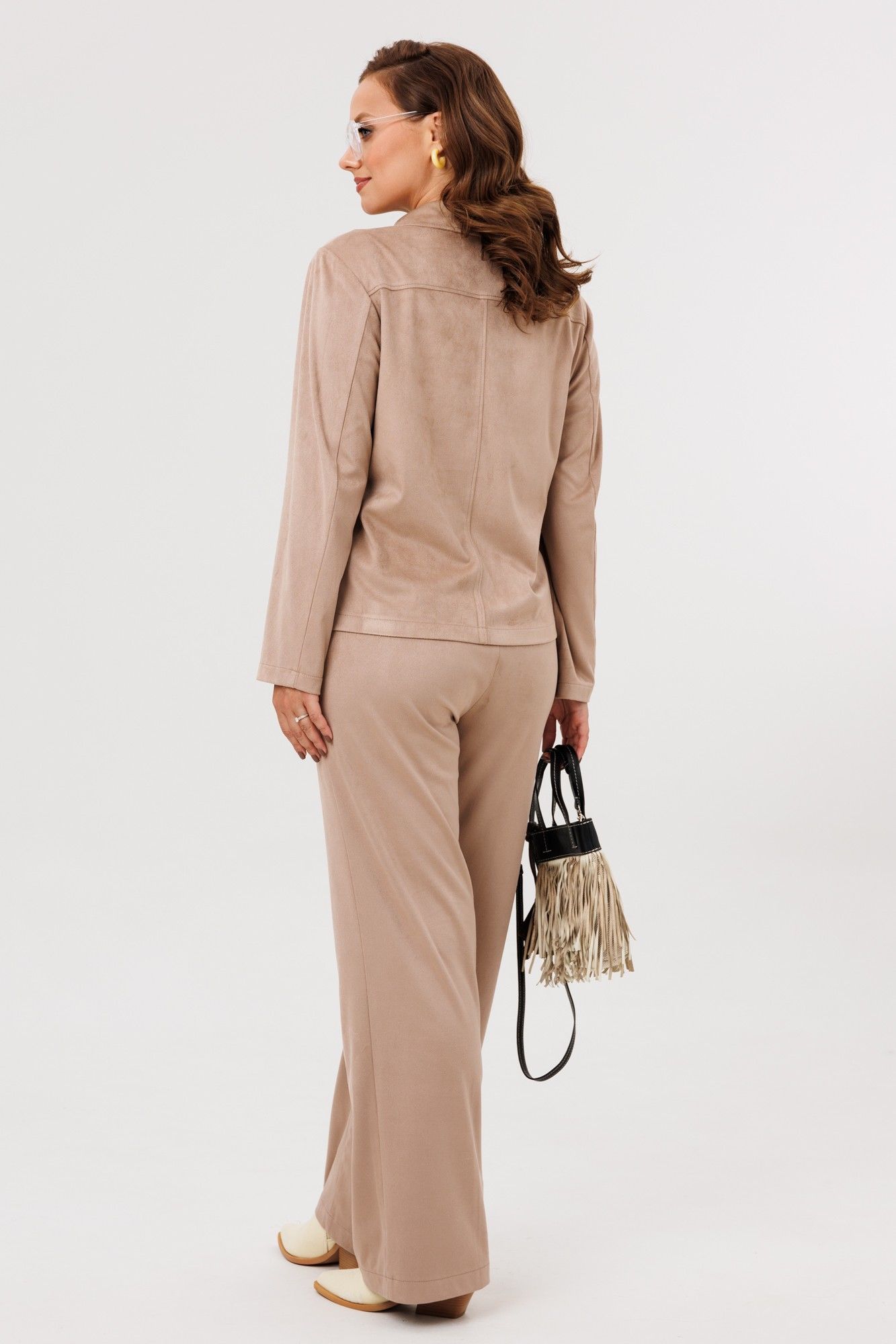 Стильный женский костюм, состоящий из жакета и брюк, выполненный из костюмной ткани «Замша» (тянется). Полотно мягкое, очень комфортное. Жакет прямого силуэта со спущенной линией плеча. По переду отрезные кокетки, накладные карманы. Застежка центральная на петли-пуговицы. Горловина оформлена воротником пиджачного типа с лацканом. Спинка с отрезной кокеткой, нижняя часть со средним швом. Рукава втачные, двухшовные. Жакет без подкладки. Брюки прямого кроя с высокой посадкой. По передним половинкам вертикальная застроченная складка на 0,5 см, в боковых швах наклонные карманы. Верхний срез оформлен поясом с эластичной резинкой.