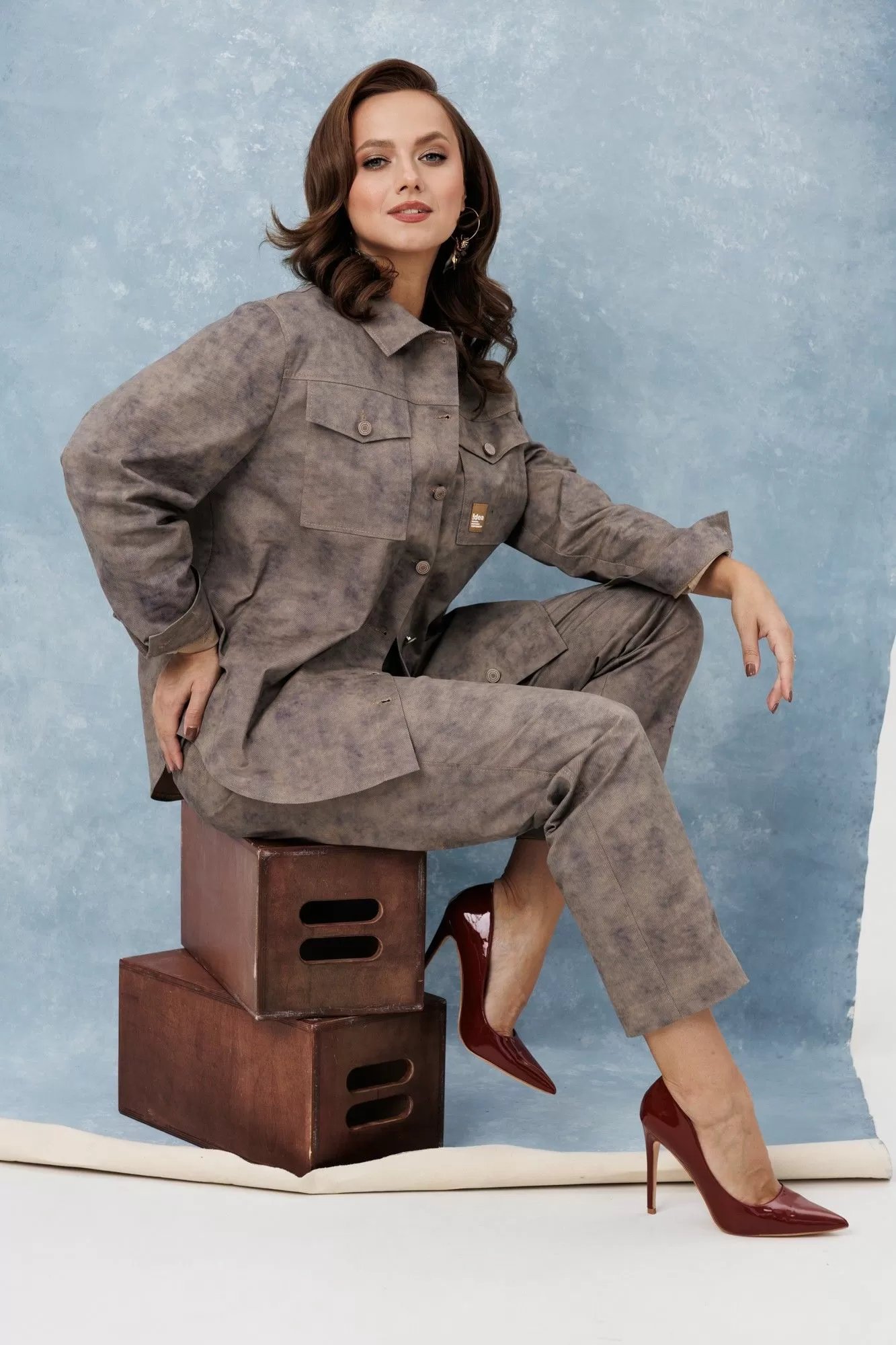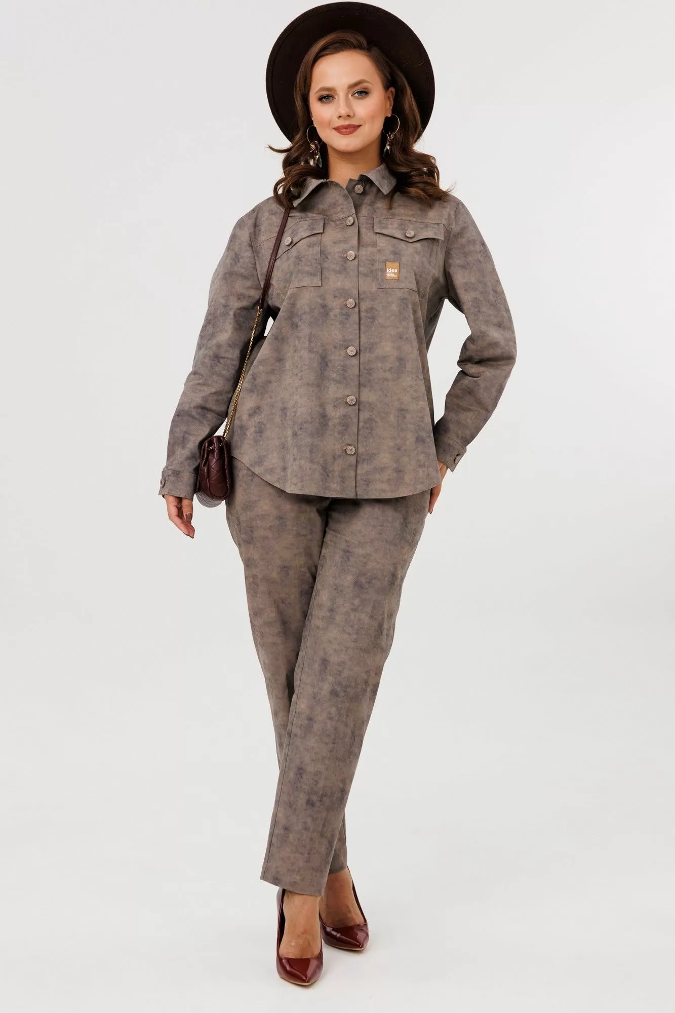 Стильный женский костюм состоит из рубашки и брюк, который выполнен из джинсовой ткани (не тянется). Рубашка прямого силуэта со спущенной линией плеча. По переду отрезные кокетки, в шов которых вставлен клапан, накладные карманы. По левому карману – пришивной лейбл. Застежка центральная на петли-пуговицы. Спинка с отрезной кокеткой, нижняя часть со средним швом. Рукава втачные, двухшовне, по низу с притачной манжетой, застегивающейся на пуговицу. Воротник отложной, рубашечного типа. По боковым швам разрезы, низ прямой, разноуровневый.