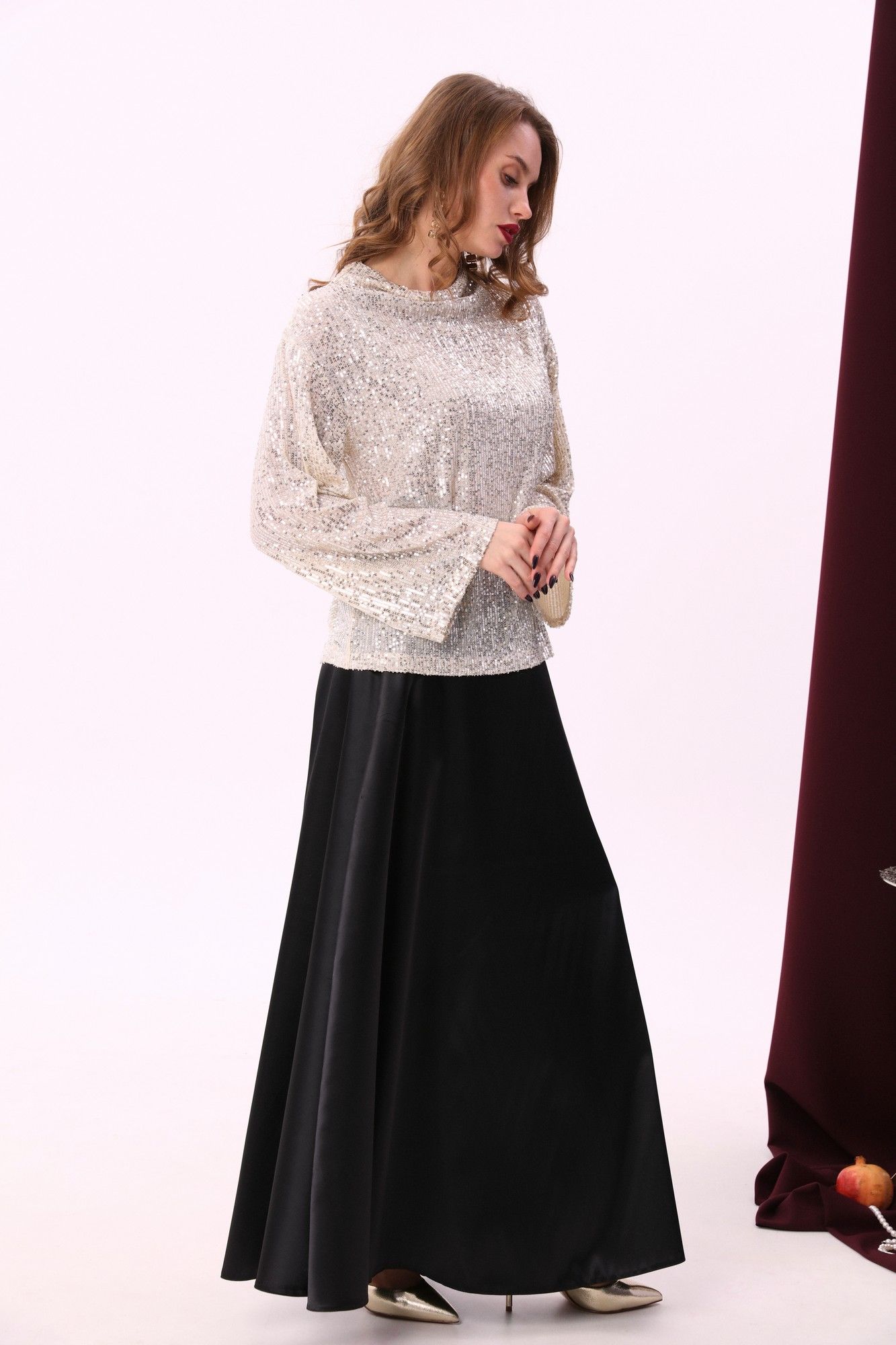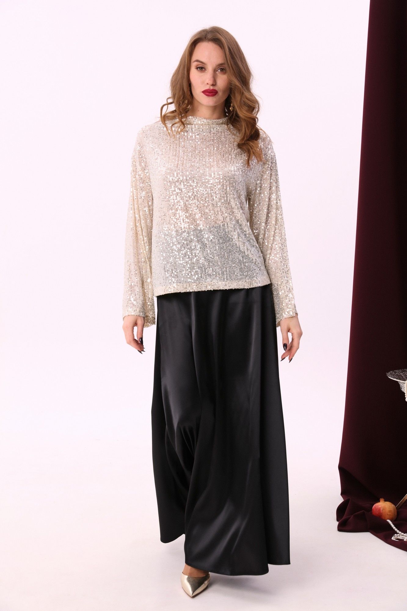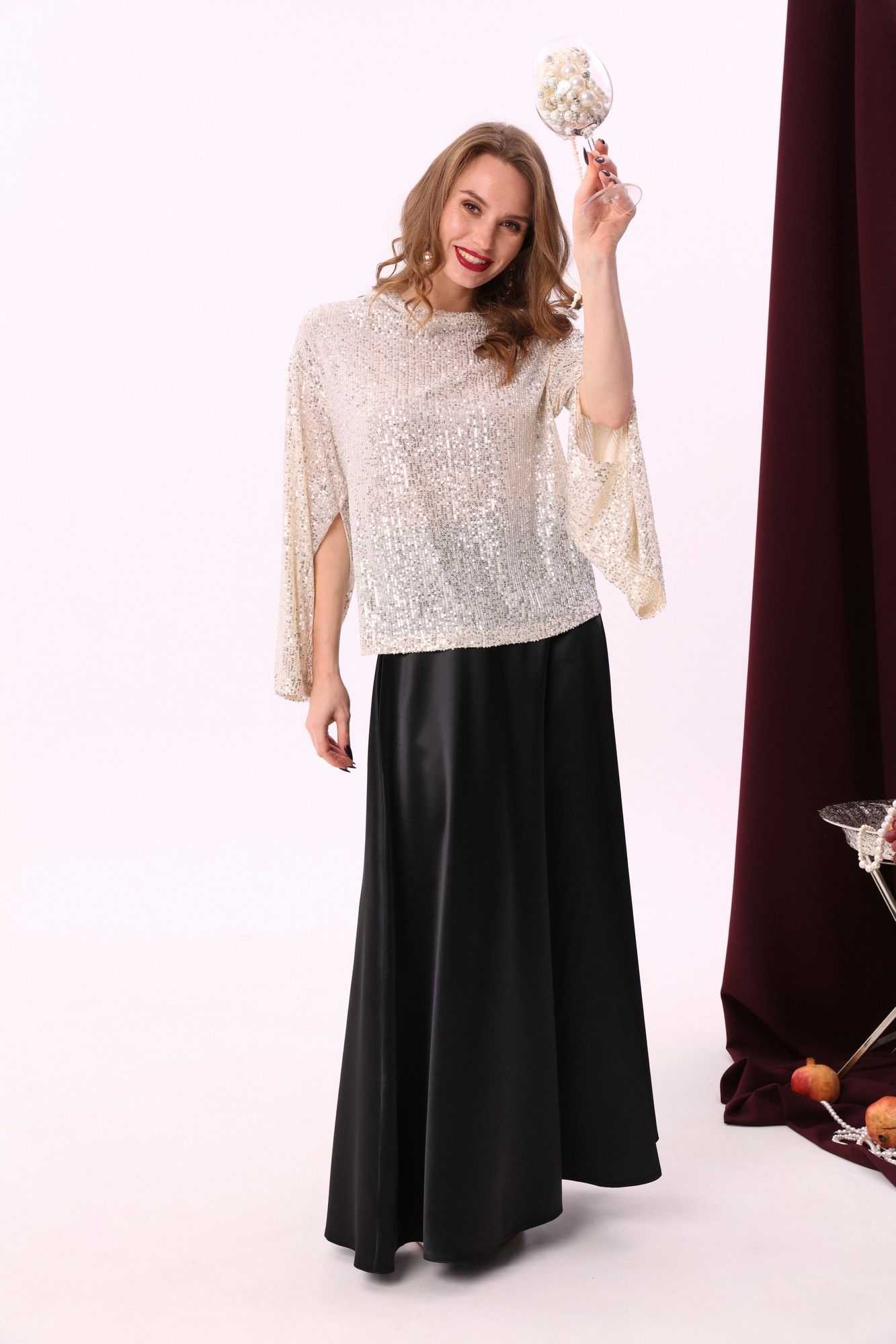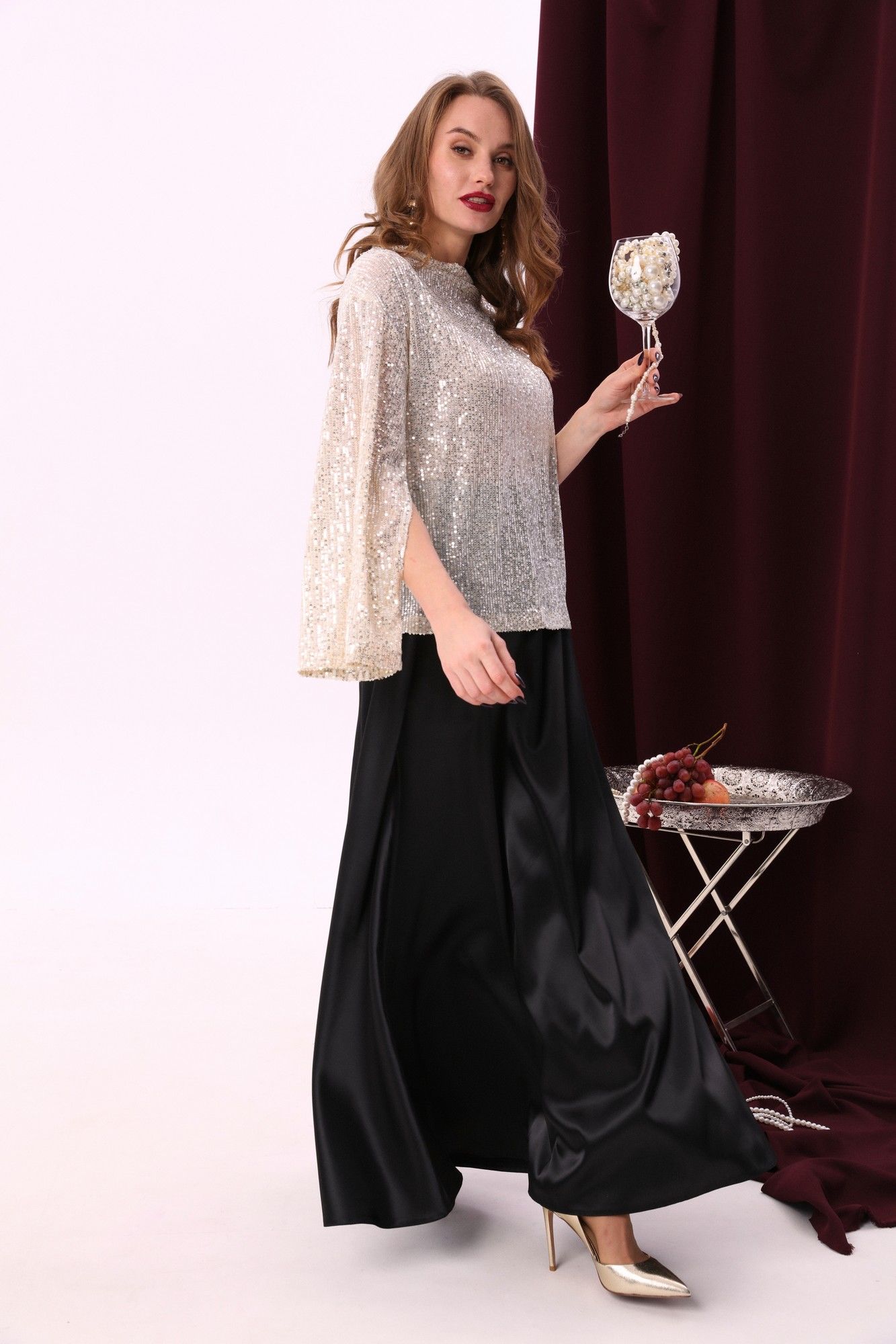 Элегантный джемпер-кейп прямого свободного силуэта с спайетками. Горловина с цельнокроеным воротником-стойкой. Рукав втачной широкий, от линии локтя до запястья есть дополнительное отверстие для рук.