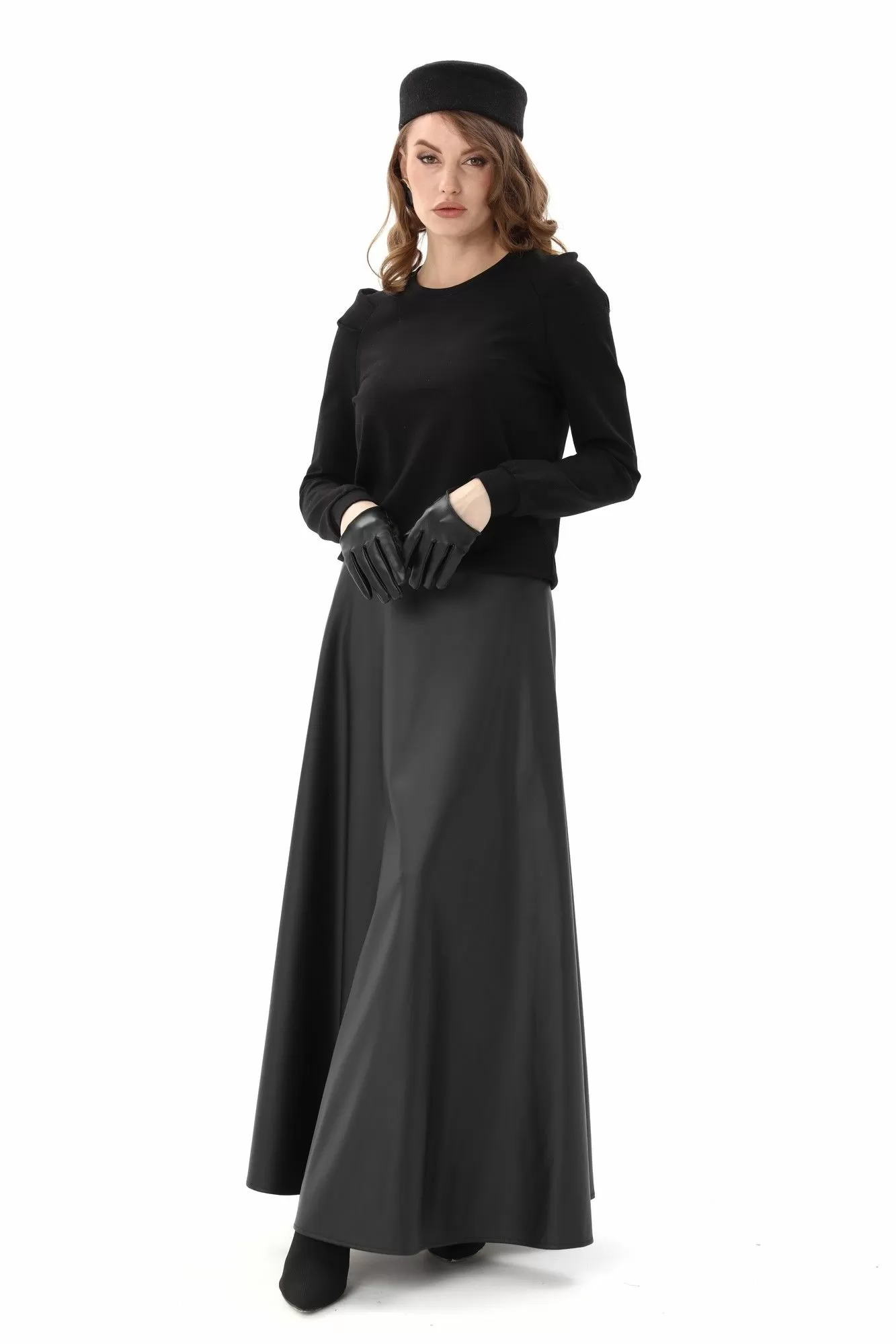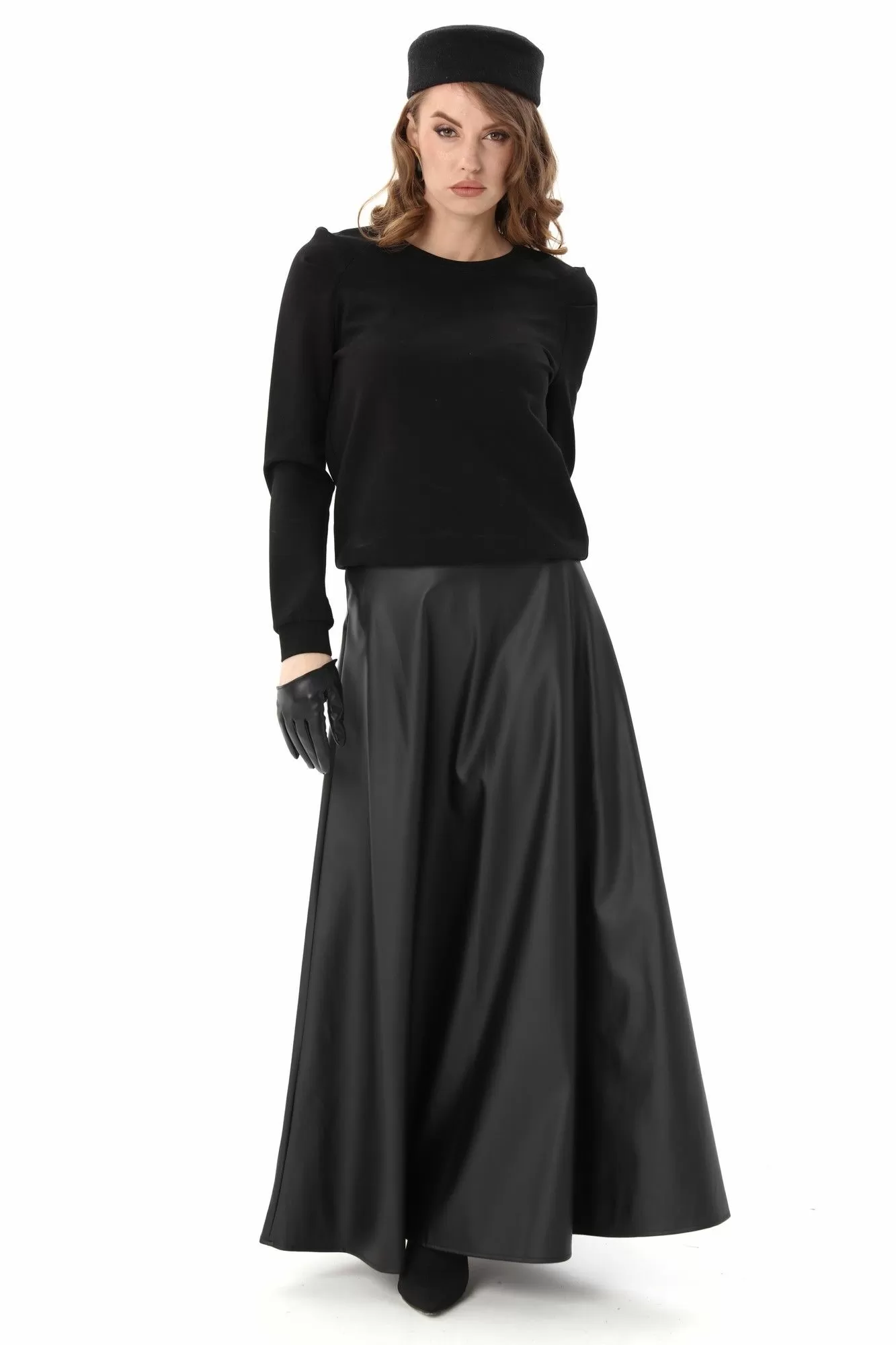 Костюм двухпредметный: состоит из джемпера и юбки. Уютный джемпер с округлой горловиной. Защипы на рукаве-реглане делают образ максимально женственным и элегантным. На рукавах есть съёмные авторские украшения в виде цветка из основной ткани. Юбка - солнце макси с узким поясом. В боковых швах расположены карманы. Застёжка на петлю и пуговицу и молнию по спинке.