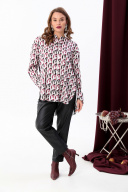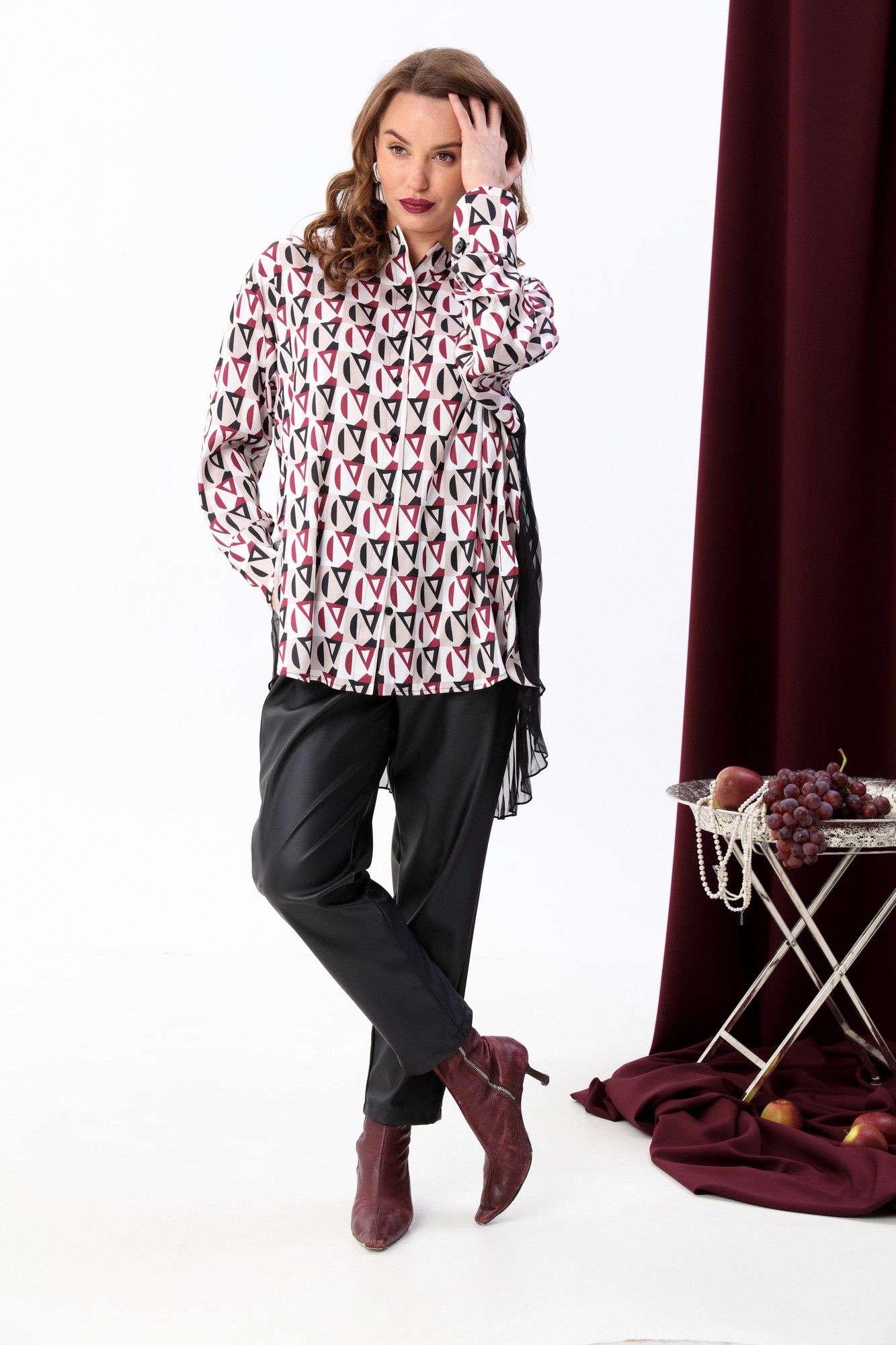 Блуза свободного кроя с округлым вырезом горловины. Центральная застёжка на петли и пуговицы. Рукав втачной одношовный спущенный с притачной манжетой на петлю и пуговицу. Спинка с отрезной кокеткой, нижняя часть спинки декорирована плиссированным шифоном. Низ изделия фигурный. Боковые швы с разрезами.