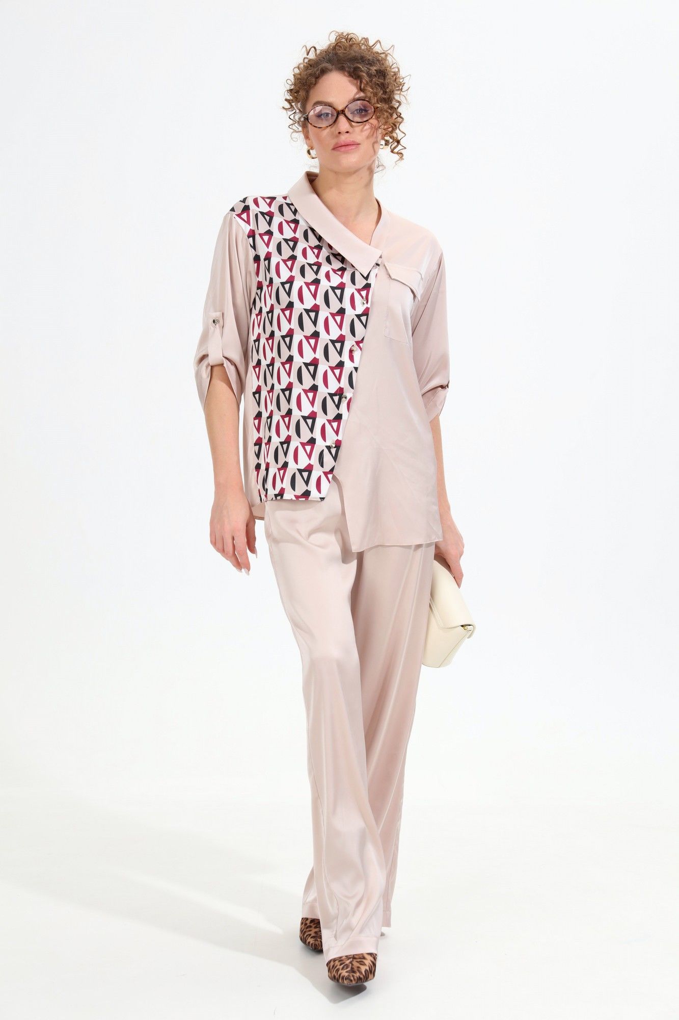 Костюм двухпредметный: состоит из жакета и брюк. Жакет рубашечного типа прямого силуэта с асимметричным низом. Рукав втачной со спущенной линией плеча, фиксируется на пату. Застежка центральная на петли и пуговицы, смещённая по косой. На левой полочке накладной карман с клапаном. Воротник отложной на стойке до половины спинки. Брюки свободного кроя из гладкой ткани сочетают элегантность и комфорт. Широкая резинка на поясе и наличие функциональных карманов подчеркивают удобство модели.
