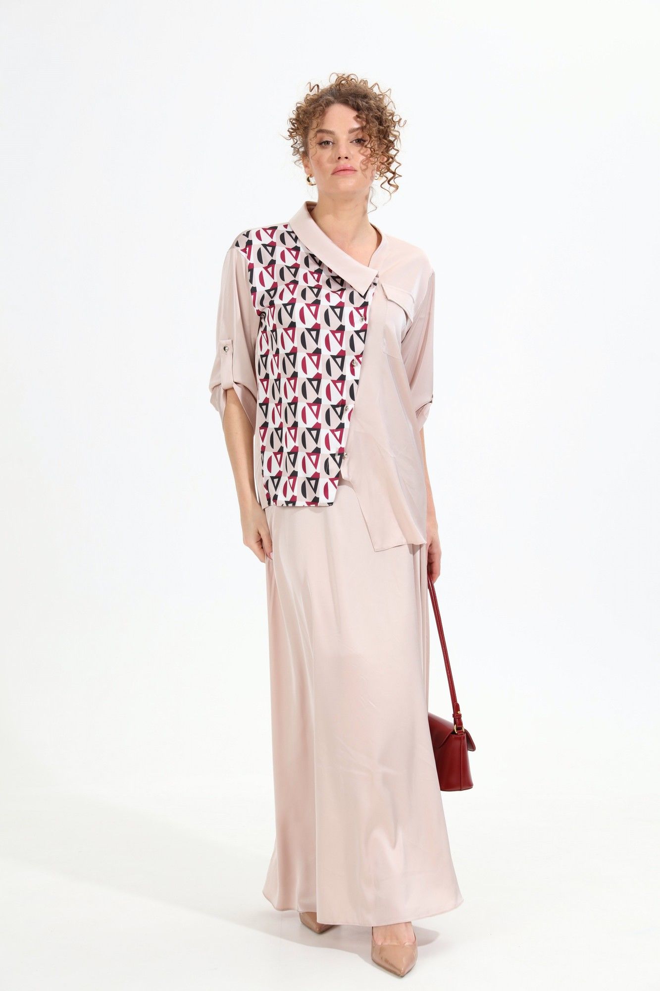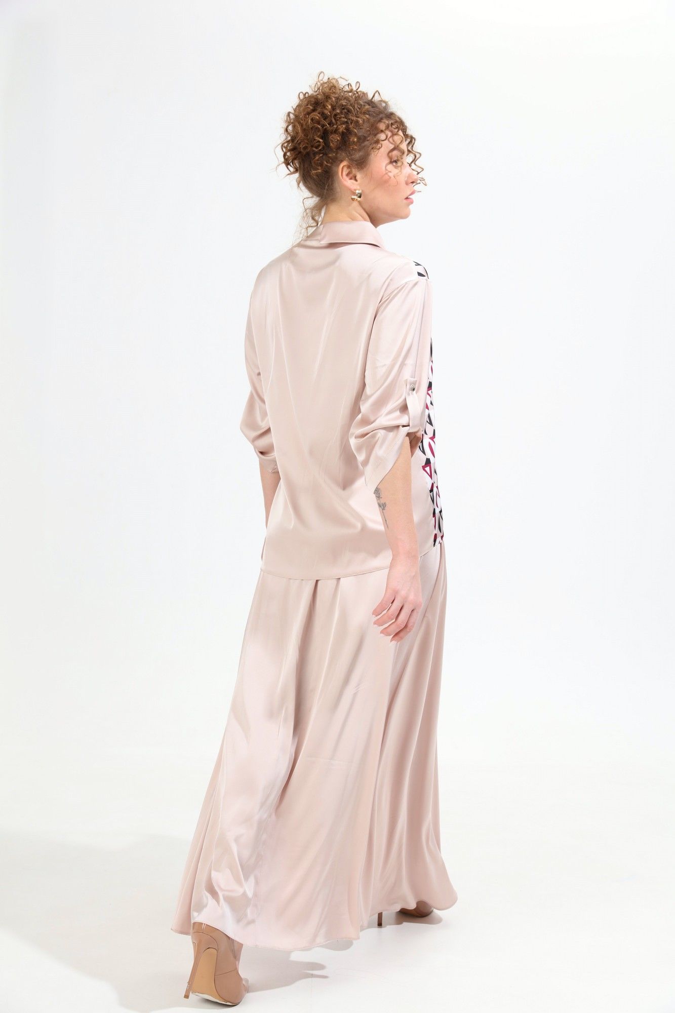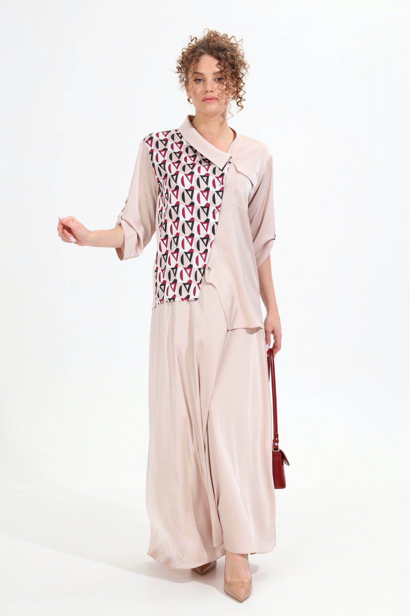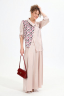 Костюм двухпредметный: состоит из жакета и юбки. Жакет рубашечного типа прямого силуэта с асимметричным низом. Рукав втачной со спущенной линией плеча, фиксируется на пату. Застежка центральная на петли и пуговицы, смещённая по косой. На левой полочке накладной карман с клапаном. Воротник отложной на стойке до половины спинки. Юбка - солнце макси с узким поясом. В боковых швах расположены карманы. Застёжка на петлю и пуговицу и молнию по спинке.