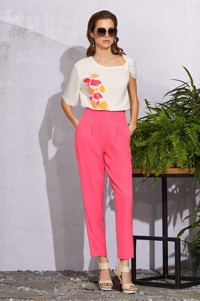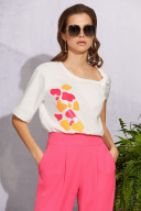 Цвет-“экрю” Стильный ассиметричный джемпер свободного кроя из тонкого трикотажного хлопка с эластаном, в стиле Casual. Круглый вырез горловины, с притачной планкой, чуть спущенная линия плеча. Спинка прямая. Дизайнерский принт ”PATTY”. Отличный вариант на каждый день. Длина изделия 62 см