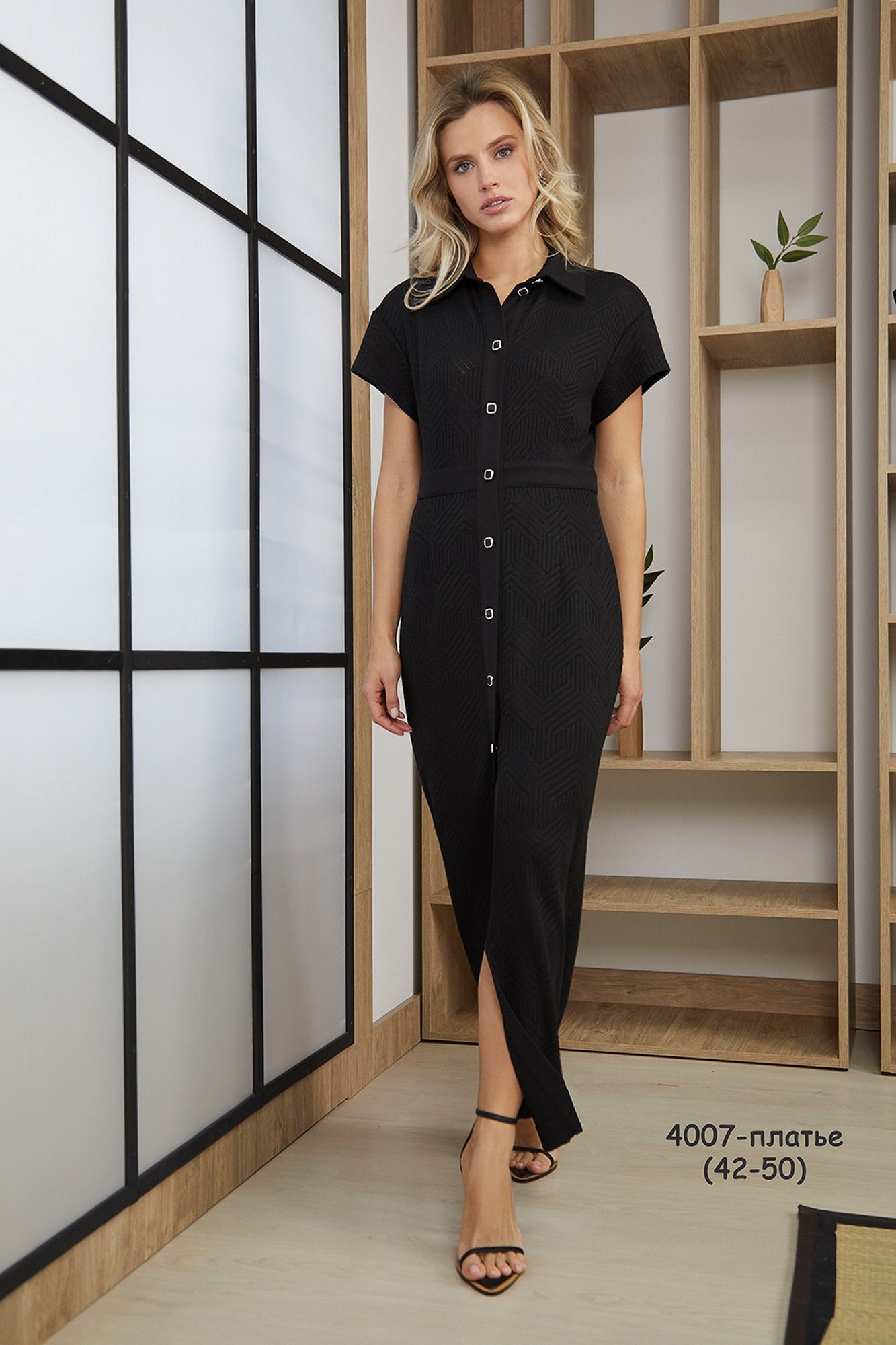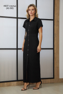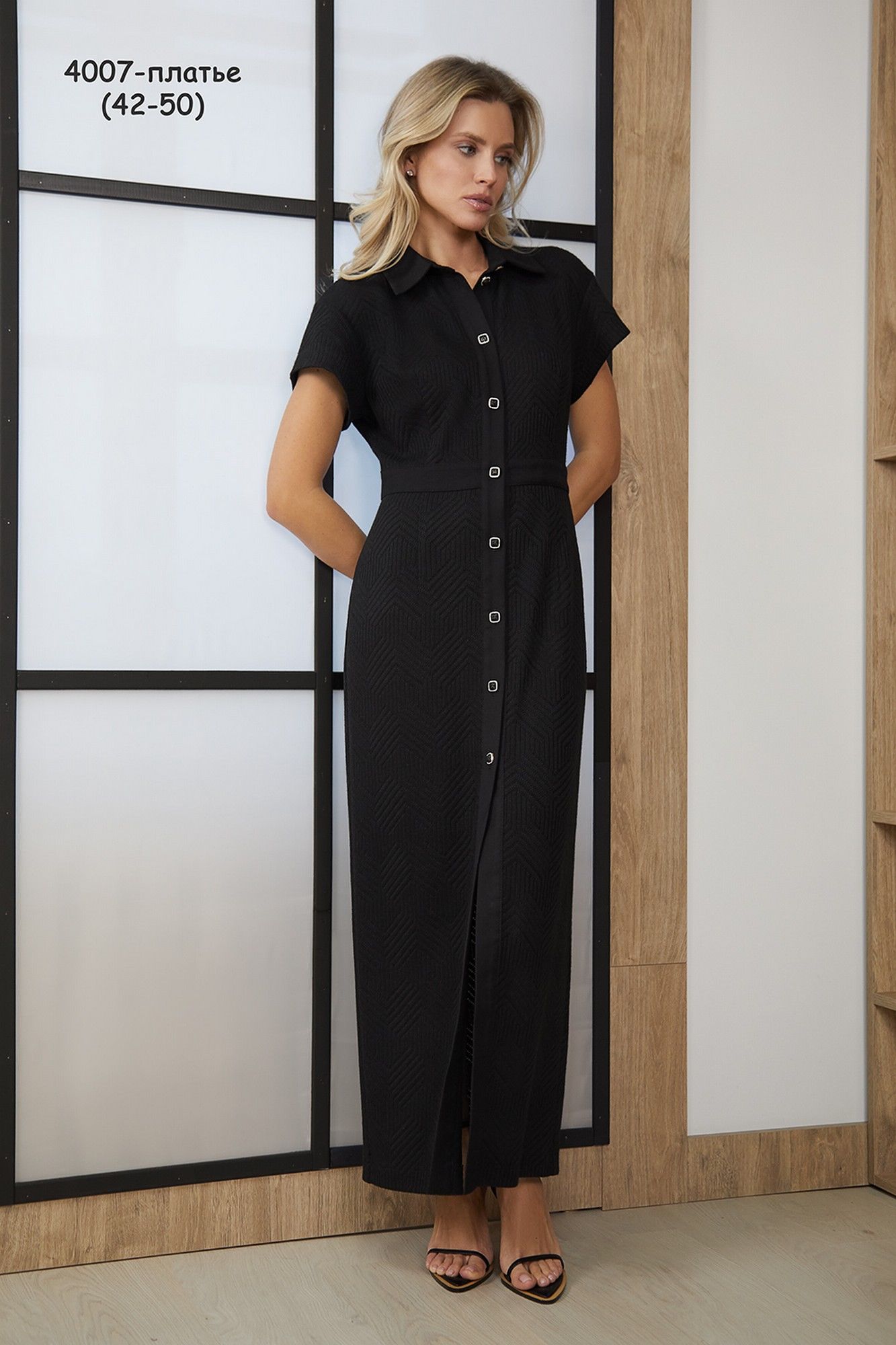 Цвет - “бархатная вуаль” Платье выполнено из трикотажного вискозного полотна. Машинная вязка. Изделие полуприлегающего силуэта, длиной маxi. По центру платья отрезная планка , выполнена из отделочной ткани. Застежка центральная на петли и пуговицы. По линии талии отрезная деталь из отделочной ткани. По спинке и полочке изделия нагрудные и талиевые вытачки. Спущенная линия плеча, Короткий рукав-“крылышко”. Рубашечный воротник.