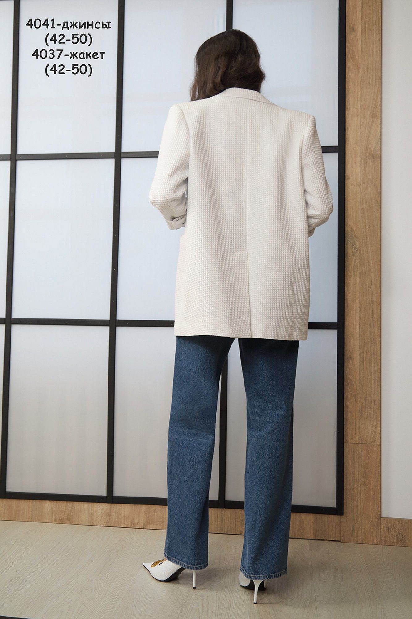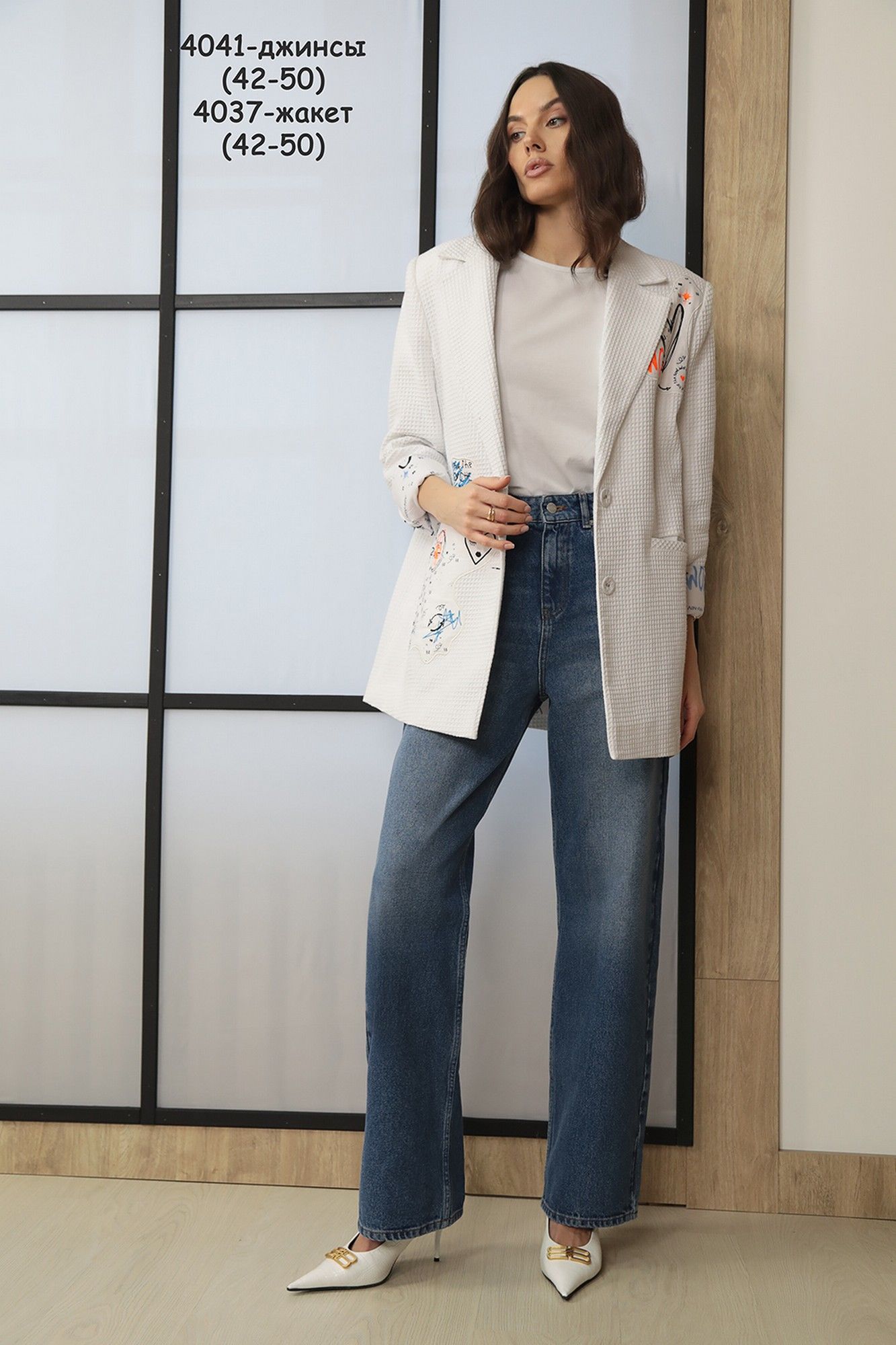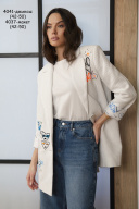Цвет - “экрю” Стильный удлиненный жакет прямого силуэта на вискозной авторской подкладке. Изделие с центральной бортовой застежкой на пуговицы. Воротник пиджачного типа. На полочках нагрудные вытачки, прорезные карманы. Борта прямые. Спинка со средним швом и шлицей. Плечо удлиненное. Рукав длинный со шлицей и пуговицами. Дизайнерские принты являются изюминкой данного жакета.