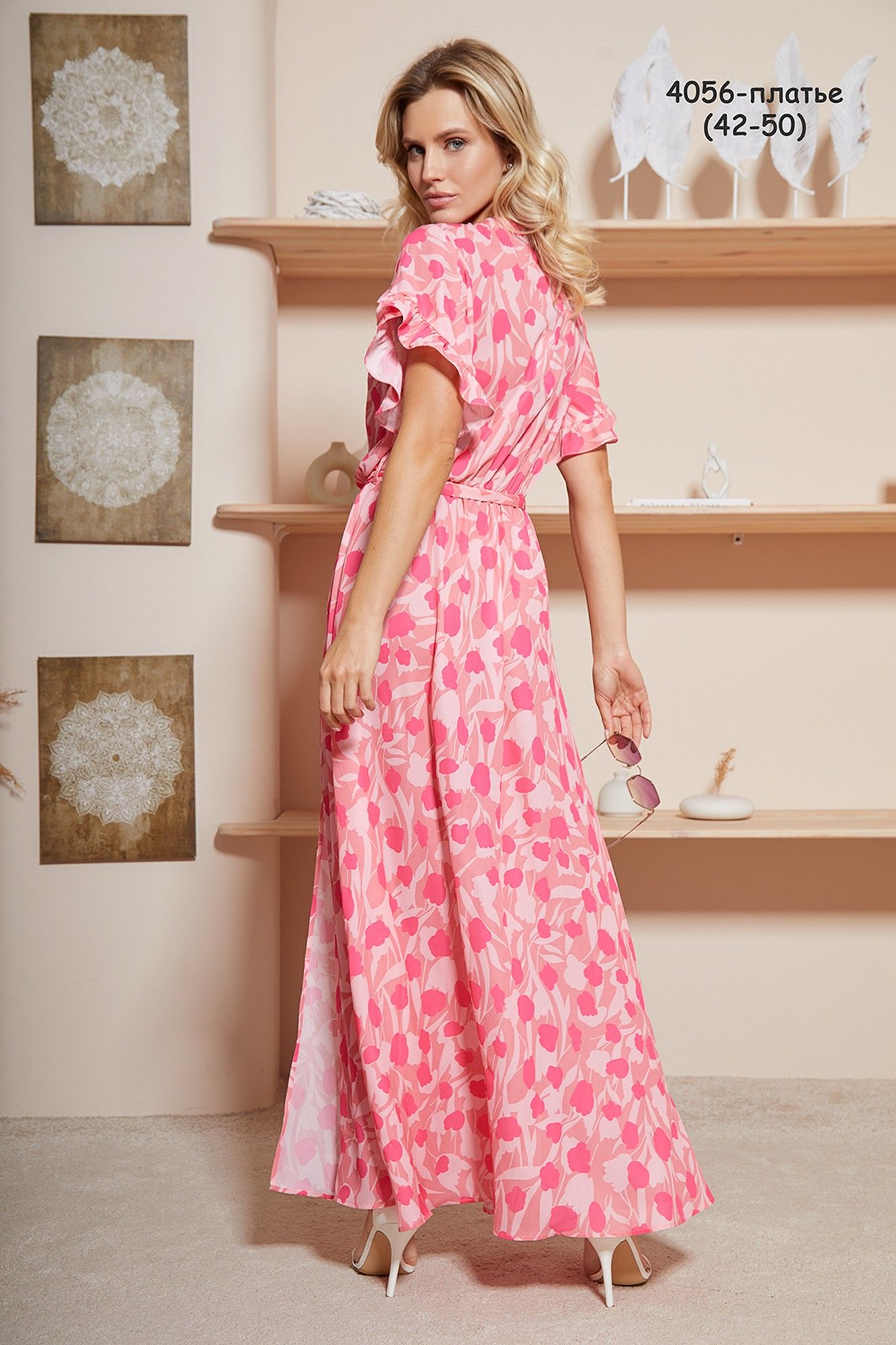 Цвет- “Вереск” Стильное шифоновое платье, длина макси. Изделие отрезное по линии талии. Застежка центральная, до линии подреза, на петли пуговицы. Низ платья на резинке с декоративным разрезом. Спинка прямая. Горловина круглая. Сложный комбинированный покрой рукава. В подрез и по низу рукава вставлены декоративные воланы, которые собраны на сборку. В комплекте съемный пояс из основной ткани.