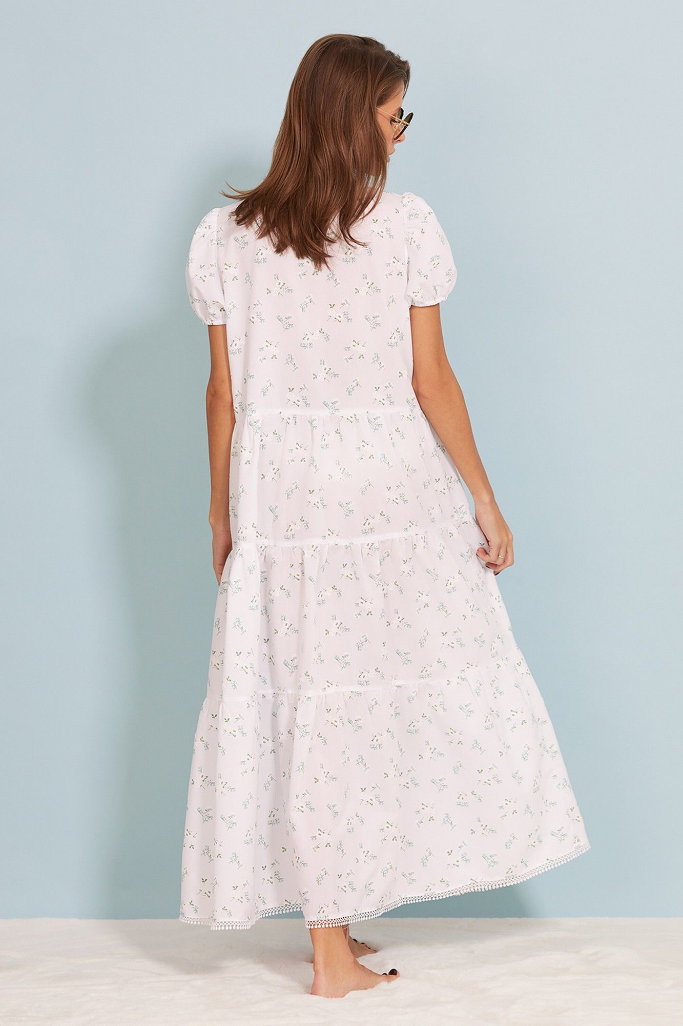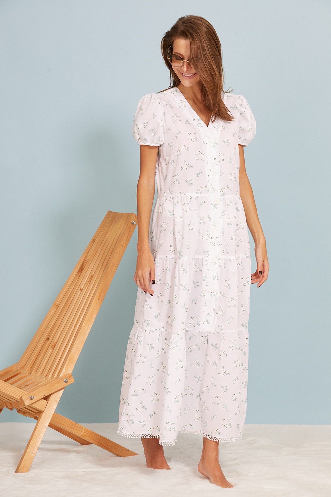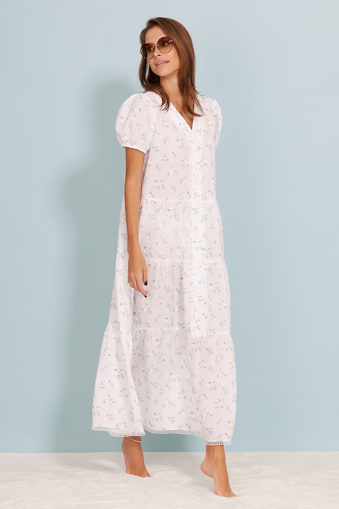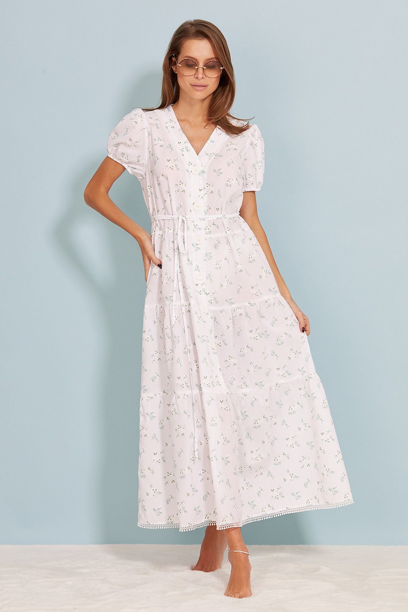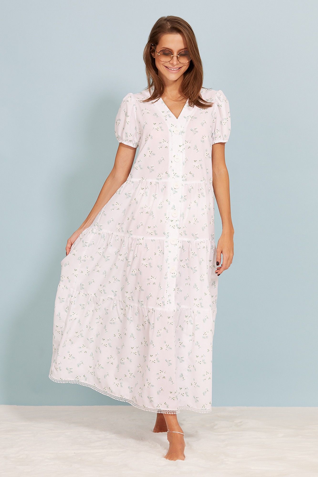 Изделие без подкладки Стильное платье из хлопка. Длина maxi. Свободное в талии и бедрах в духе минимализма. Платье состоит из 3-ех мягких воланов, которые собраны на небольшую сборку. Изделие с центральной бортовой застежкой до нижнего волана и застегивается на петли и пуговицы.V-образная горловина. Рукав втачной короткий. Сверху и снизу рукав собран на небольшую сборку. Низ рукава на манжете, в которую вставлена резинка. Поясок в комплекте.