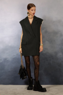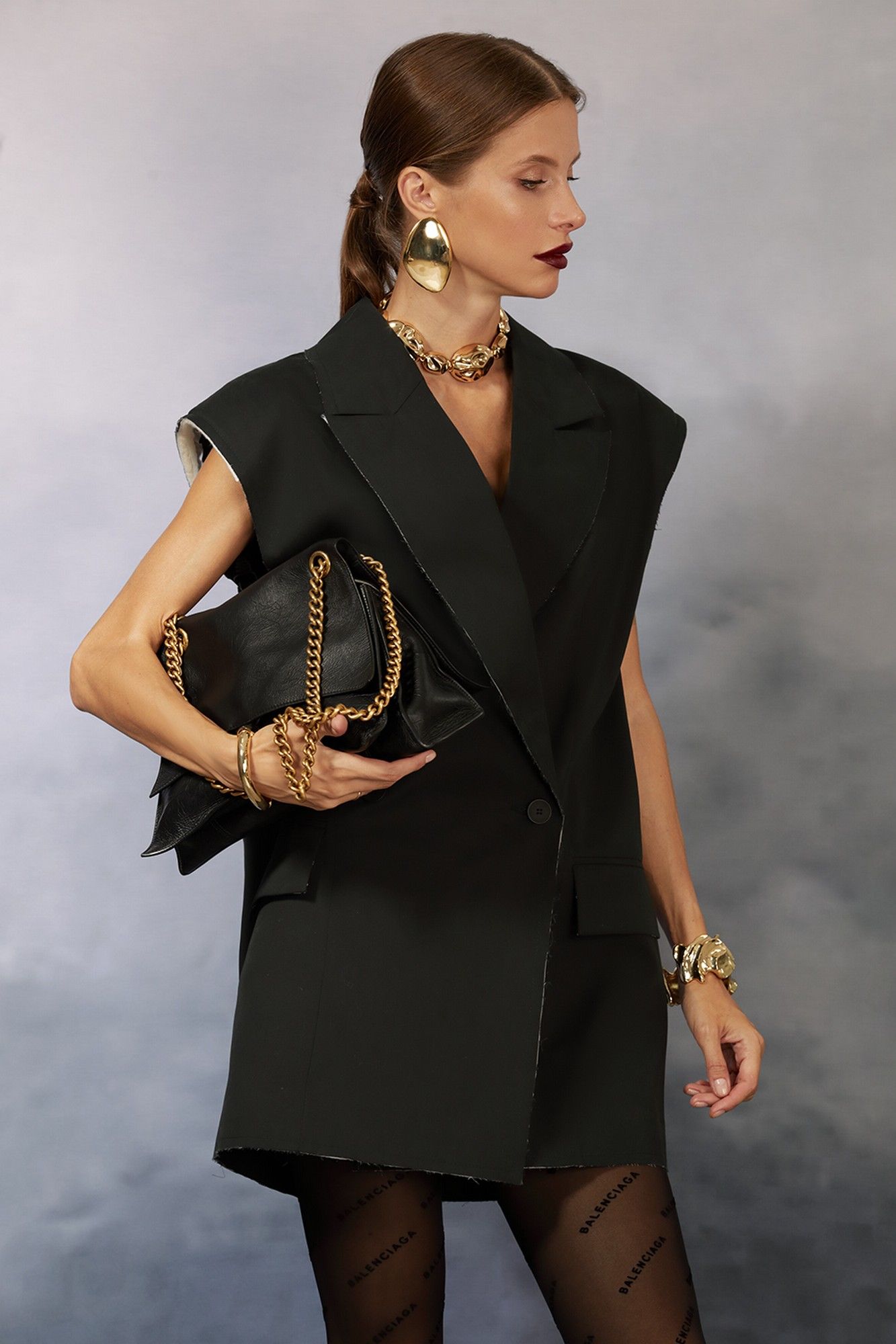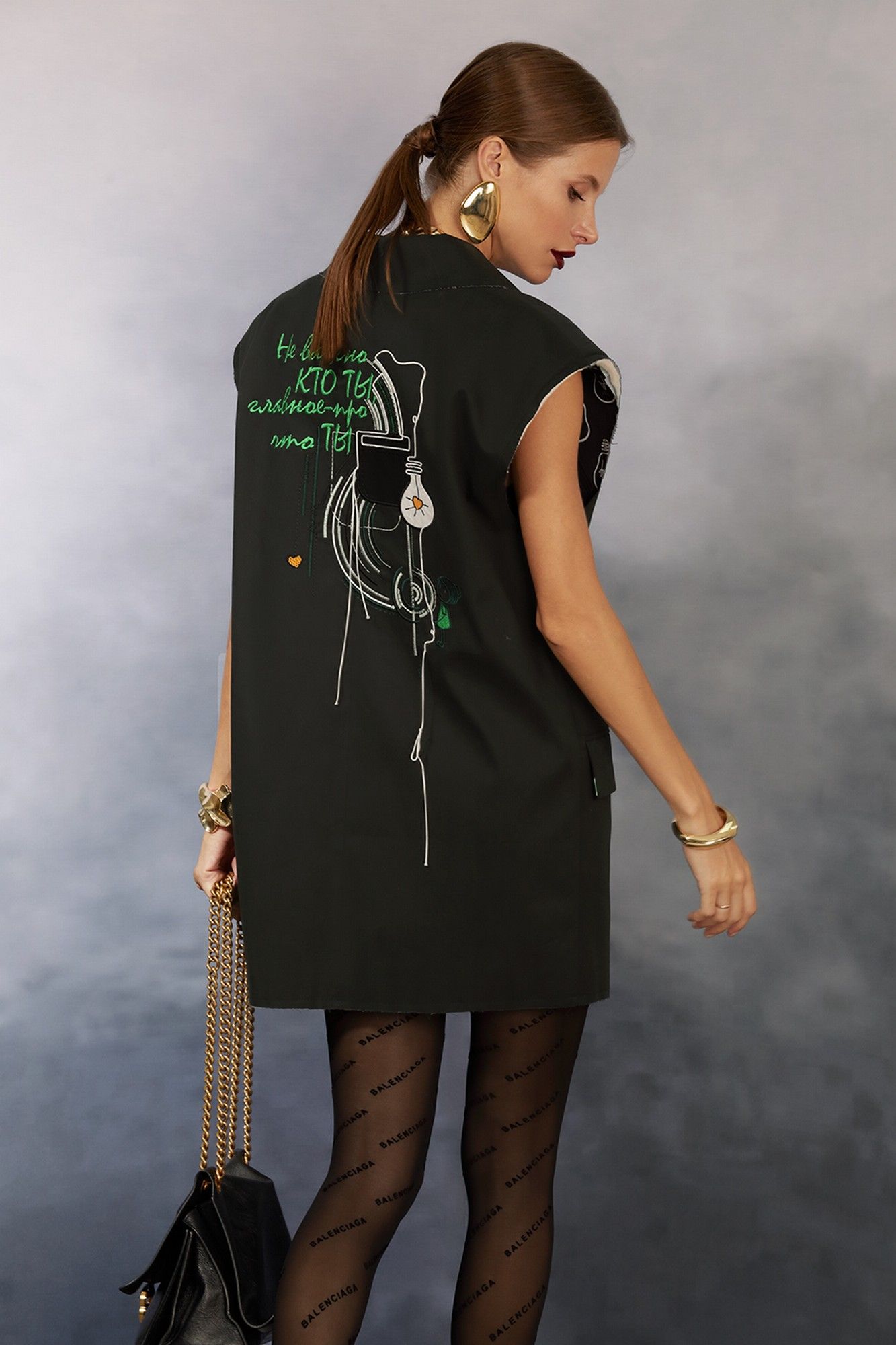 Цвет -“Брезентово -серый “ Мега стильный жилет прямого силуэта, выполнен из плотной хлопковой ткани на авторской вискозной подкладке. Жилет прямой, выполнен по типу “мужской пиджак”. Усиленное удлиненное плечо, на очень высоких плечиках. Изделие с двубортной застежкой на 2 петли и пуговицы. Воротник пиджачного типа. На полочках нагрудные вытачки, прорезные карманы в рамку и клапаны. На левой полочке декоративный прорезной карман с листочкой. Борта прямые. Спинка прямая с авторской вышивкой. Глубокие необработанные проймы. Низ изделия, отлет воротника и лацканы имеют необработанный край. Главный тренд сезона осень-зима 2024/2025