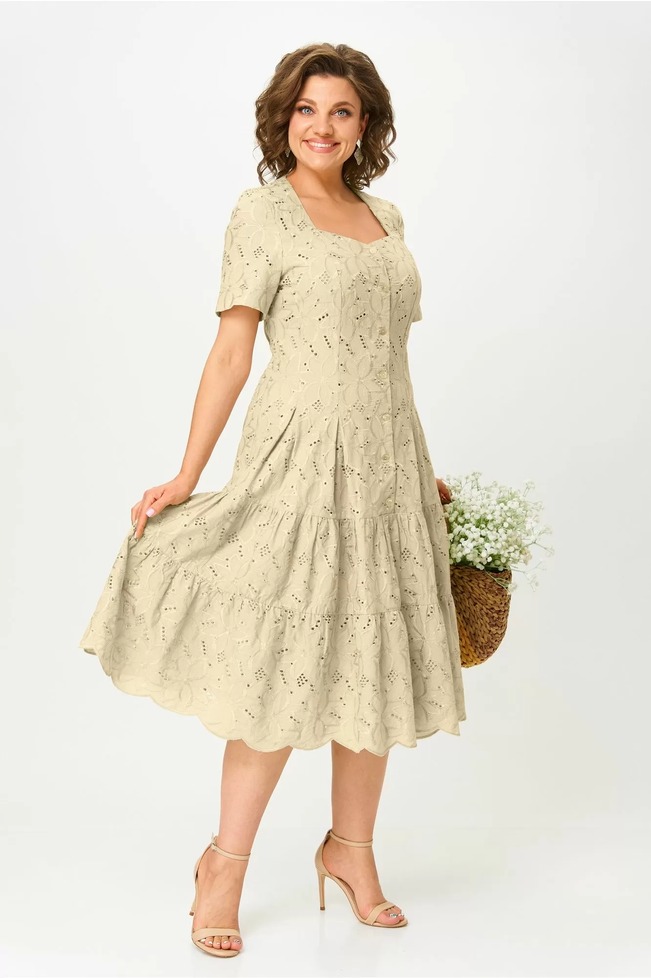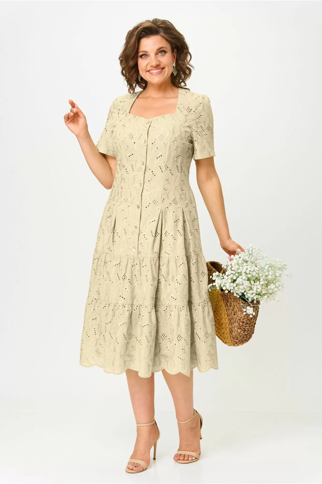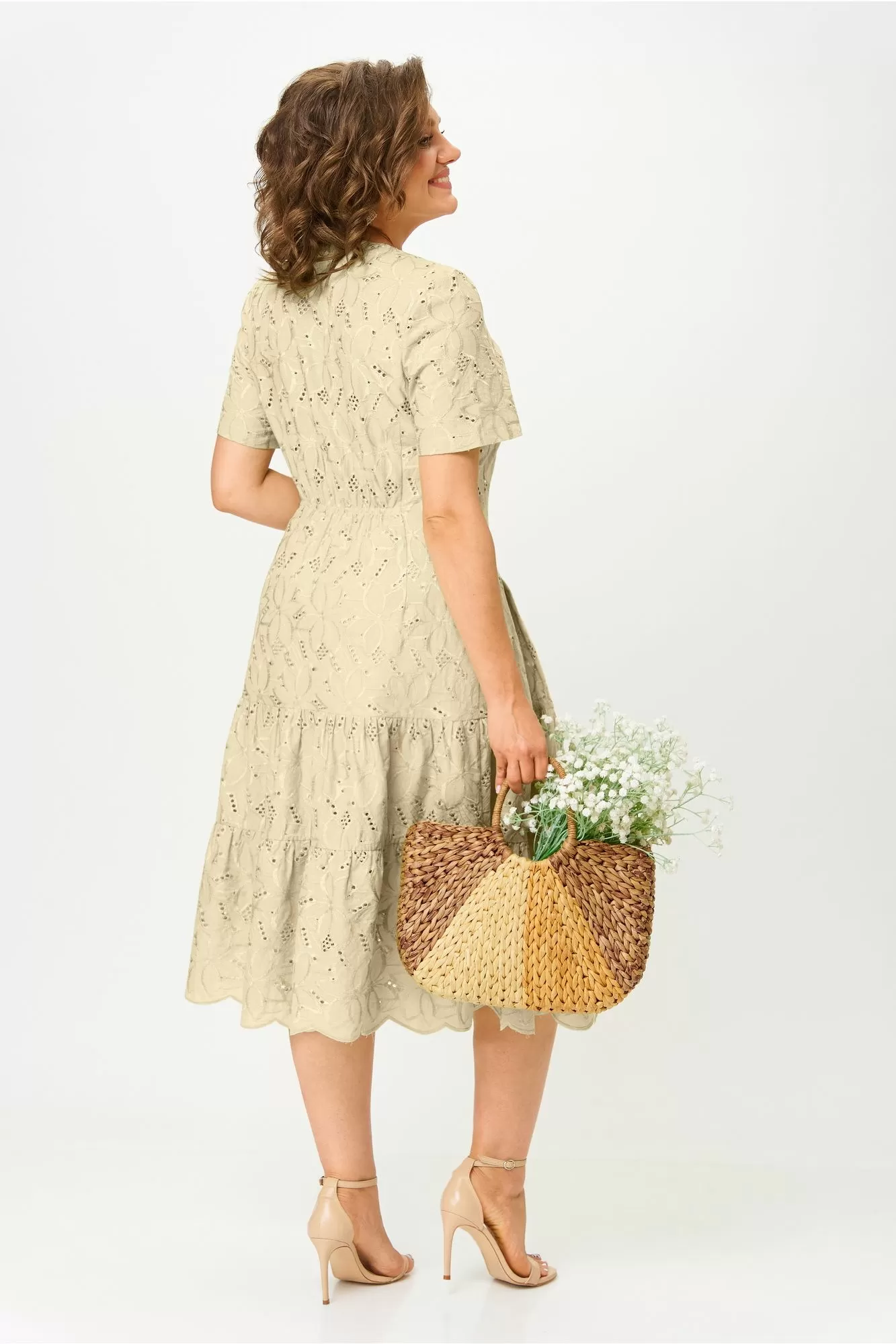 Платье женское полуприлегающего силуэта, с застежкой на петли-пуговицы до волана. По переду фигурный вырез и по два вертикальных рельефа, переходящих во встречные складки. Спинка с талиевыми вытачками, между которыми настрочена резинка. К платью пришиты два волана со сборкой, нижний имеет фигурный низ. Рукав втачной, короткий.