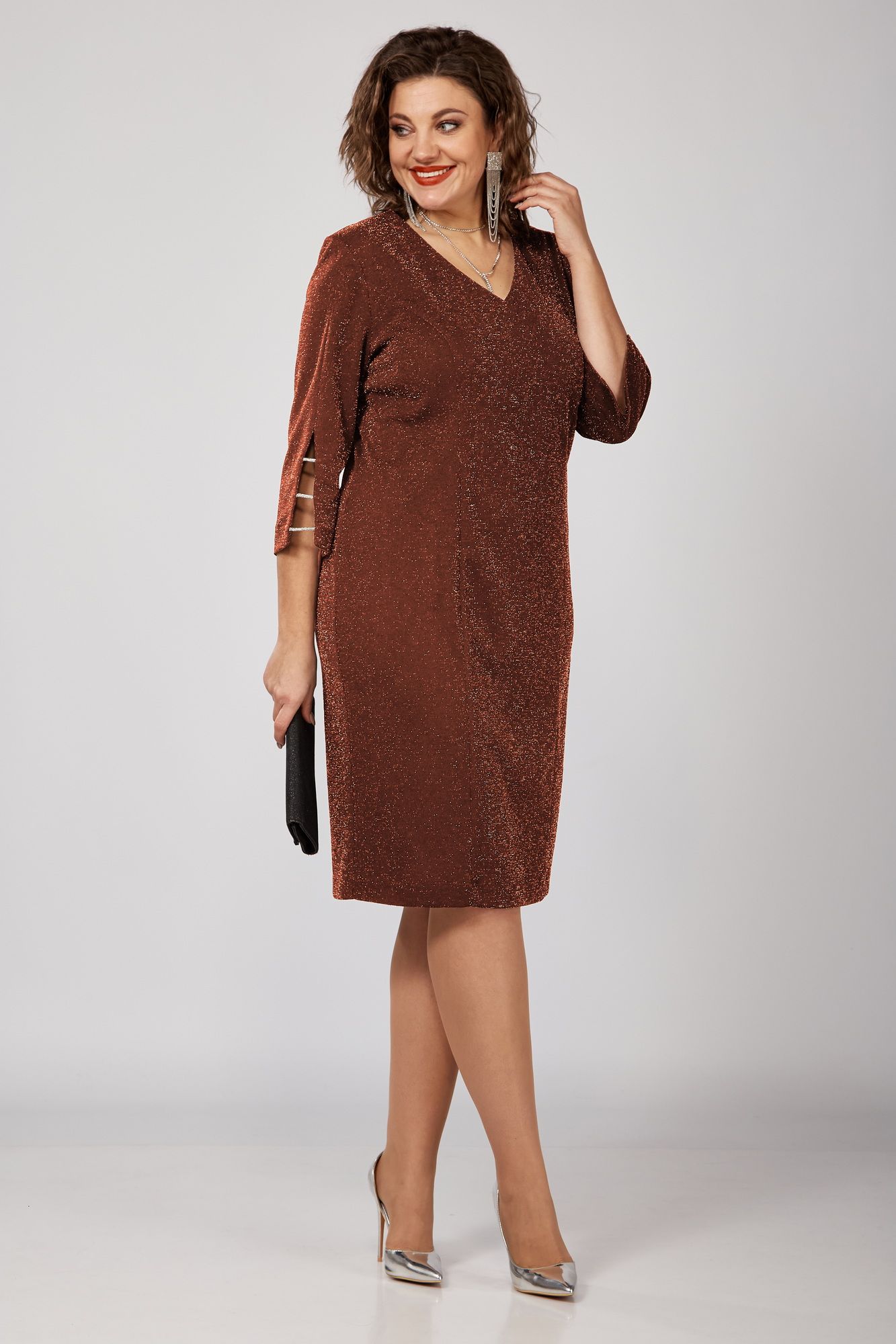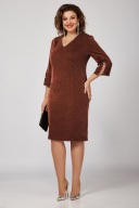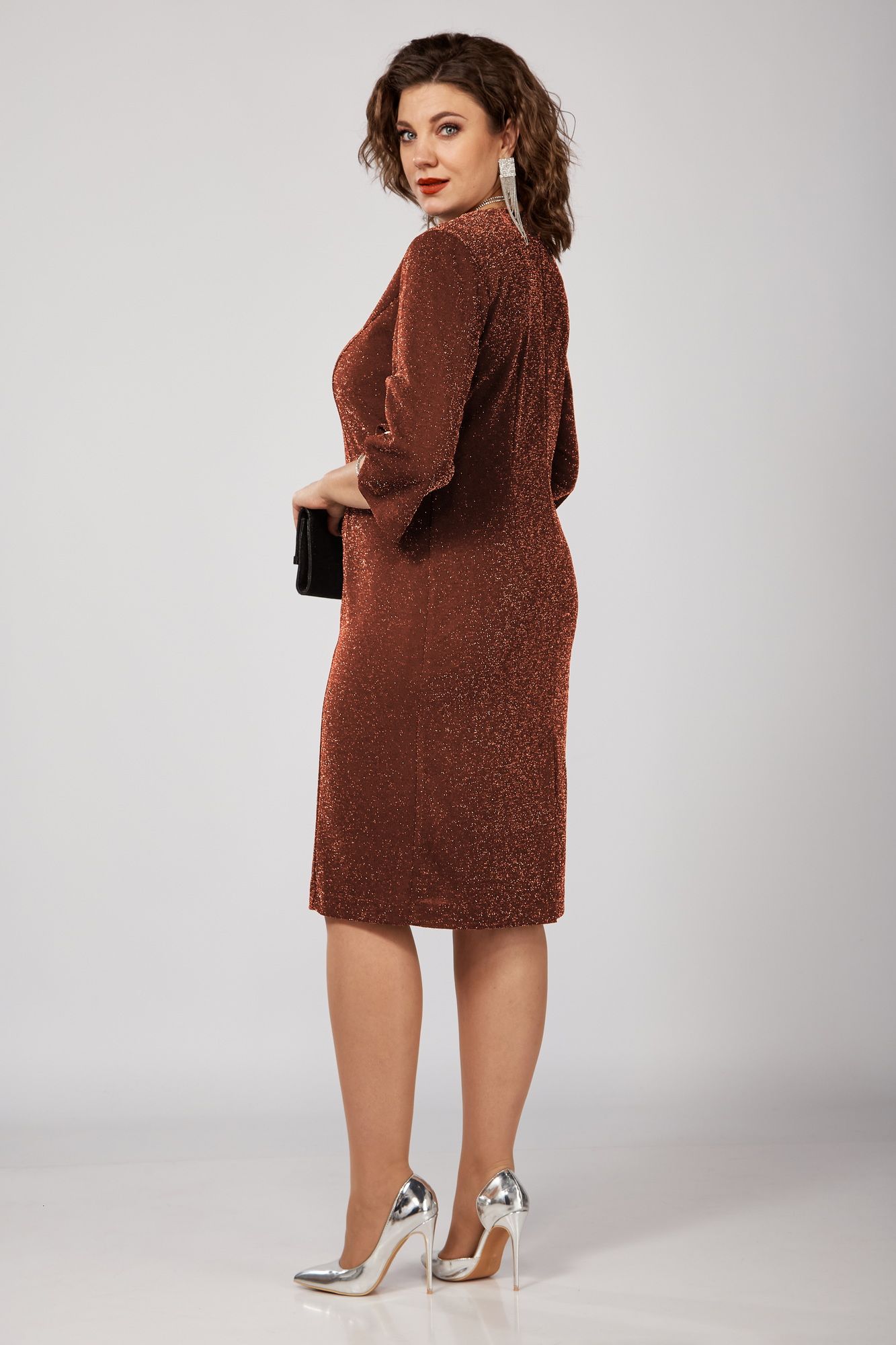 Платье полуприлегающего силуэта втачного покроя. Платье выполнено из трикотажного полотна с люриксовой нитью. Горловина V-образной формы. На переде расположены вертикальные рельефы, идущие из проймы. Спинка со средним швом, в котором расположены молния и шлица, так же на спинке расположены талиевые вытачки. Рукава ¾, к низу расширены, с декоративной тесьмой. Ширина изделия на уровне глубины: 52р – 54см, 54р – 56см, 56р – 58см, 58р – 60см, 62р – 64см. Длина по среднему шву спинки: 52р – 102см, 54р – 102см, 56р – 102см , 58р – 104см, 60р –104см, 62р – 104см Ширина спинки: 52-56р – 40,5см, 58-62р – 43,5см. Ширина плеча: 52-56р – 11,5см, 58-62р – 43,5см. Ширина рукава под проймой: 52р – 20см, 54р – 21см, 56р – 21см, 58р – 22см, 60р – 23см, 62р – 24см. Длина рукава: 46 см