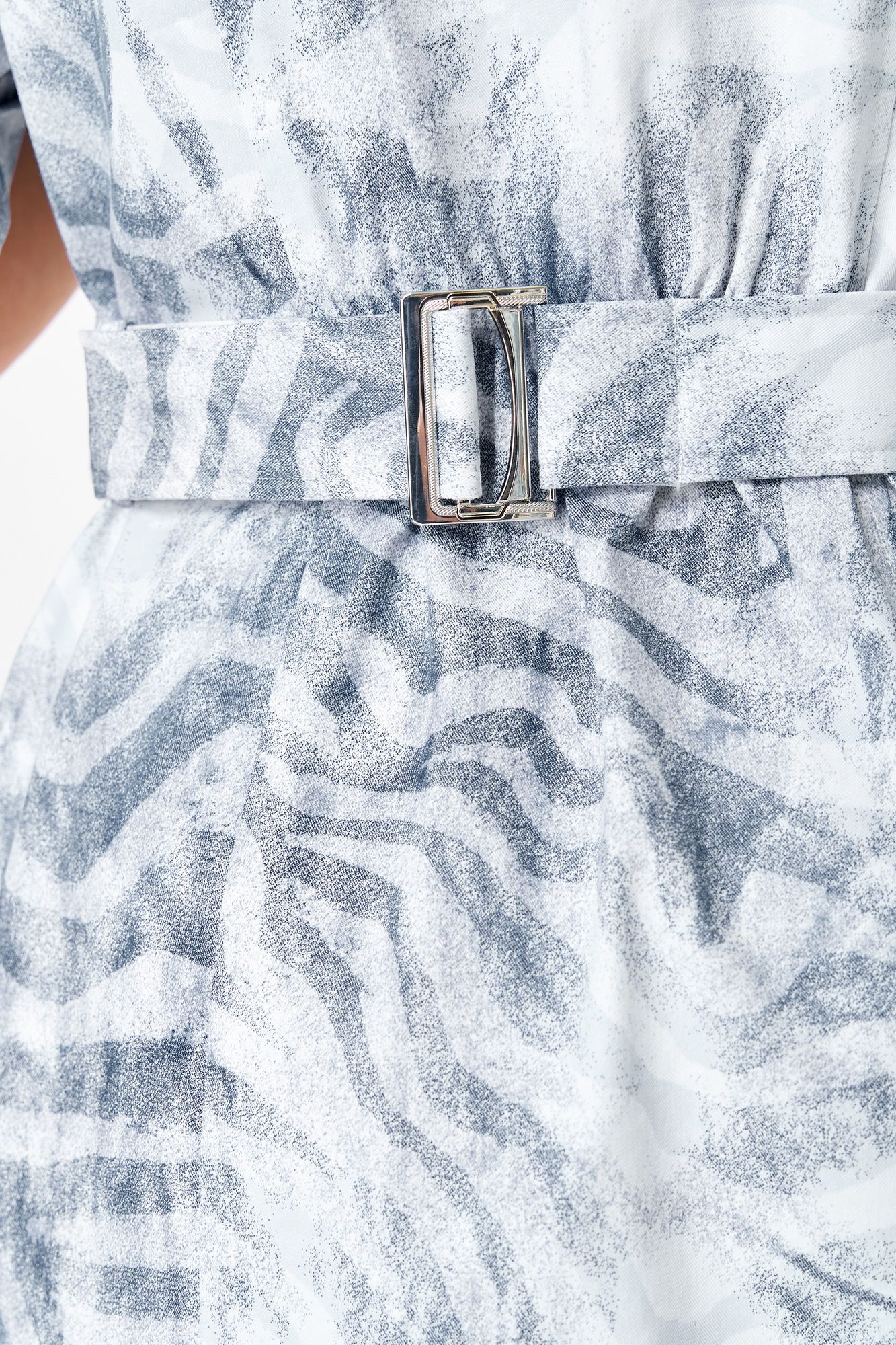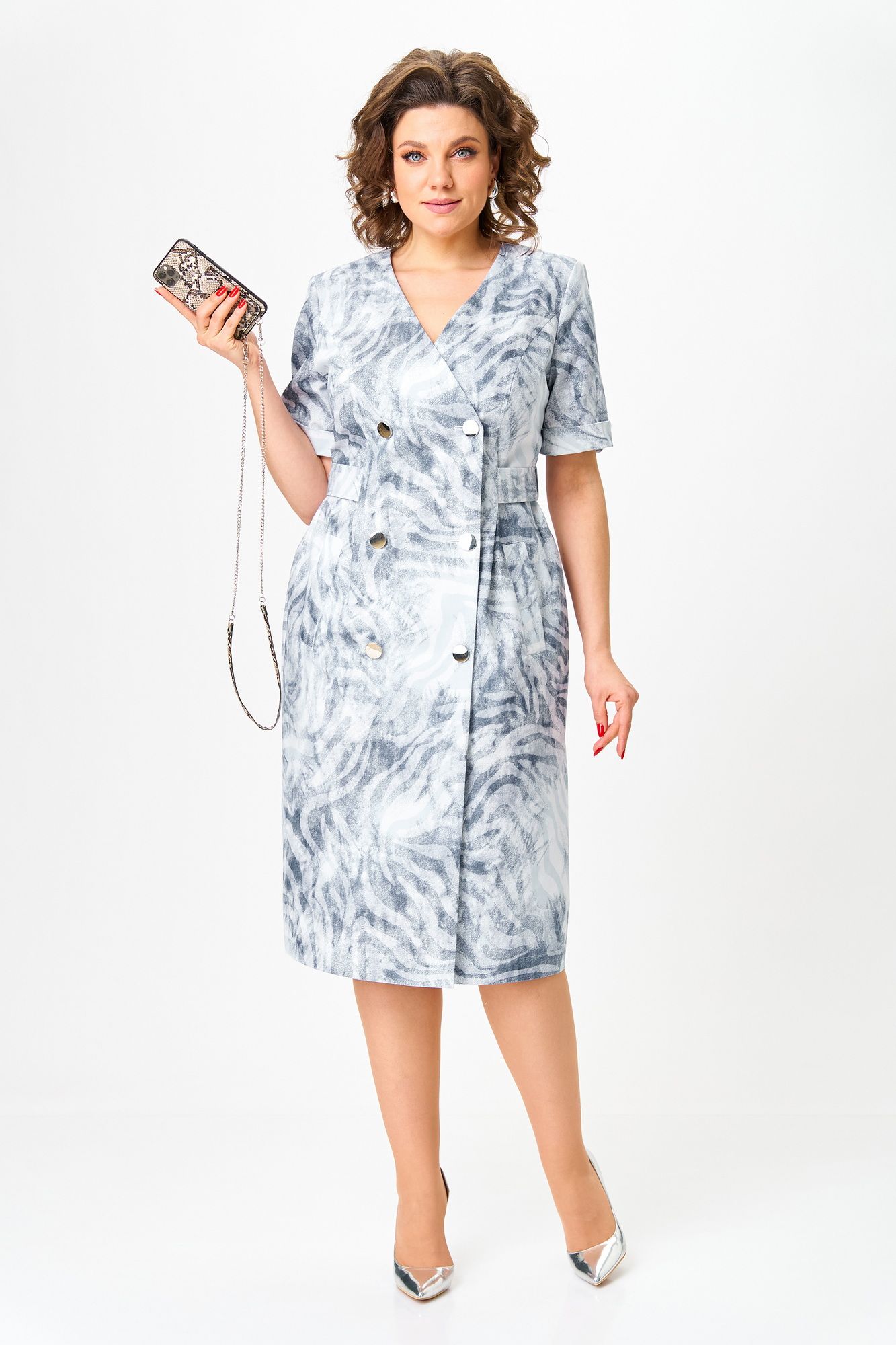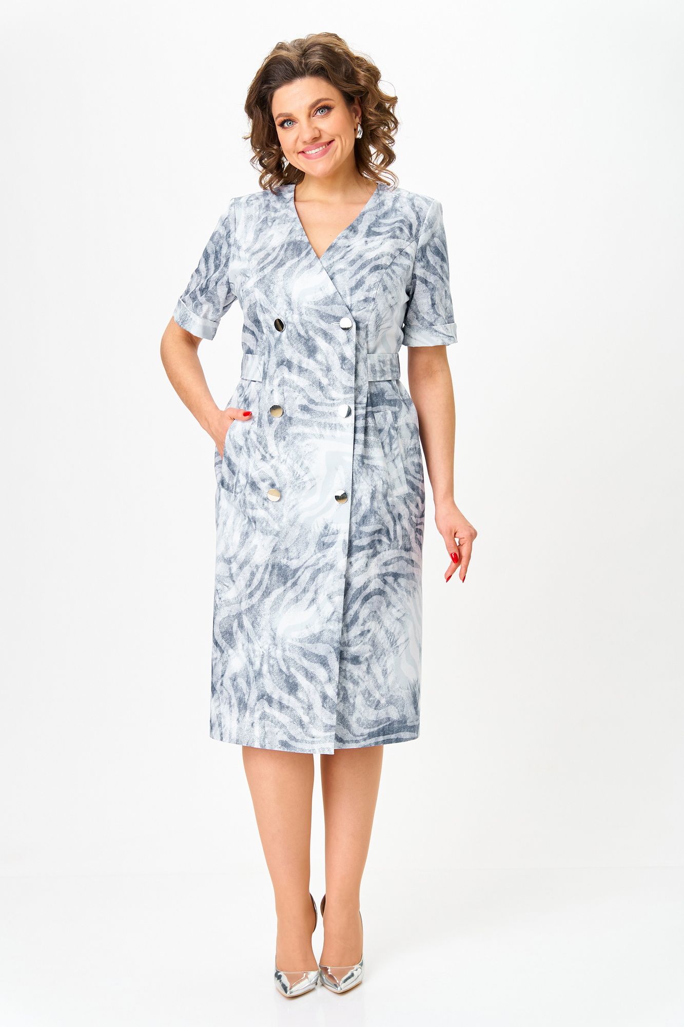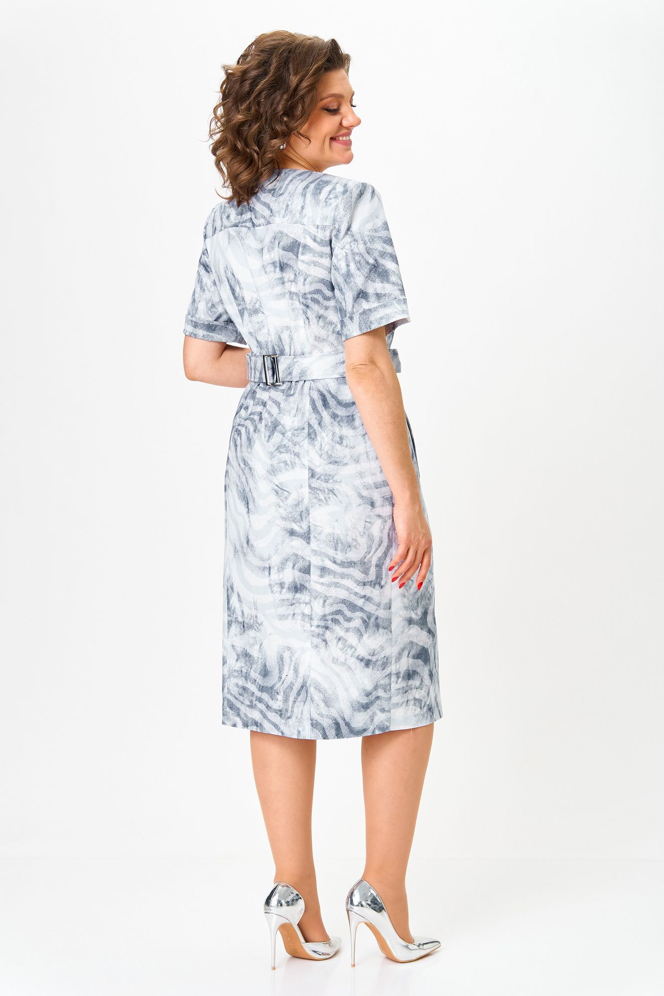 Платье женское полуприлегающего силуэта со спущенным плечом, с двубортной застежкой на петли-пуговицы. Спинка с кокеткой и двумя рельефами, центральная часть стянута резинкой в области талии. По переду прорезные карманы с листочкой, также рельефные линии до талии, в которые вставлен пояс, фиксирующийся на отделочную пряжку. Горловина выполнена У-образным вырезом. Рукава до локтя с цельнокроеной манжетой. Ширина изделия на уровне глубины: 48р – 52см, 50р – 54см, 52р – 56см; Ширина по линии талии: 48р – 46см, 50р – 48см, 52р – 50см; Ширина по линии бедер: 48р – 56см, 50р – 58см, 52р – 60см; Длина по среднему шву спинки: 110 см; Ширина спинки: 40,5см; Ширина плеча: 11,5 см; Ширина рукава под проймой: 48р – 19см, 50р – 20см, 52р – 21см; Длина рукава (от горловины): 28см.