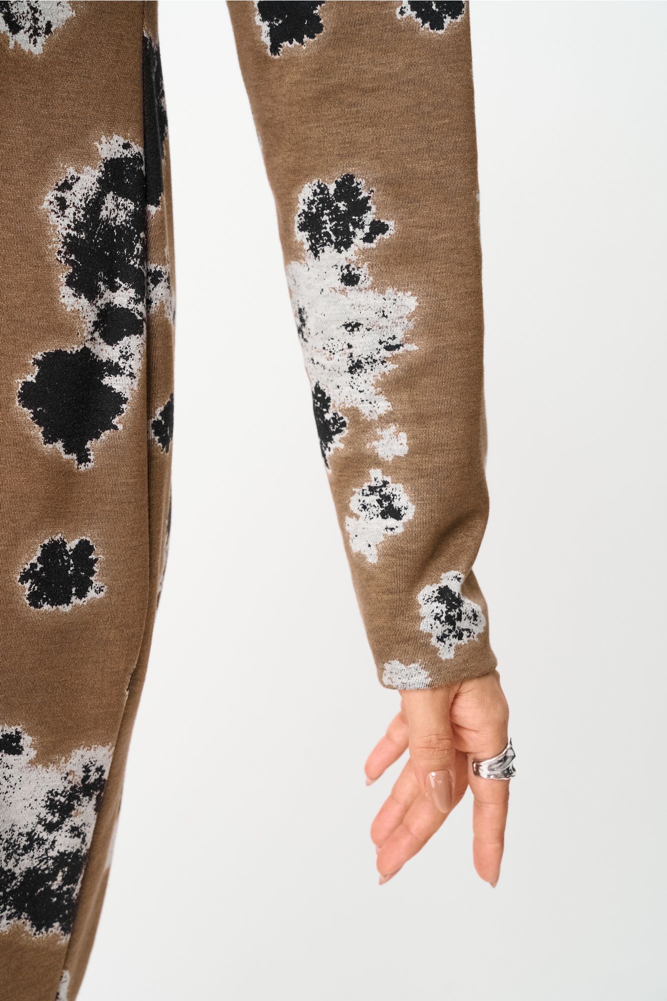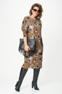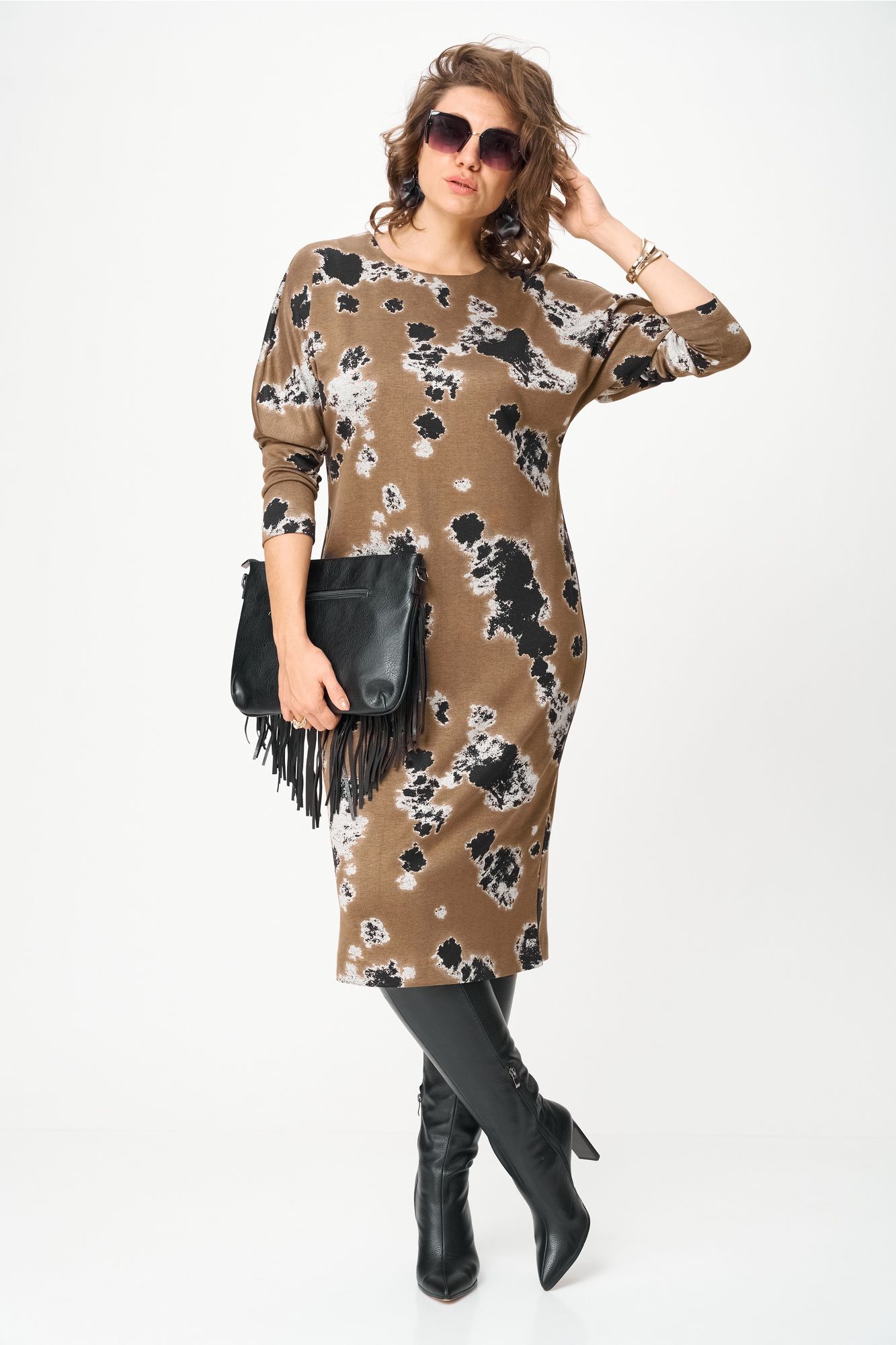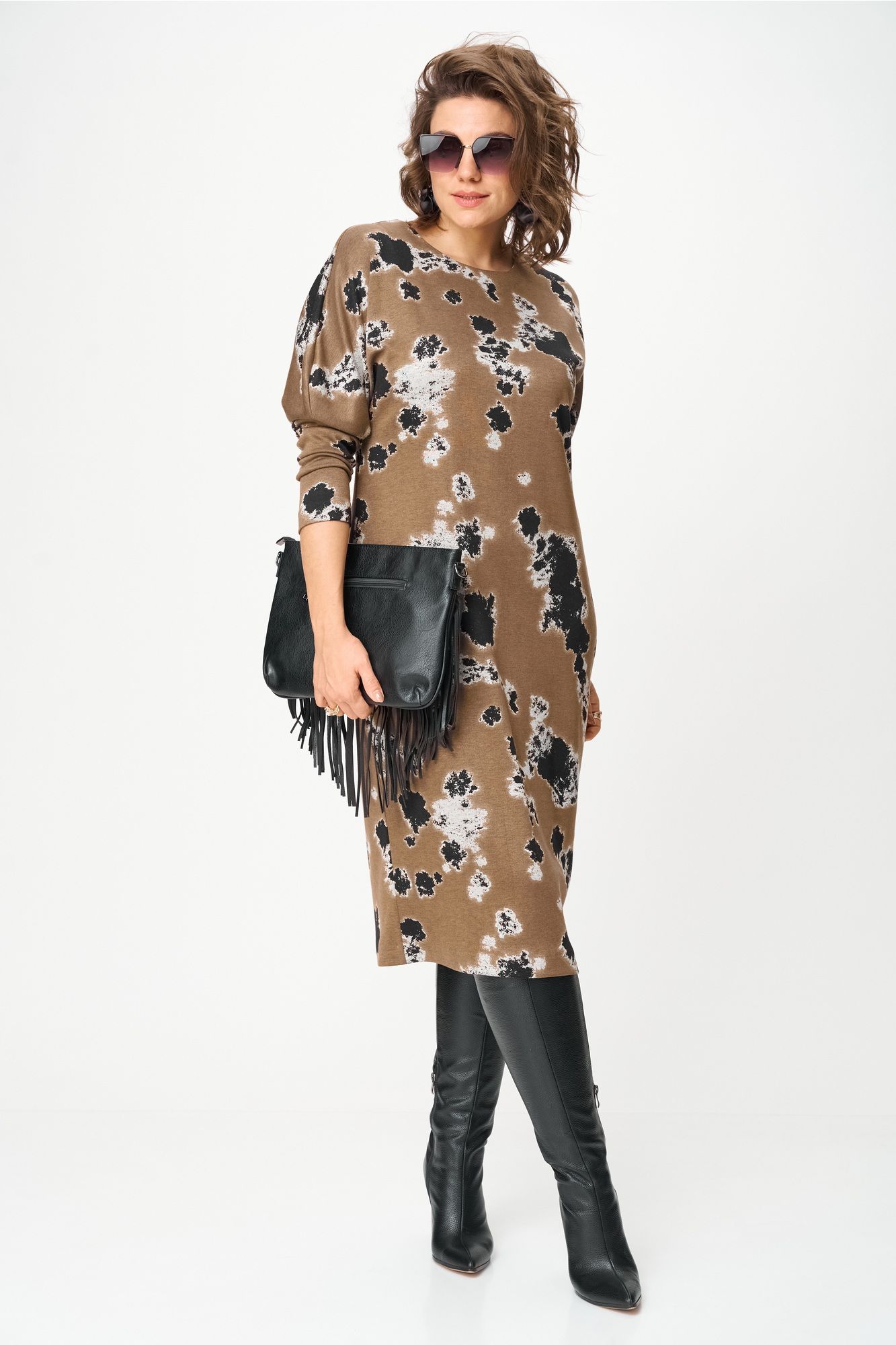 Платье женское полуприлегающего силуэта, выполнено из трикотажного полотна с принтом. Горловина в платье округлой формы, оформлена обтачкой, по спинке застегивается на навесную петлю и пуговицу. Спинка со средним швом, талиевыми вытачками и разрезом. Рукава цельнокроеные с нижней отрезной частью. Ширина изделия на уровне глубины: 46р – 49см, 48р – 51см, 50р – 53см, 52р – 55см, 54р – 57см, 56р – 59см; Ширина по линии бедер: 46р – 50см, 48р – 52см, 50р – 54см, 52р – 56см, 54р – 58см, 56р – 60см; Длина по среднему шву спинки: 46-56р – 110см; Ширина рукава под проймой: 46р – 23см, 48р – 24см, 50р – 25см, 52р – 26см, 54р – 27см, 56р – 28см; Длина рукава: 46-56р – 73см.